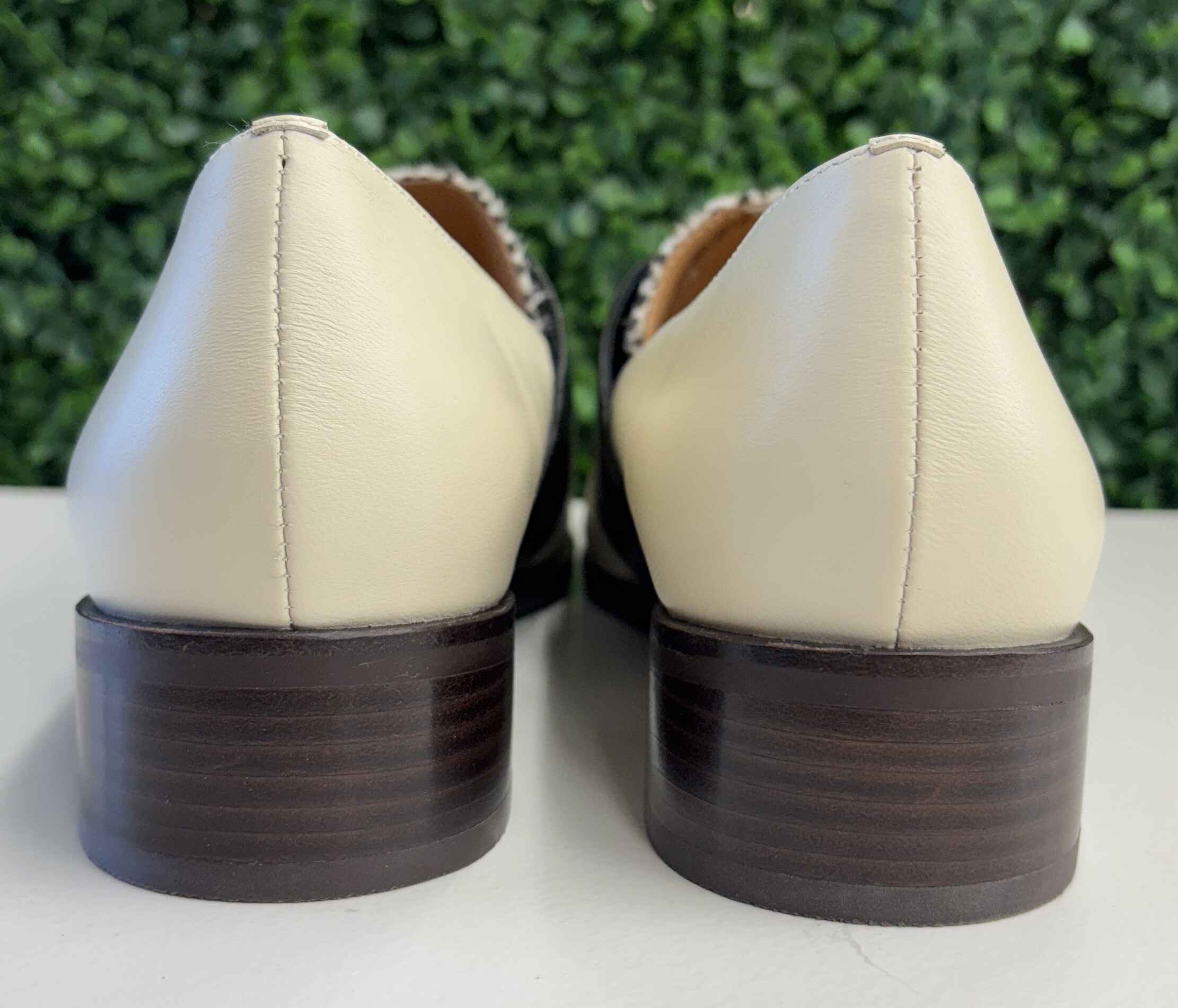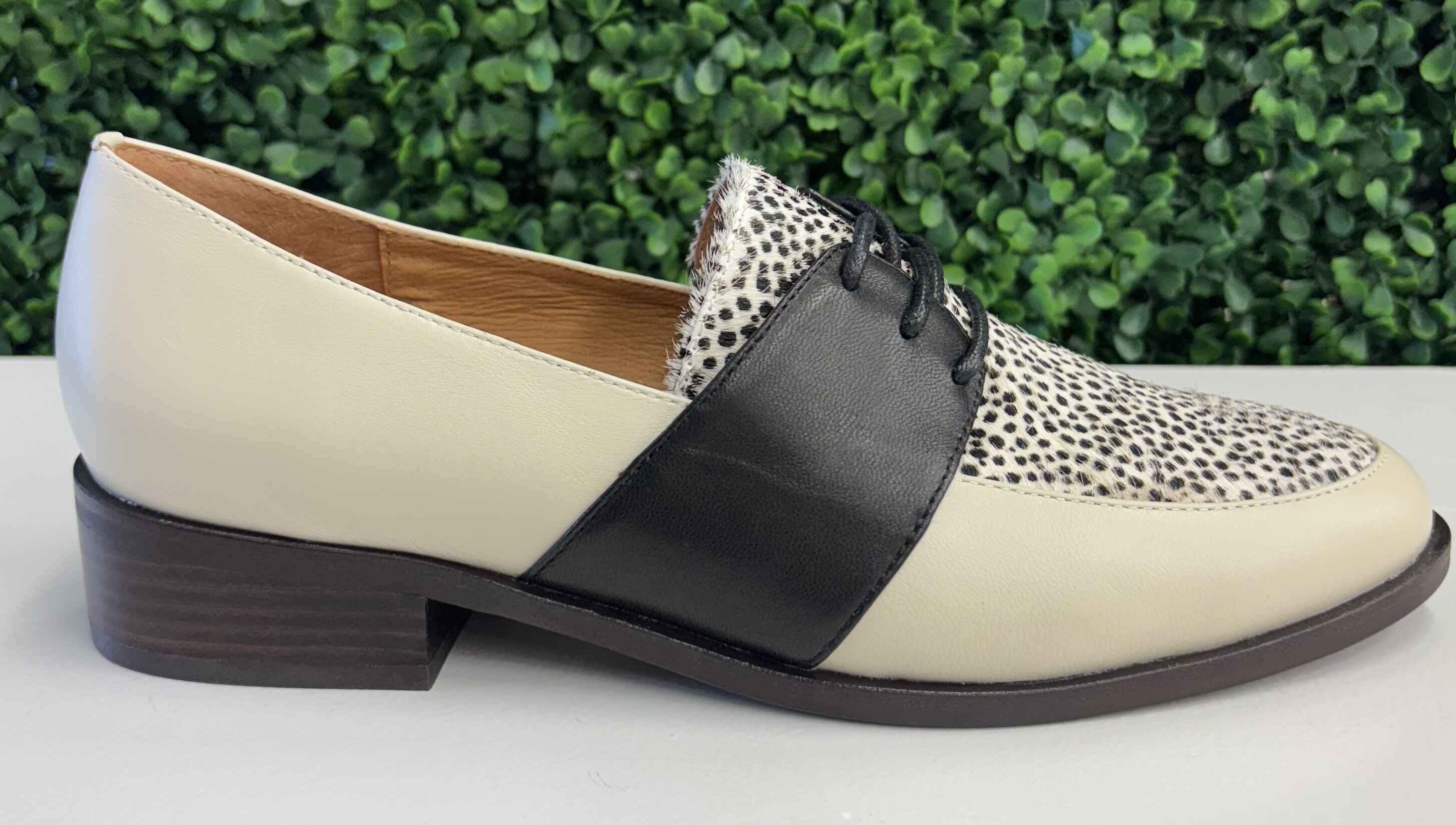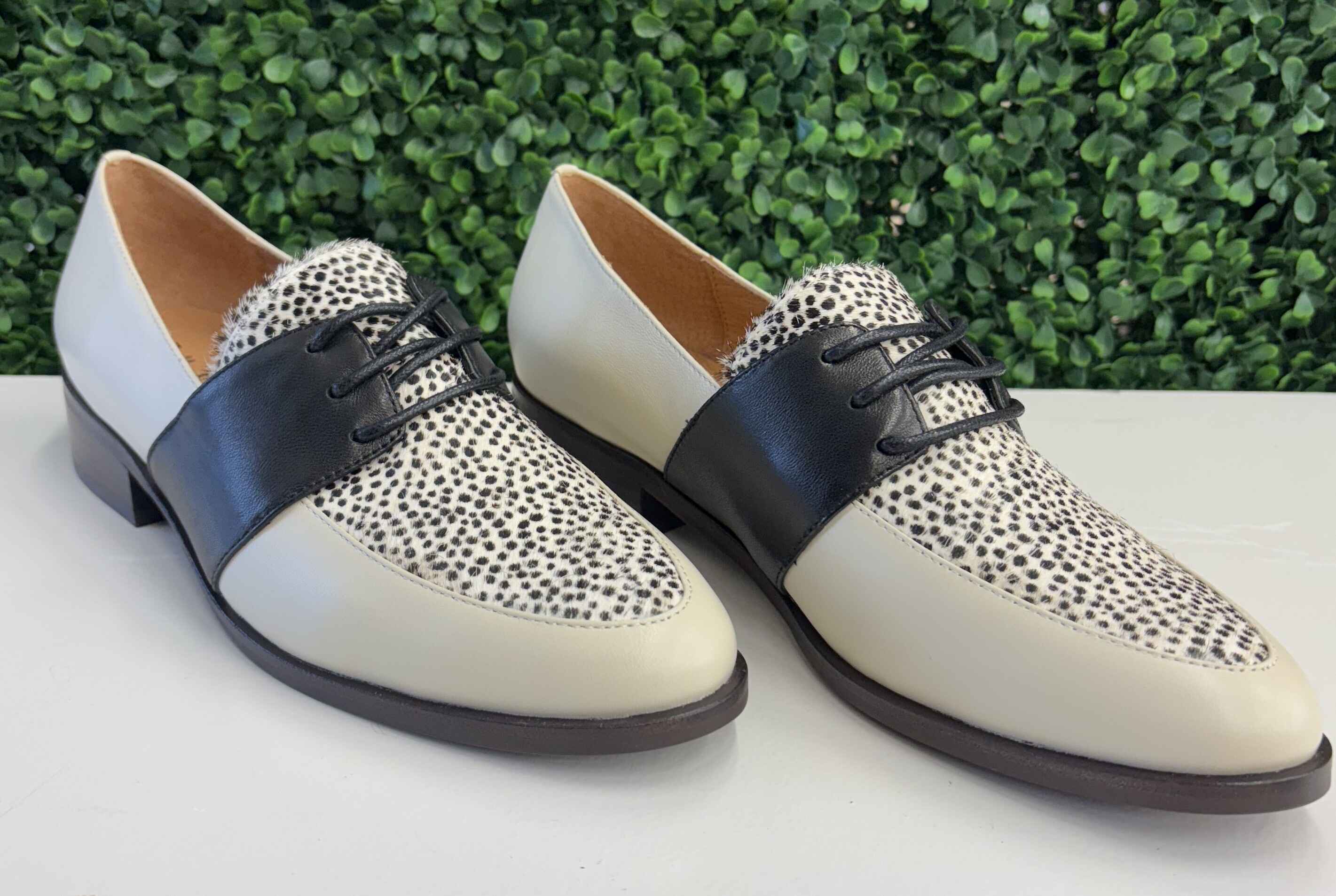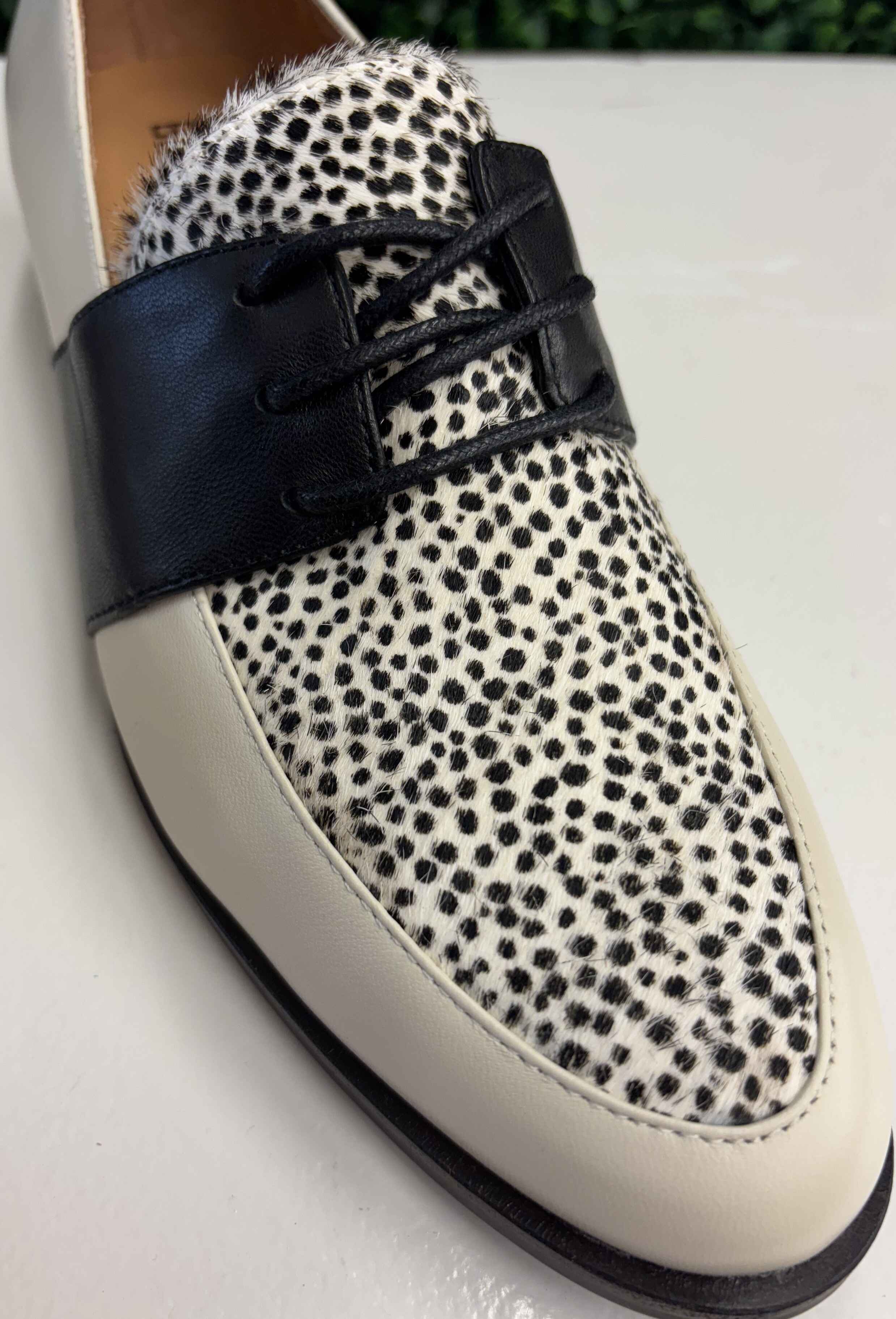 Make a bold statement with these monochrome lace-up shoes. Blending smooth cream leather with a textured animal-print upper and sleek black strap detail, they’re the perfect mix of classic tailoring and modern edge. The low stacked heel adds polish, while the lace-up front ensures a secure and stylish fit.