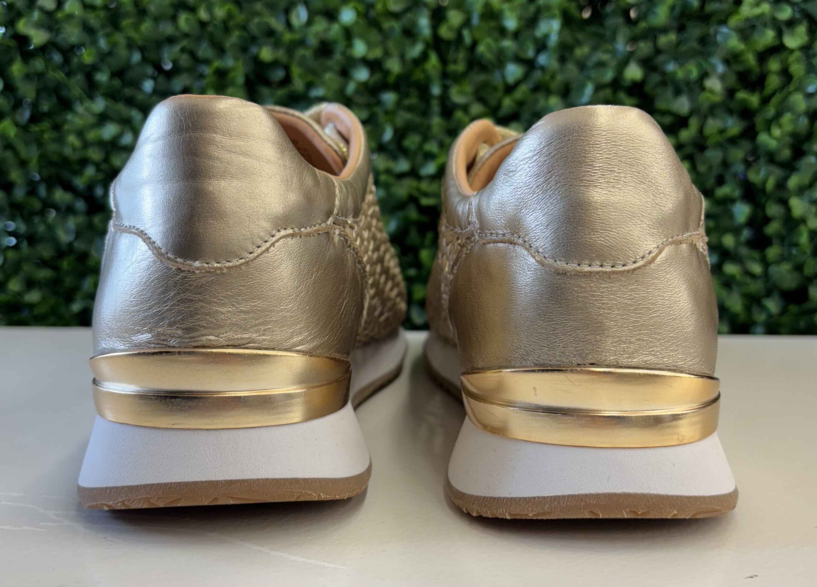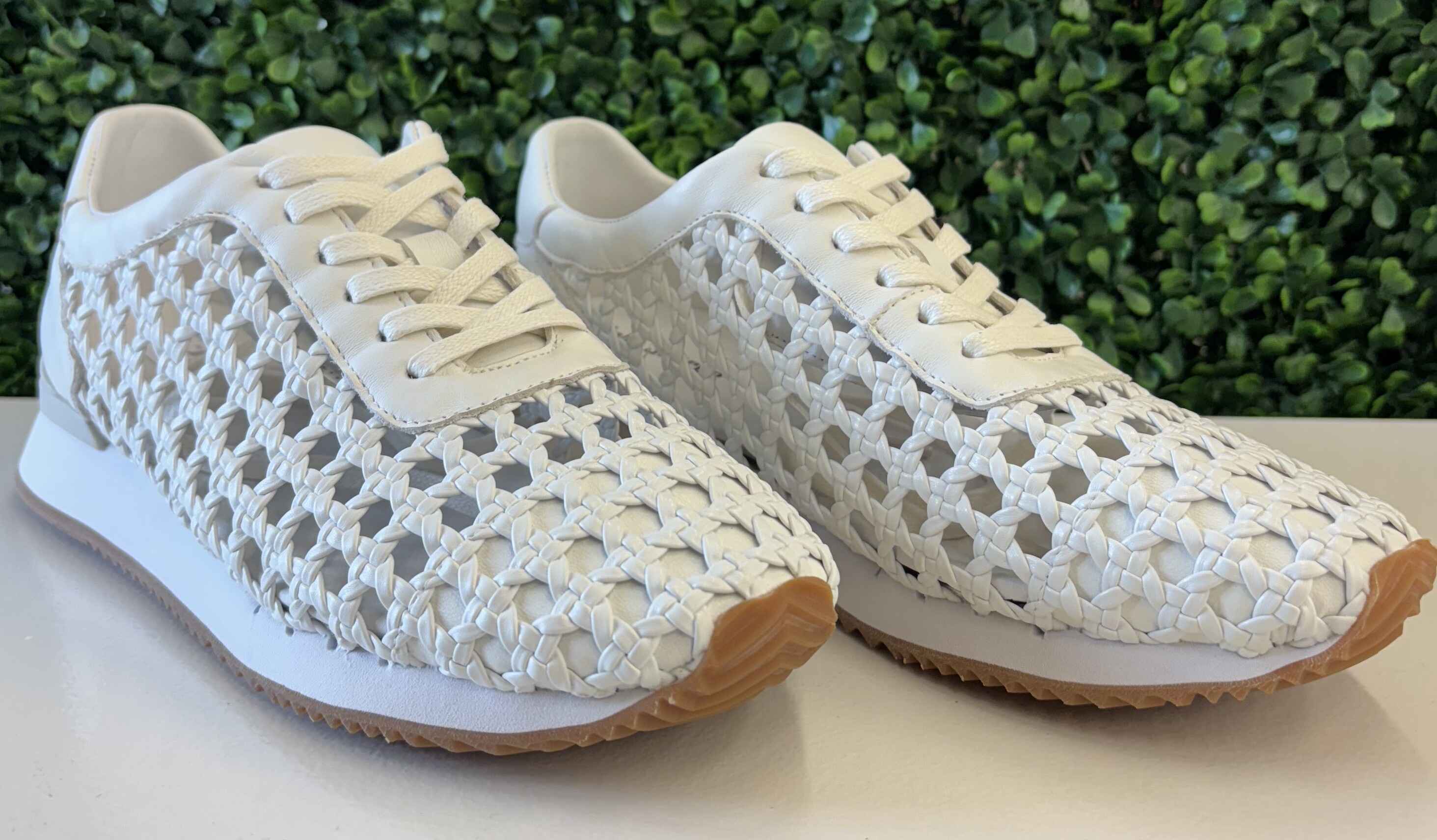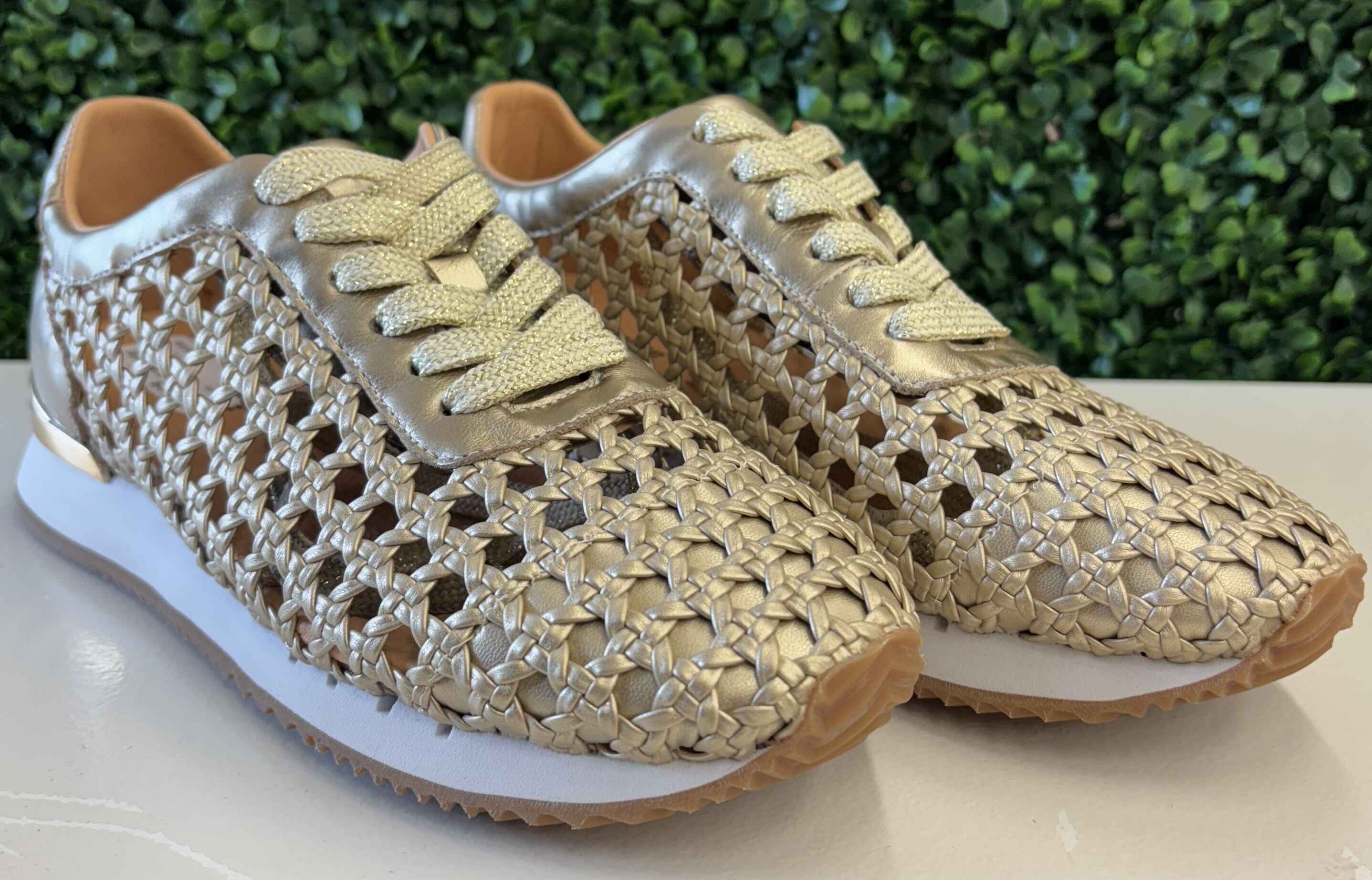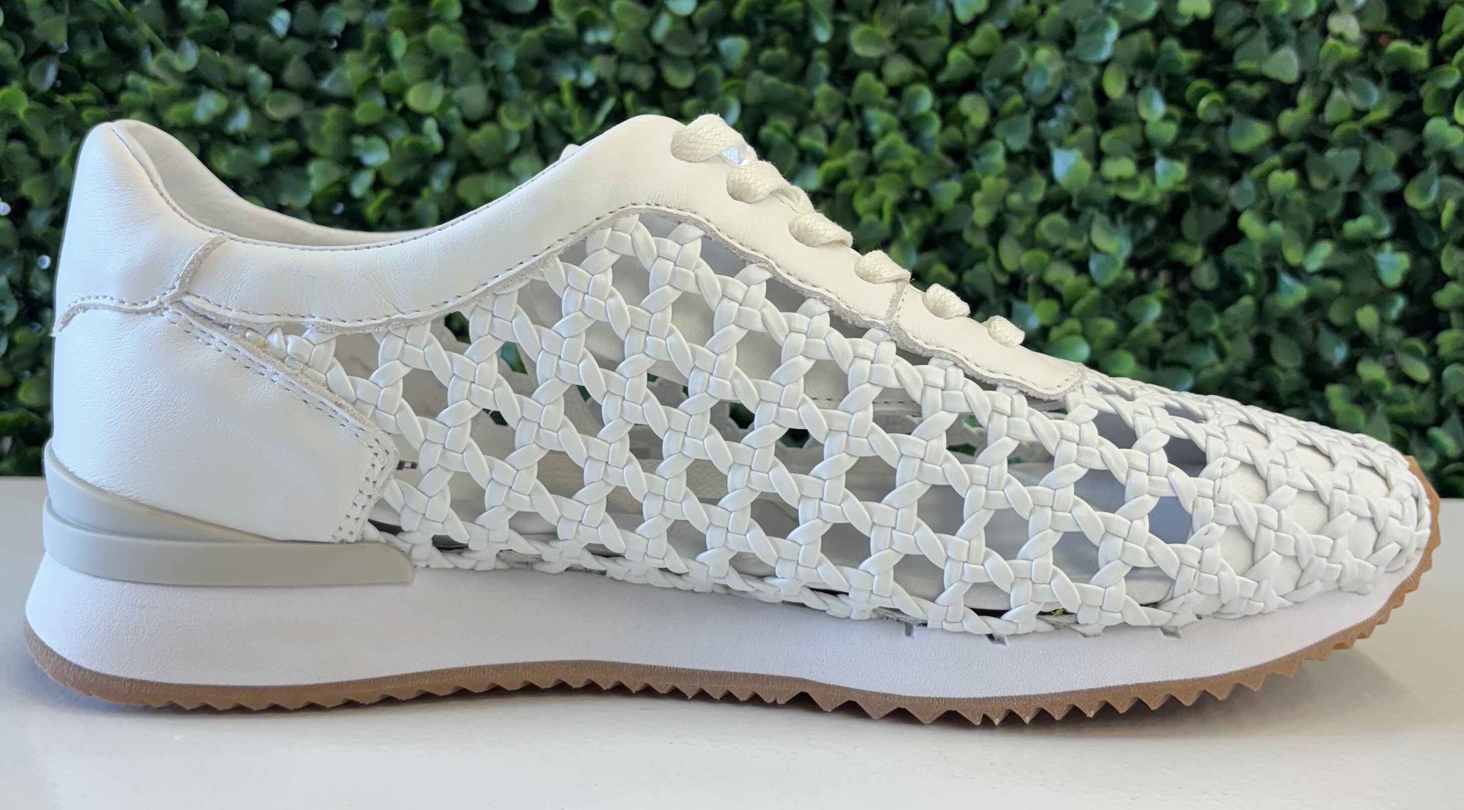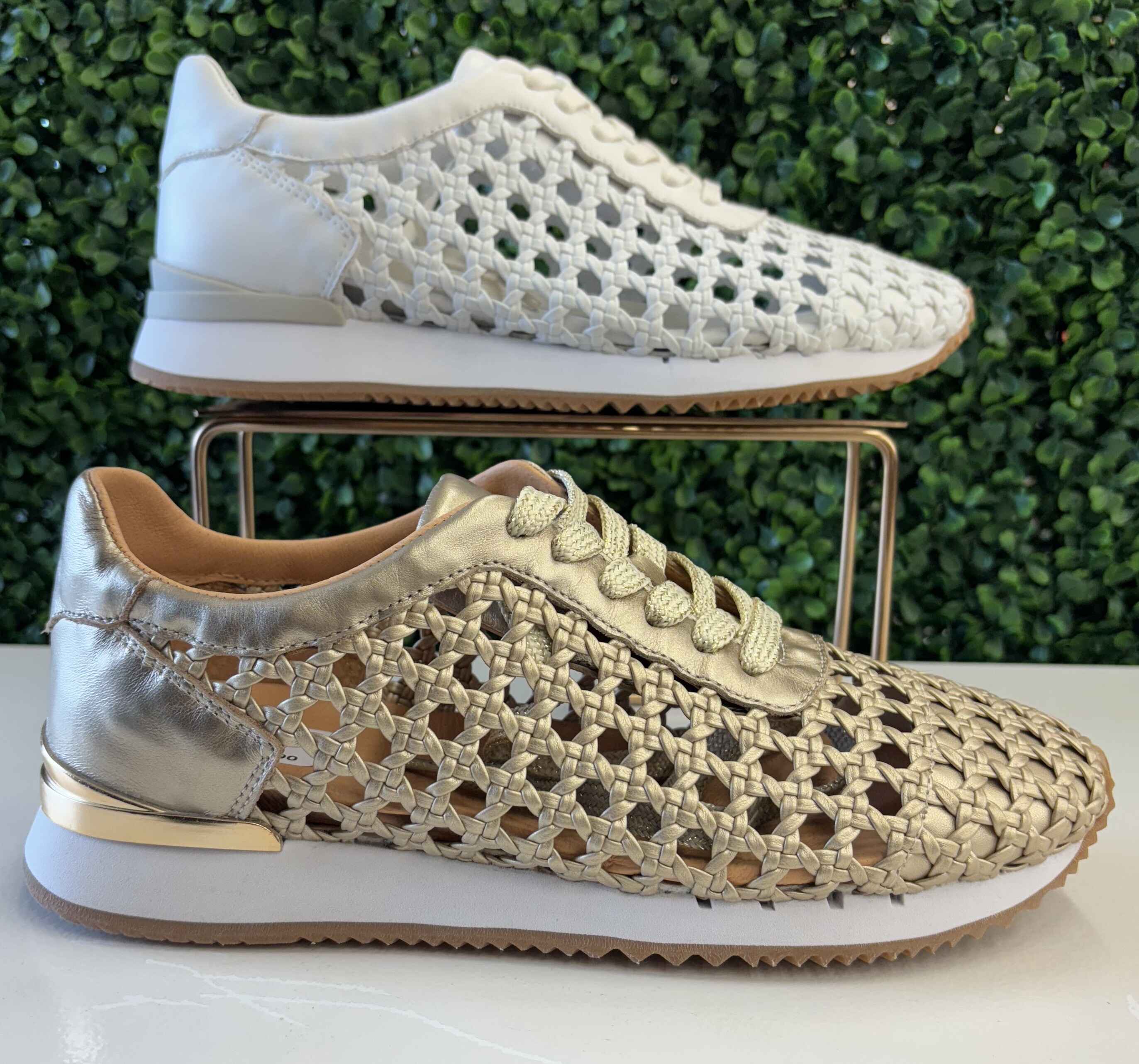 The open weave not only creates a striking visual texture but also ensures breathable wear, while the sleek leather accents and cushioned sole deliver the perfect balance of sophistication and ease. Whether you’re dressing up neutrals with the clean minimalism of white or adding instant radiance with the luxurious shine of gold, these sneakers are designed to make an impression wherever you go