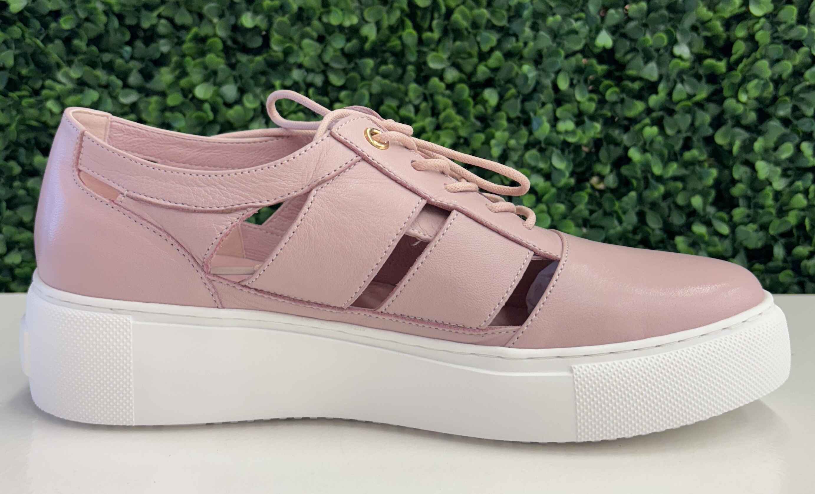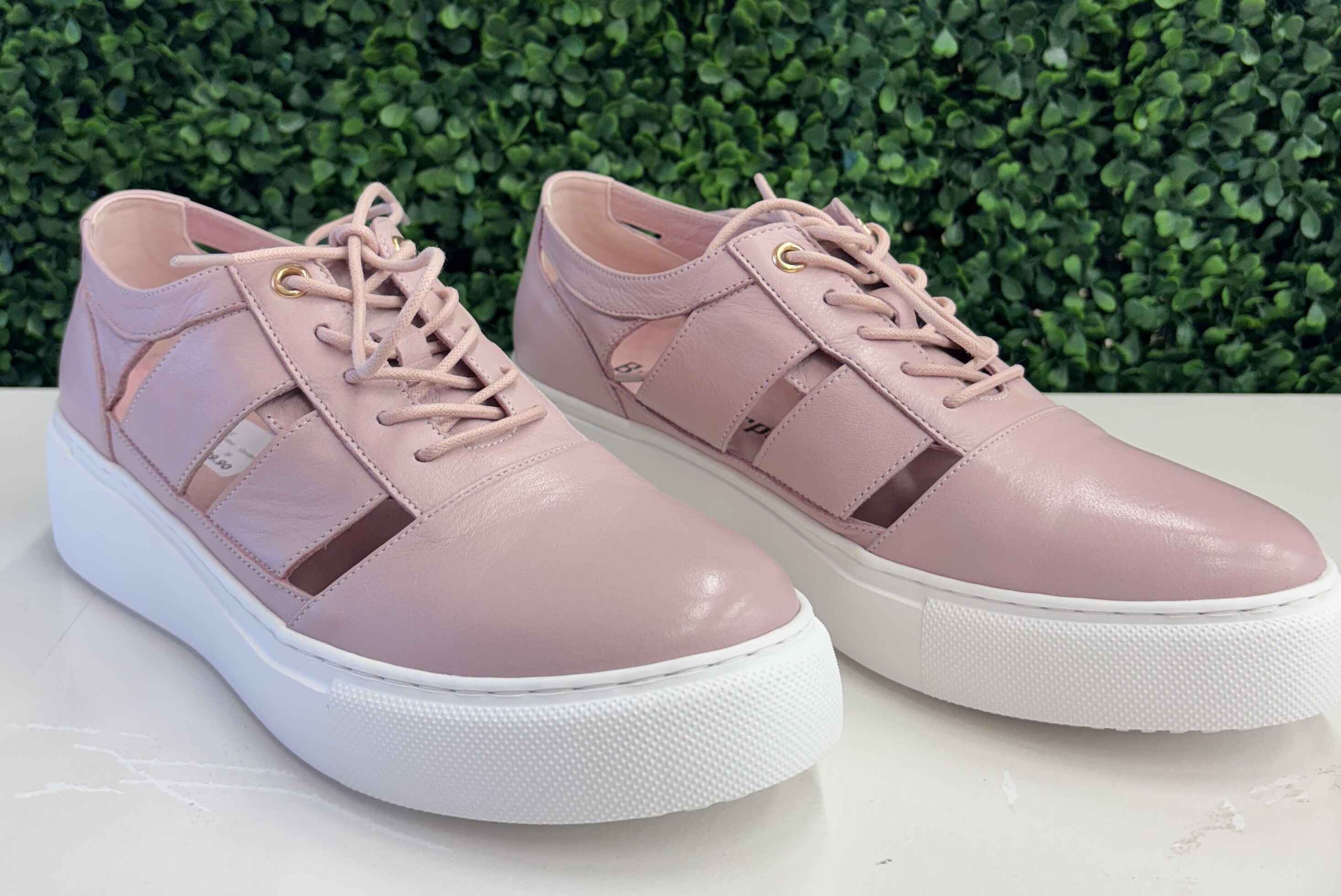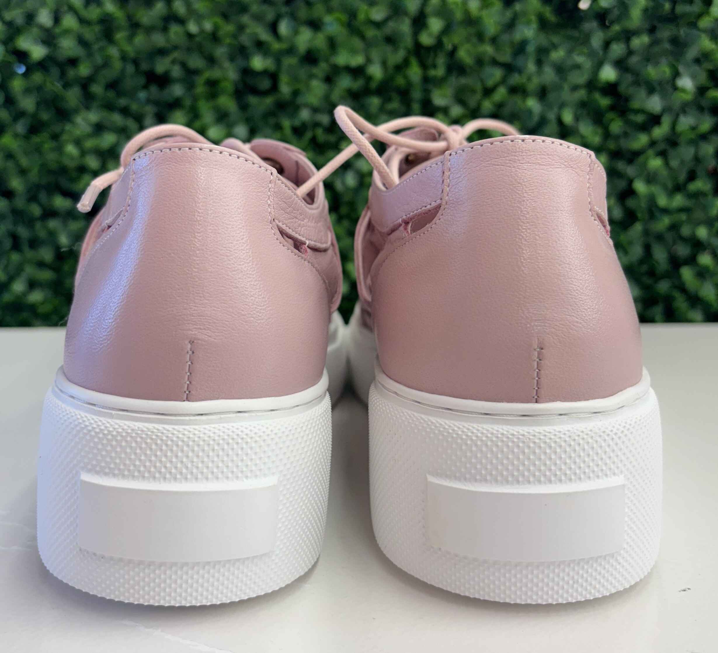 Add a soft pop of color to your look with these blush leather sneakers. Featuring chic side cutouts for breathability, a chunky white platform sole, and gold-tone eyelets, they blend comfort and modern style effortlessly.