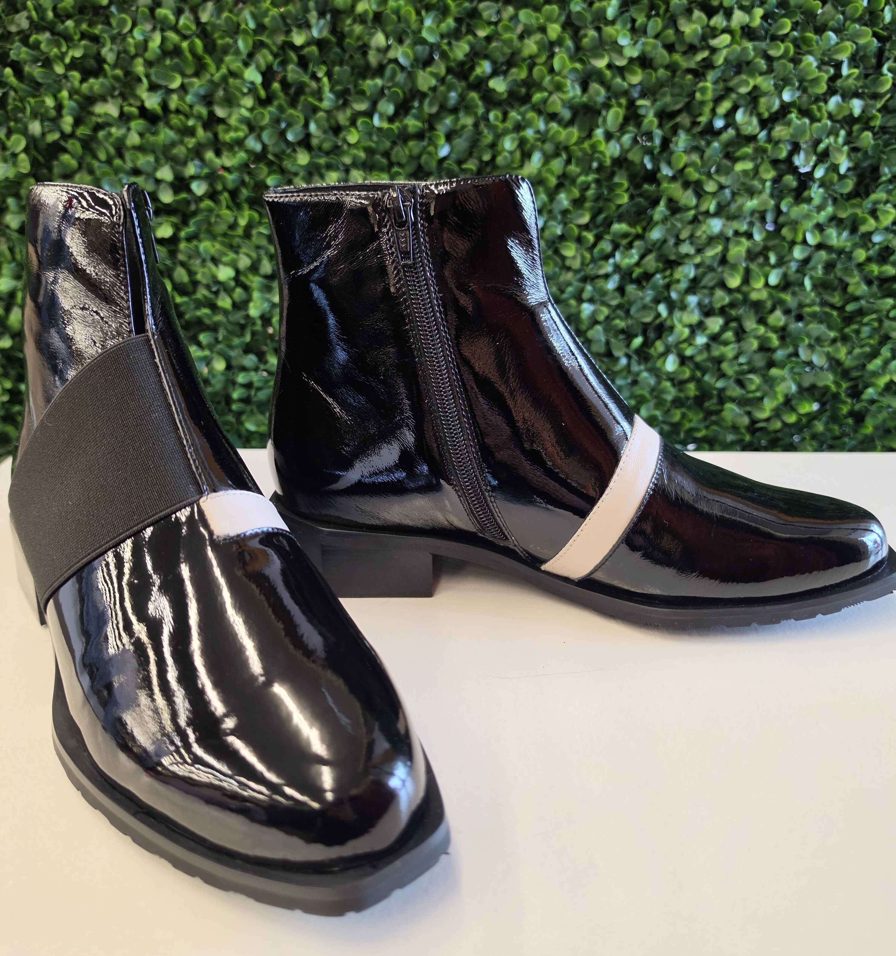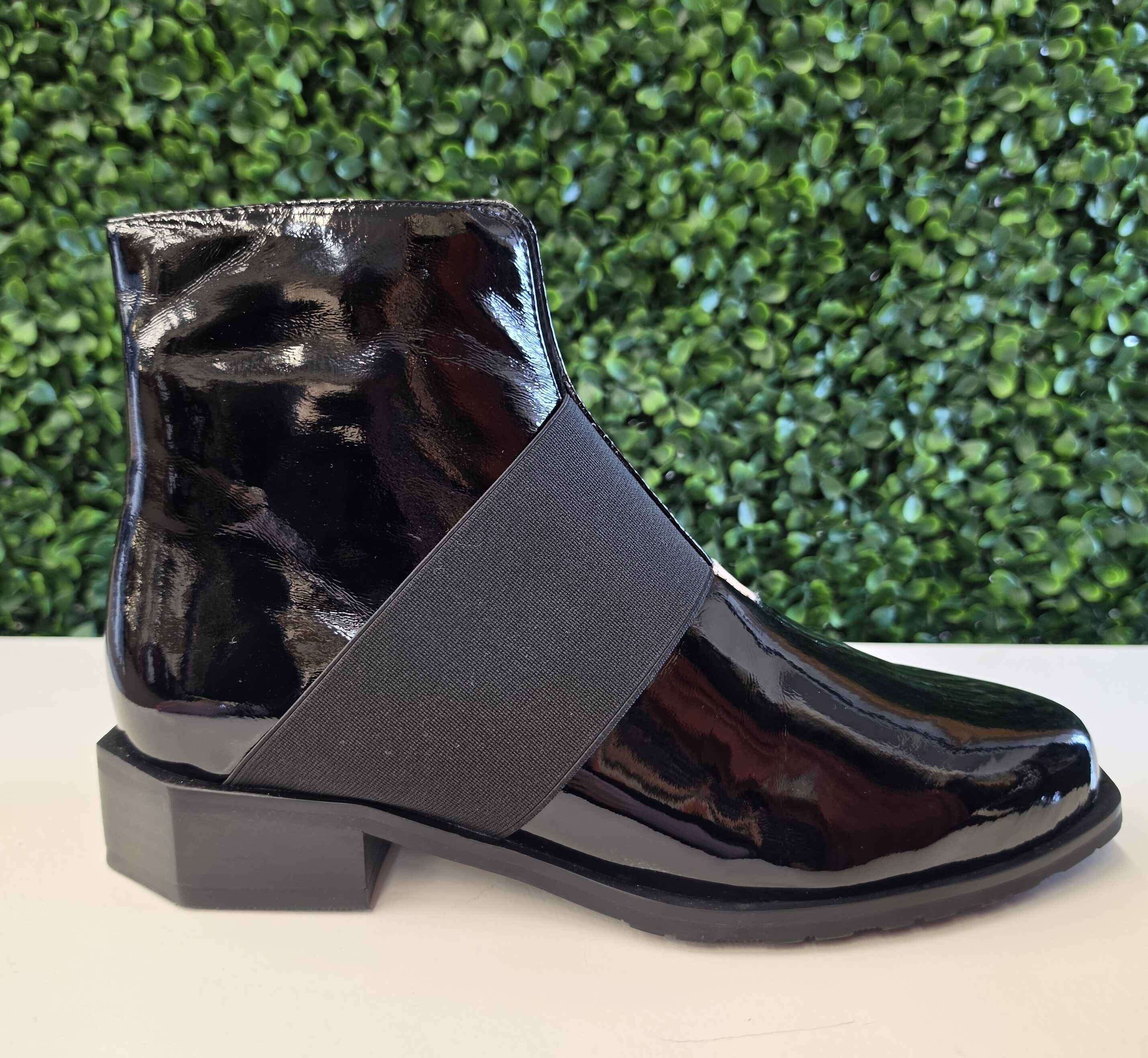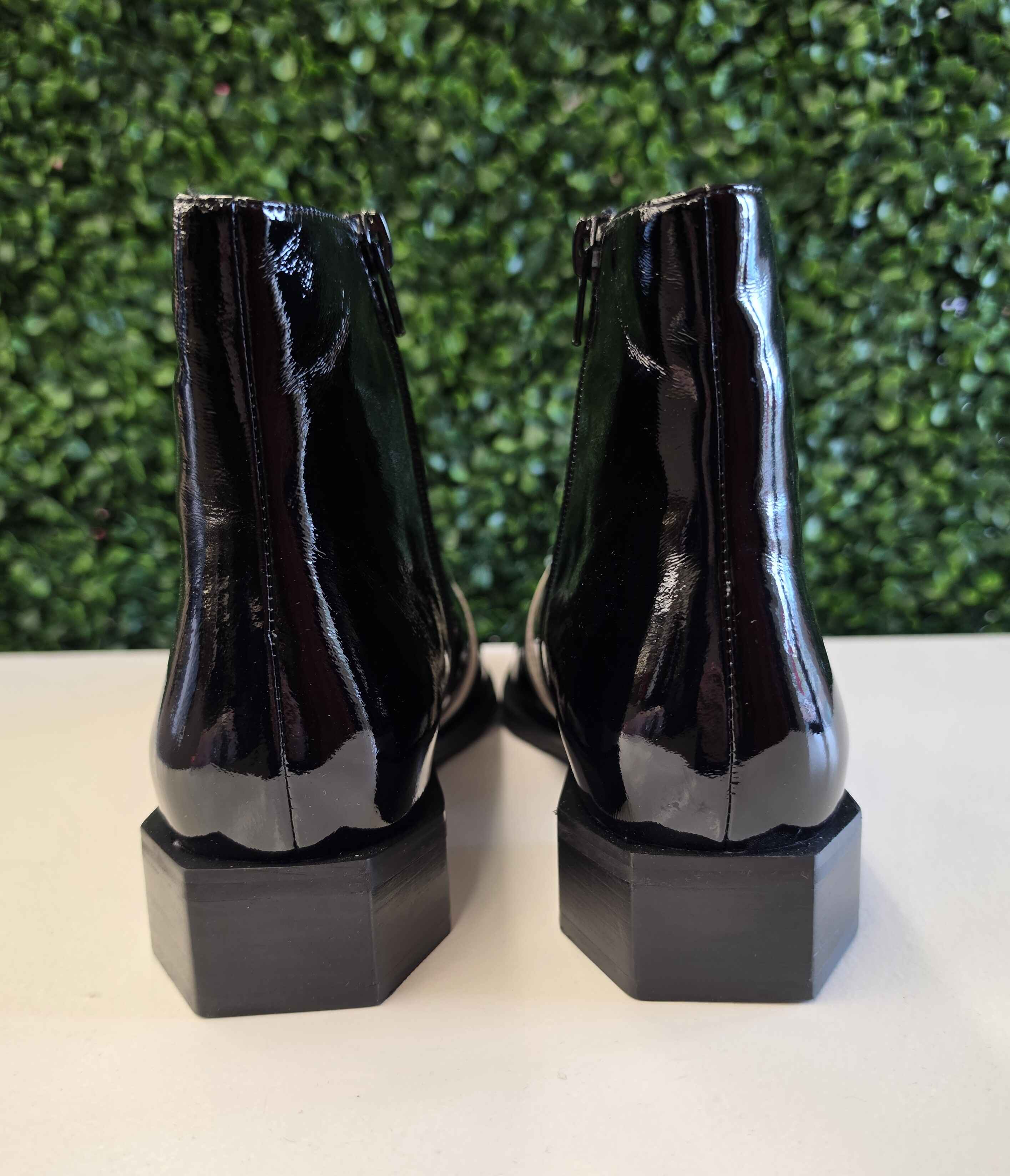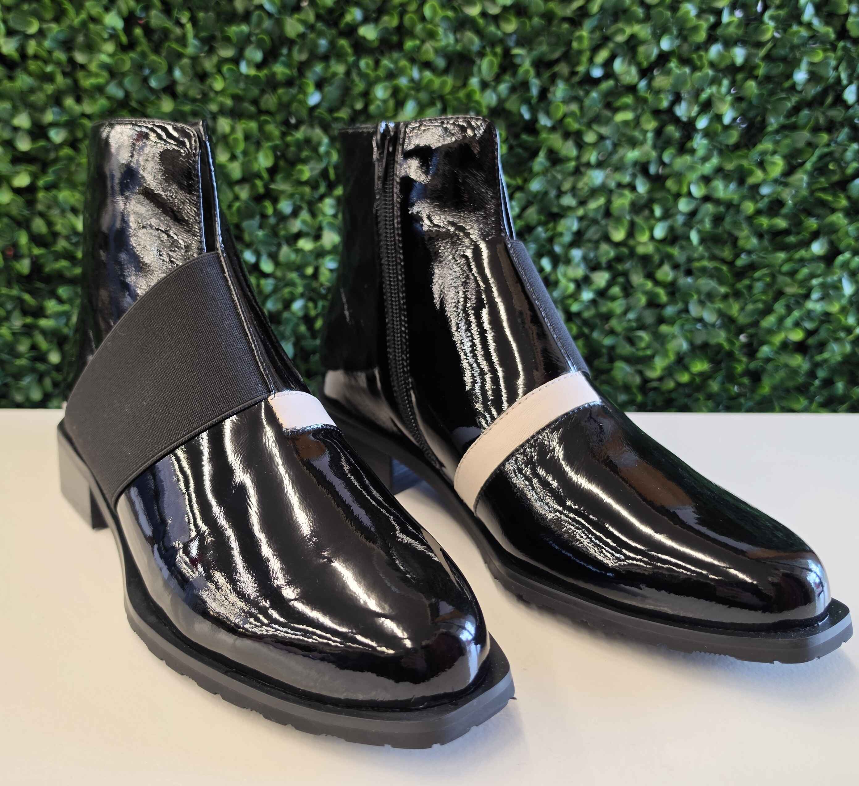 The ROLLO ankle boot by Belle Scarpe is a bold, fashion-forward style designed to stand out. Featuring a glossy patent leather upper and a distinctive hexagonal heel, it brings a modern edge to any outfit.