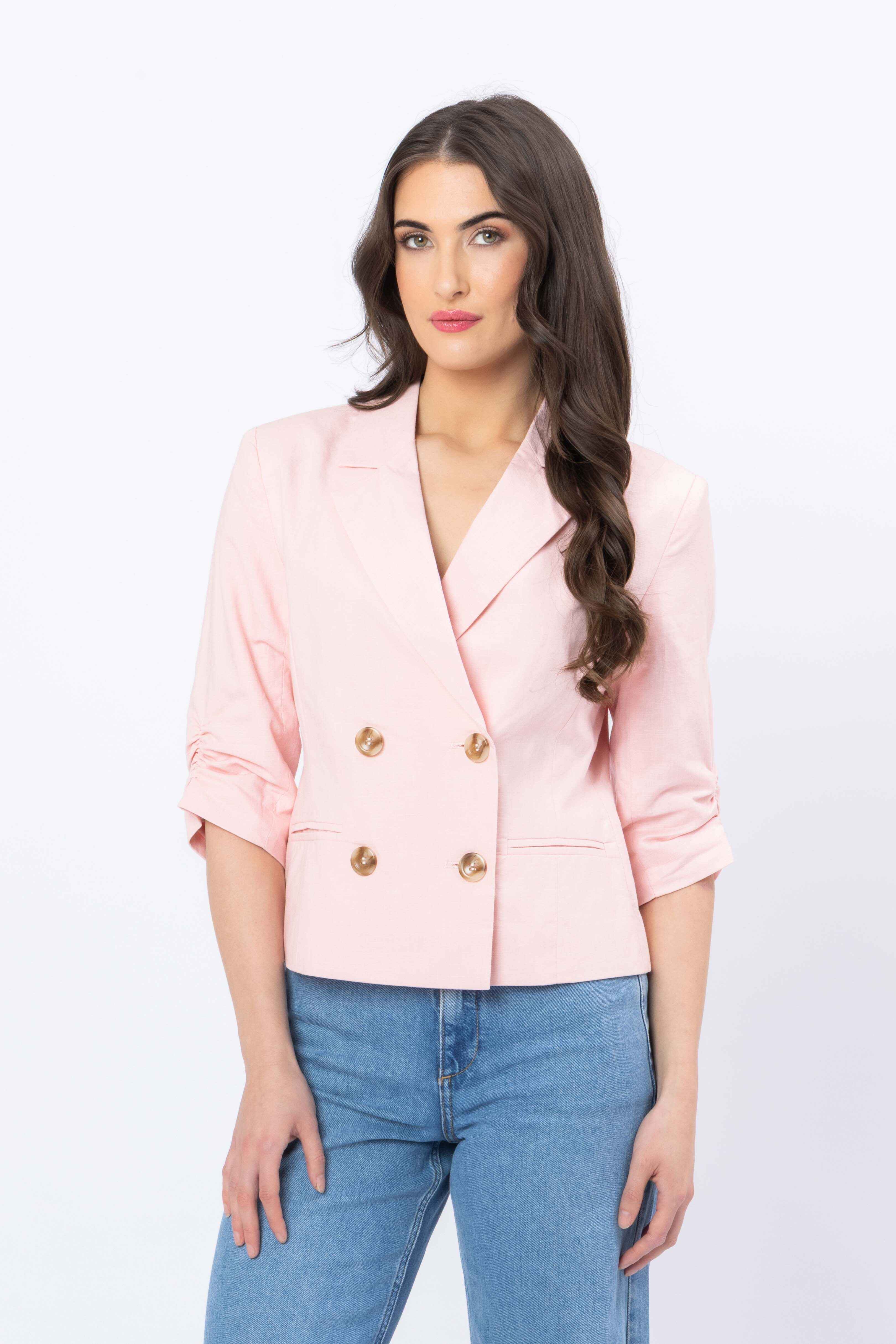 Add a fresh pop of colour to your wardrobe with this chic pink blazer. Designed with a flattering double-breasted front and classic lapels, it balances tailored structure with an easy, modern feel. The cropped length creates a clean silhouette, while the ruched three-quarter sleeves add a relaxed, contemporary touch. Finished with statement gold-tone buttons and subtle pocket detailing, this blazer is perfect for dressing up denim or pairing with tailored separates for a refined look.