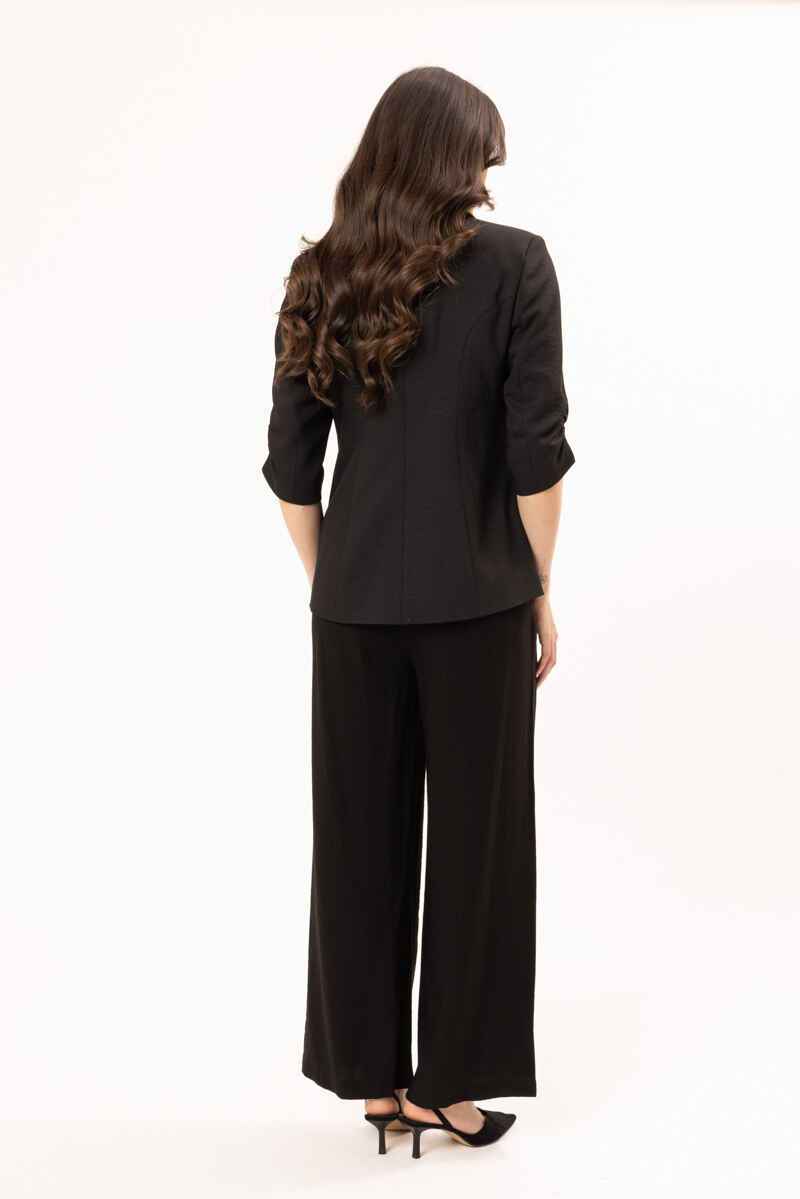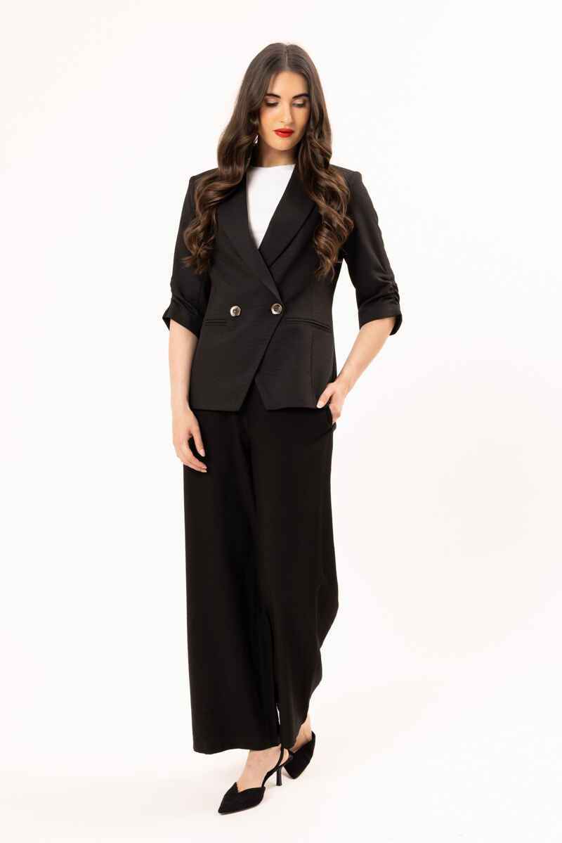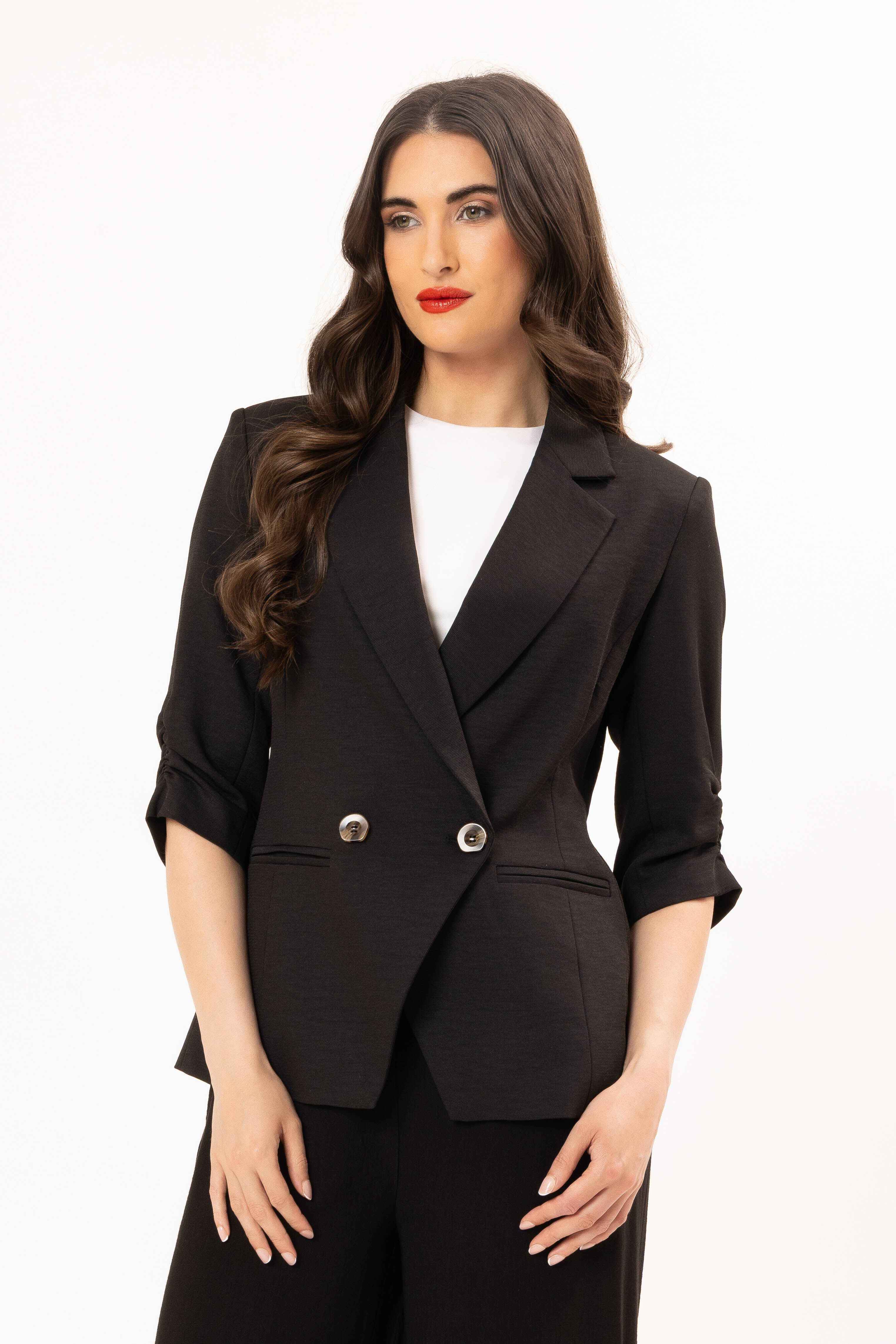 A timeless black double-breasted blazer designed with a flattering, tailored silhouette. Featuring structured lapels, statement buttons, and modern ¾ ruched sleeves, this piece delivers effortless polish. Crafted from a smooth, structured fabric, it’s perfect for elevating both workwear and evening looks. Pair with matching trousers for a sleek, coordinated outfit or style over a dress for a refined finish.