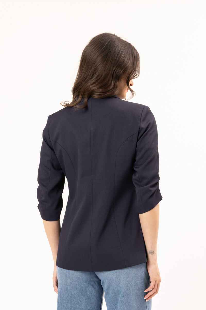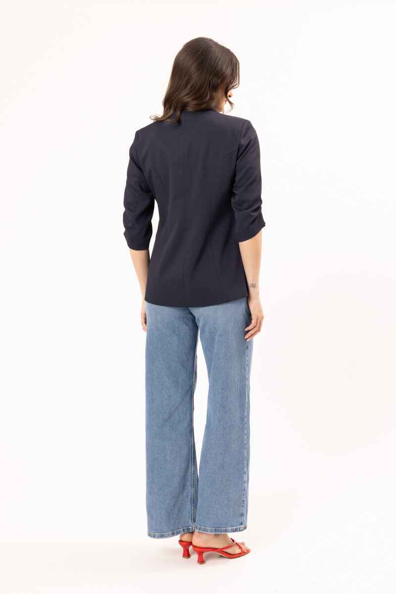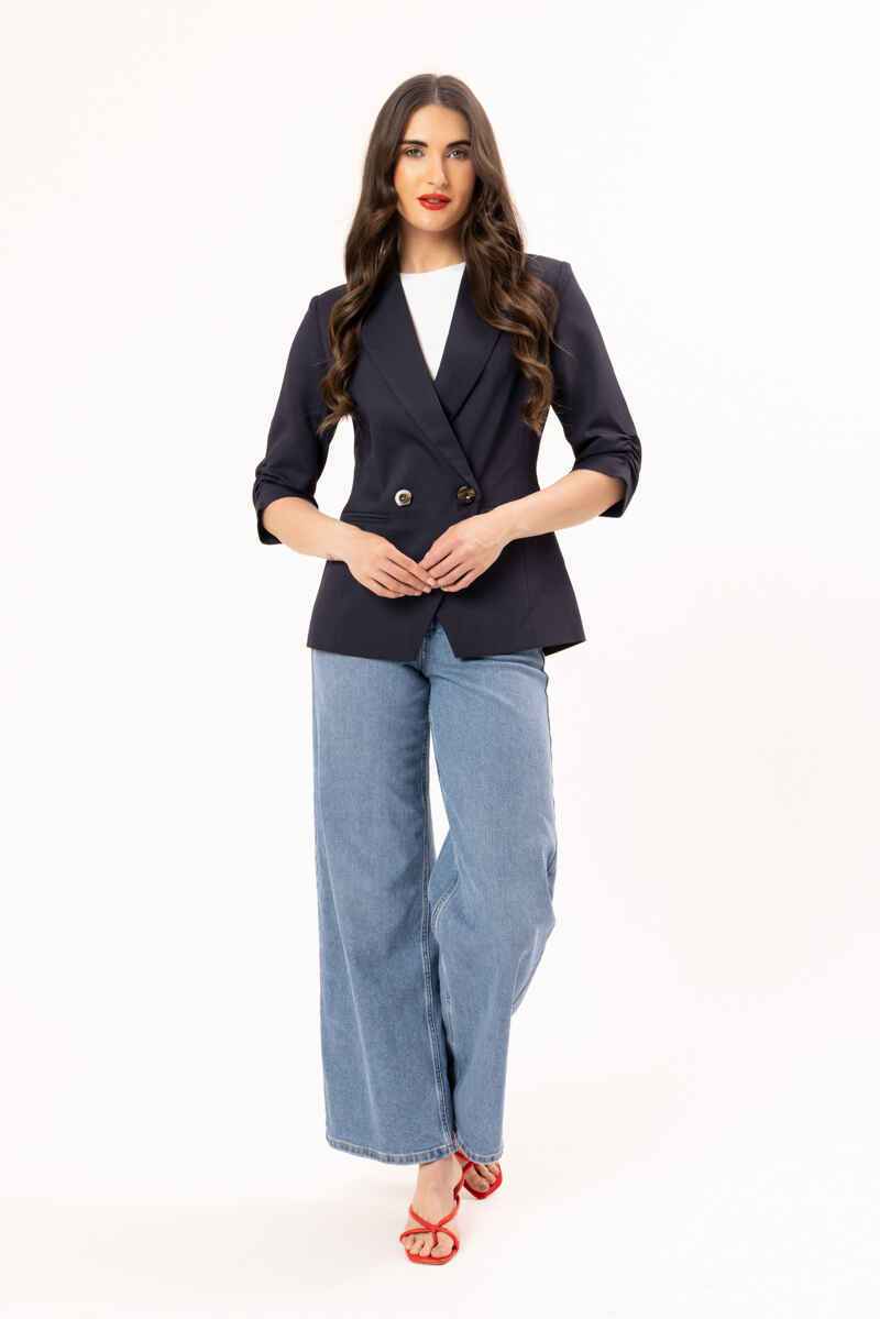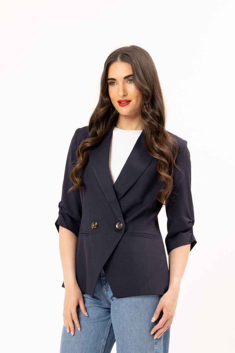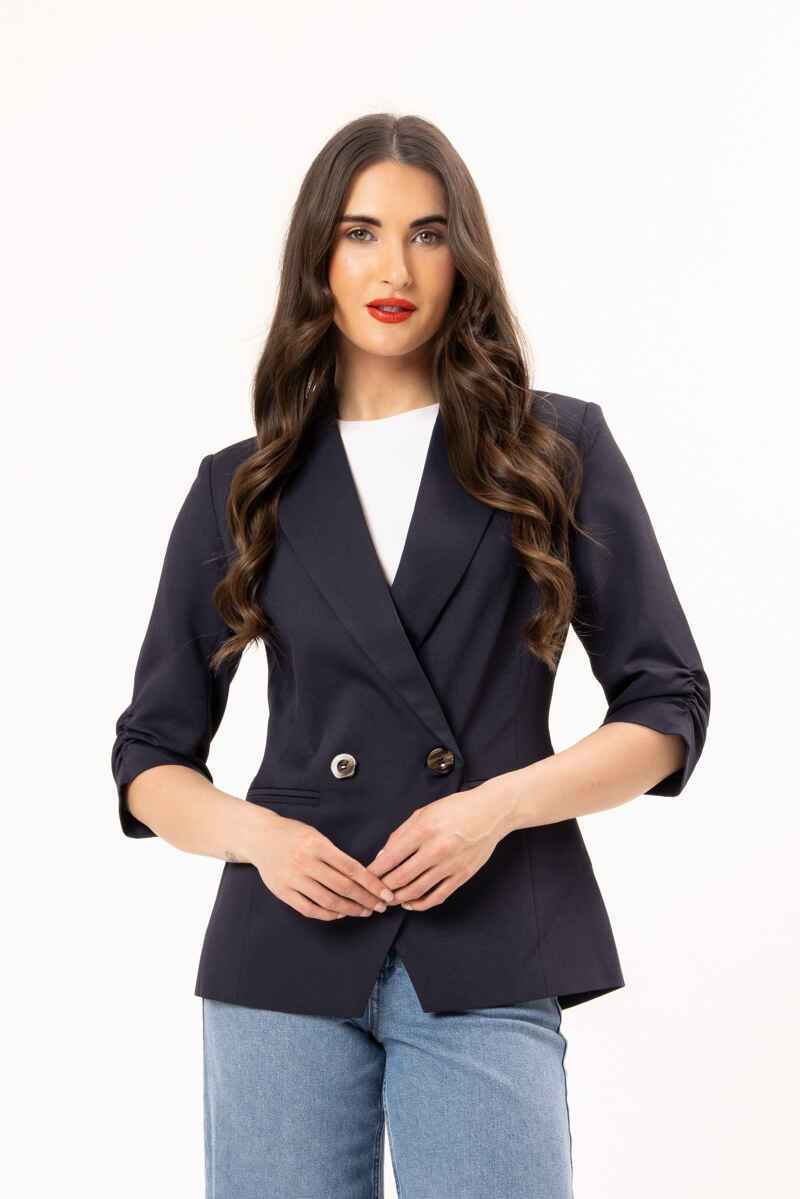 A timeless navy double-breasted blazer designed with a flattering, tailored silhouette. Featuring structured lapels, statement buttons, and modern ¾ ruched sleeves, this piece delivers effortless polish. Crafted from a smooth, structured fabric, it’s perfect for elevating both workwear and evening looks. Pair with matching trousers for a sleek, coordinated outfit or style over a dress for a refined finish.
