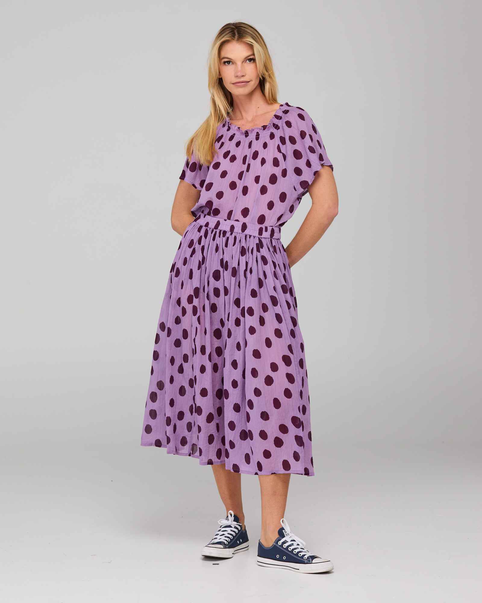 Below-knee length skirt, inseam pockets and a fully elasticated waist.