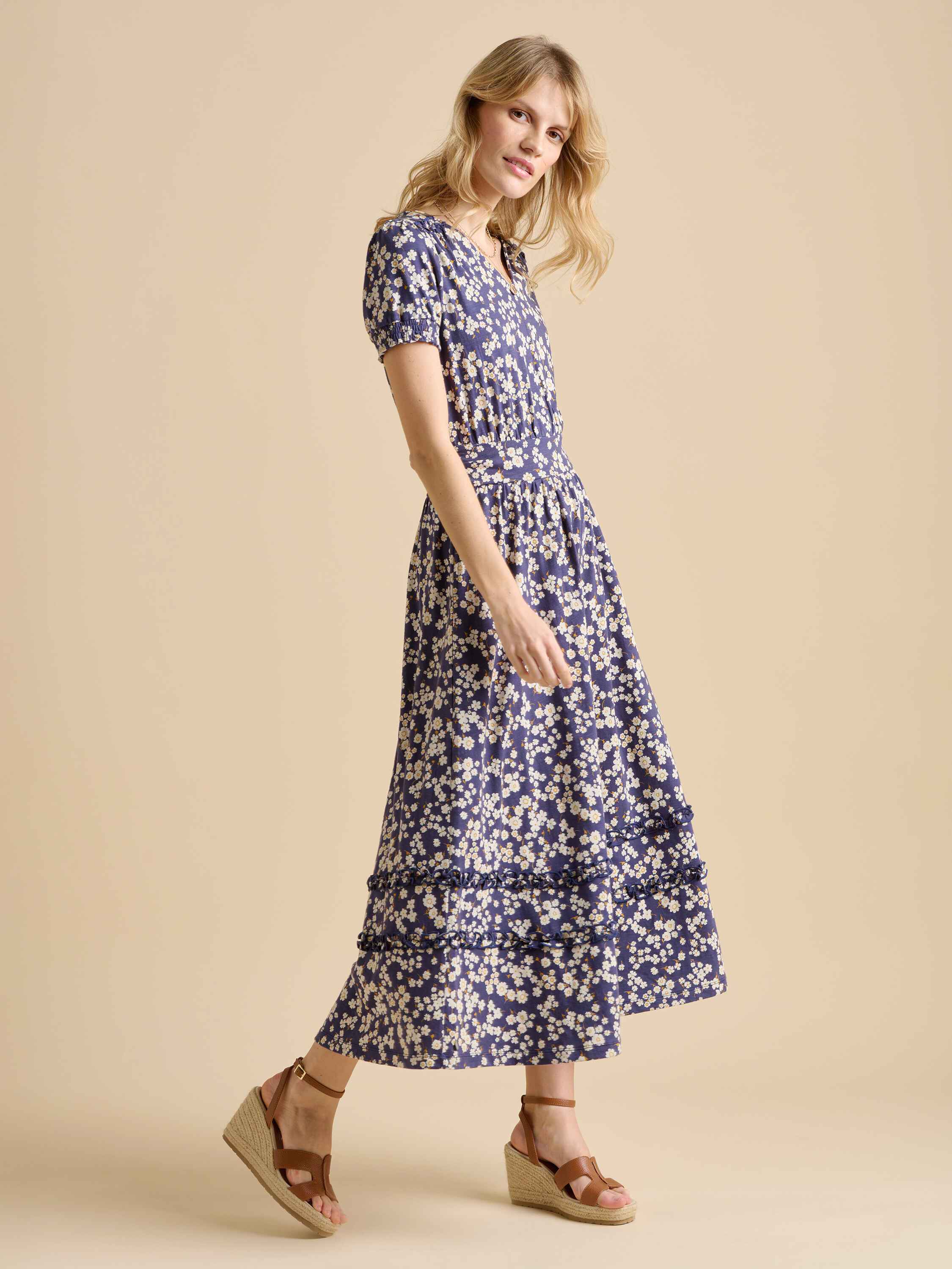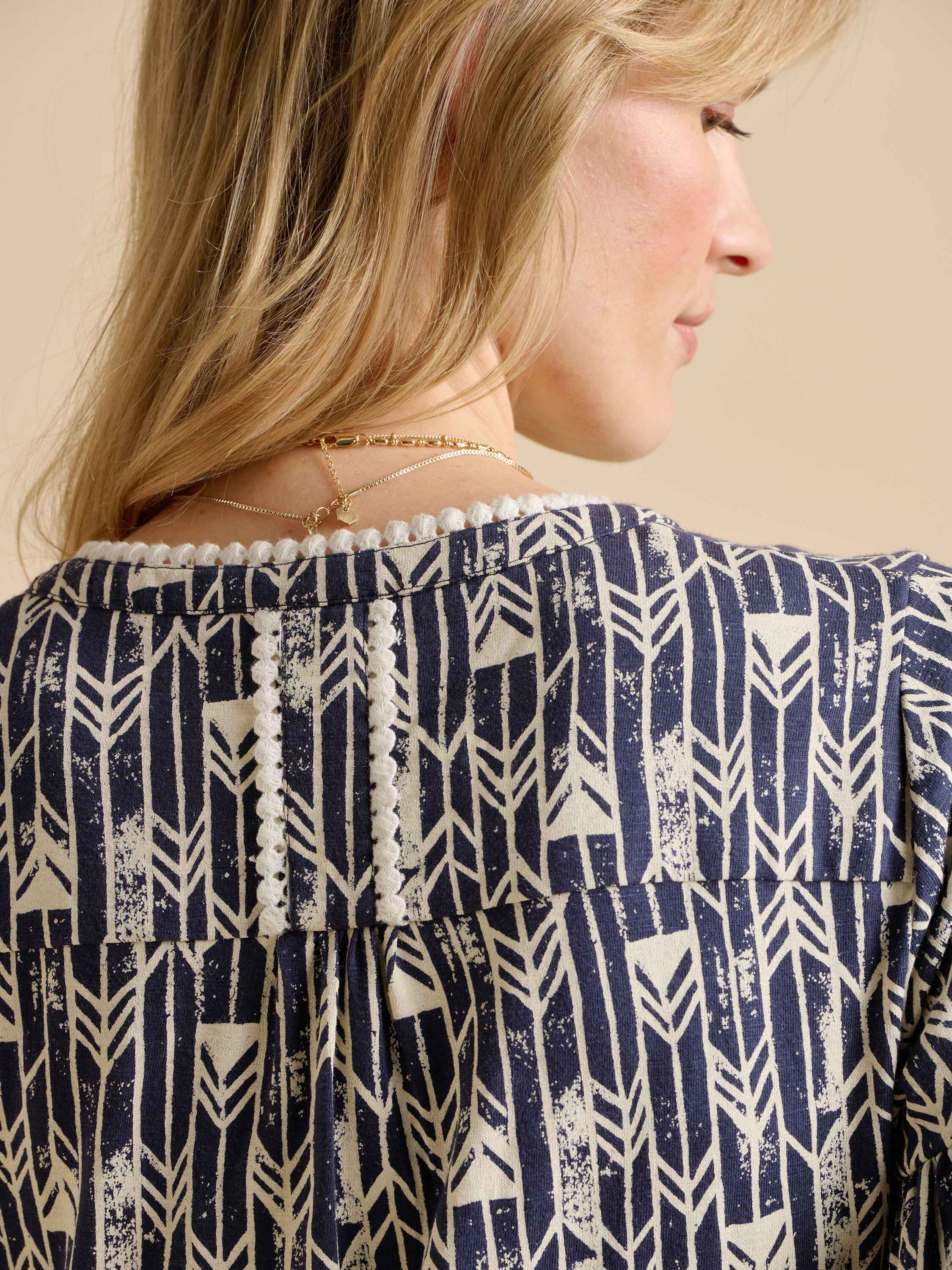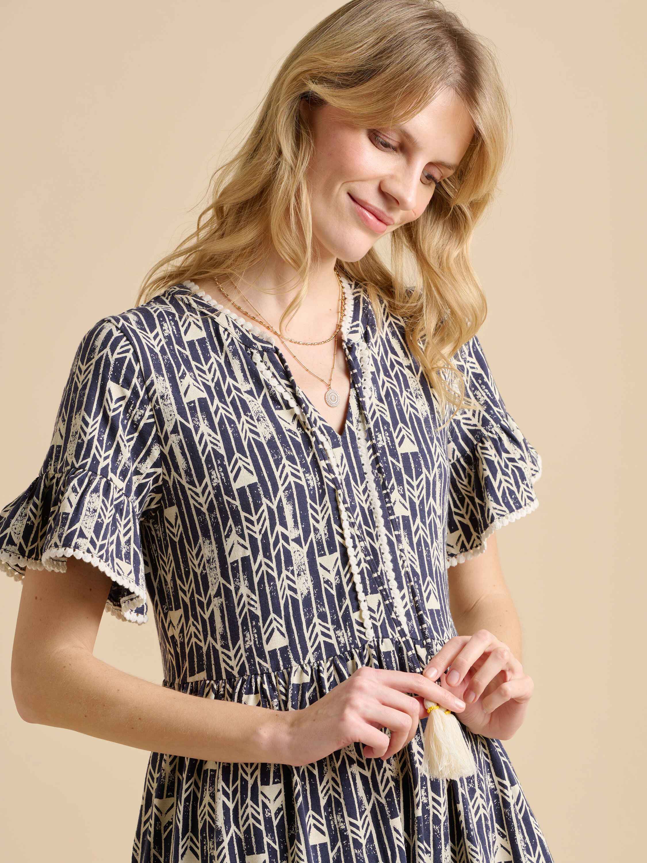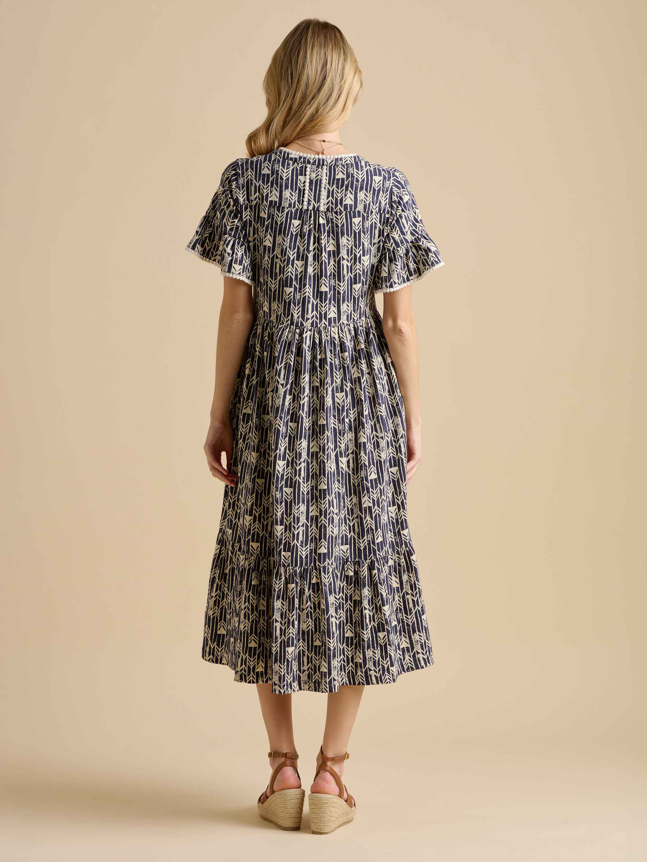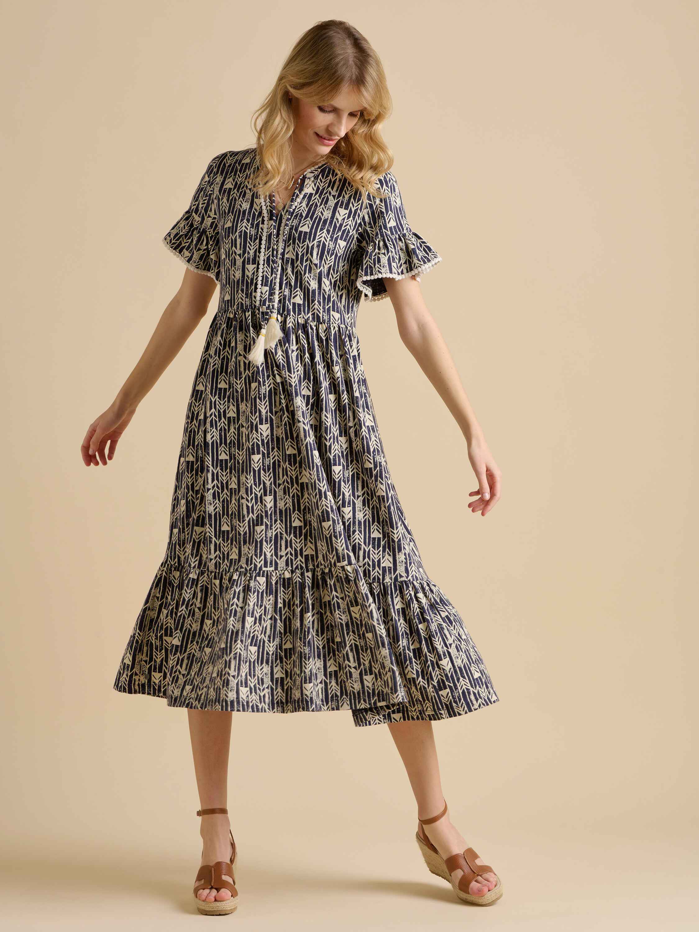 This striking statement dress will have heads turning. The smart monochrome fabric with feminine styling could be paired with a leather belt and sandals for a bold summer look. This midi dress also pays attention to every detail, with delicate trim and stylish neck tassels.100% Cotton