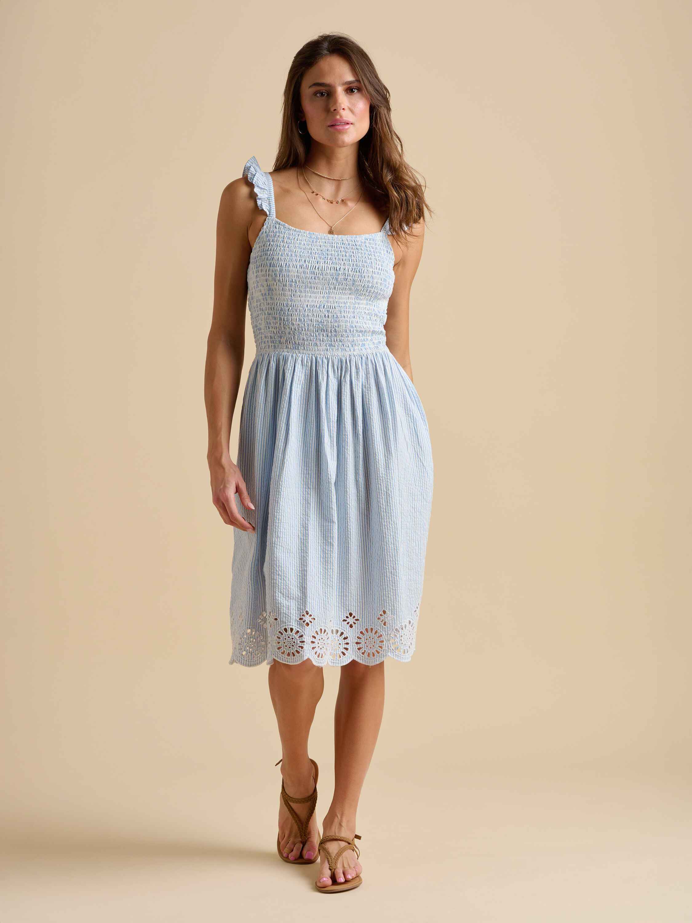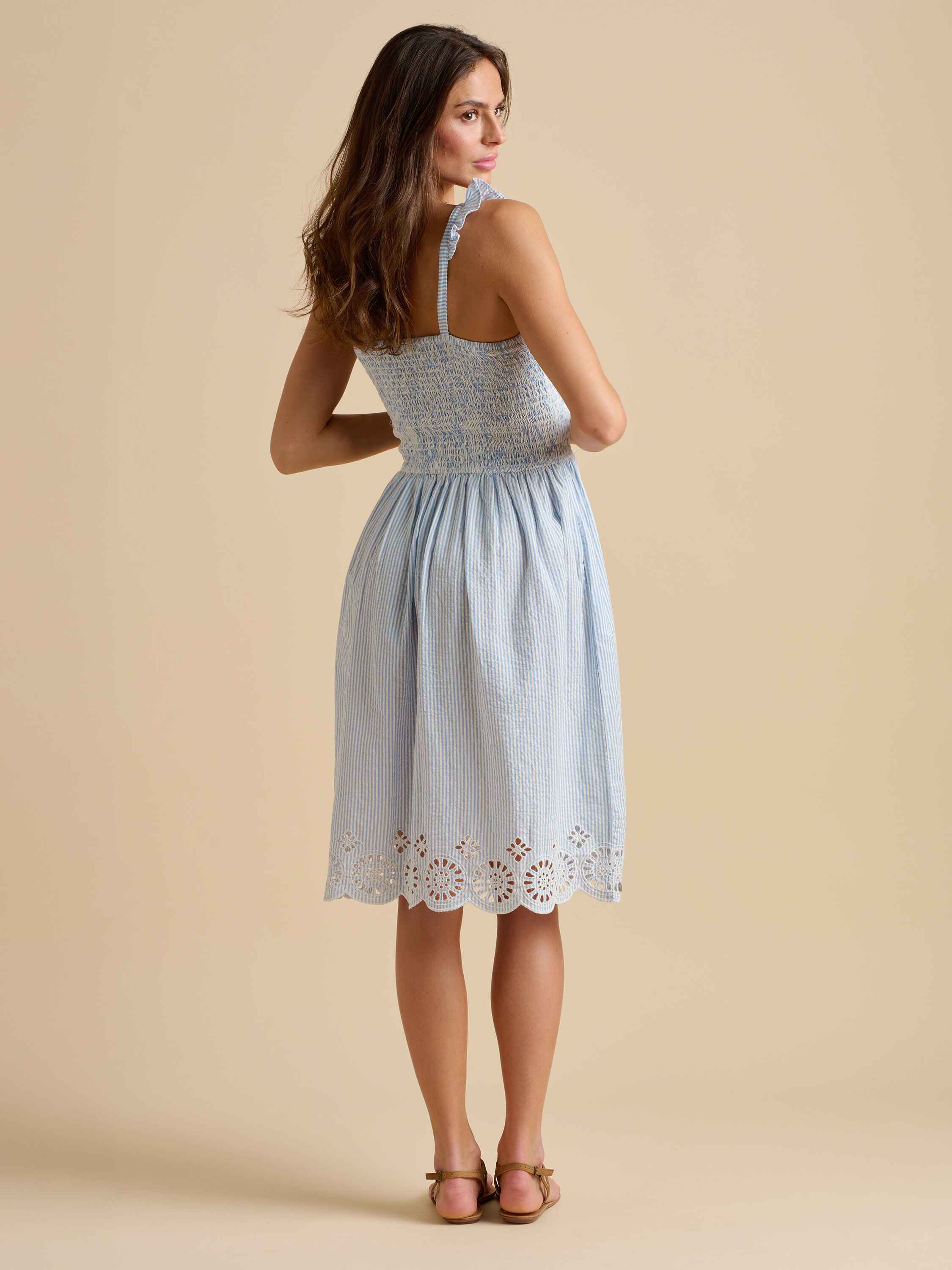 Looking for a dress that combines dainty charm with summer joy? You’ve found it. The pale blue stripes, broderie hem, and frilled sleeves make this dress the sweetest choice for a warm day. Pair it with white sandals and a thin cardigan for those garden party afternoons.100% Cotton