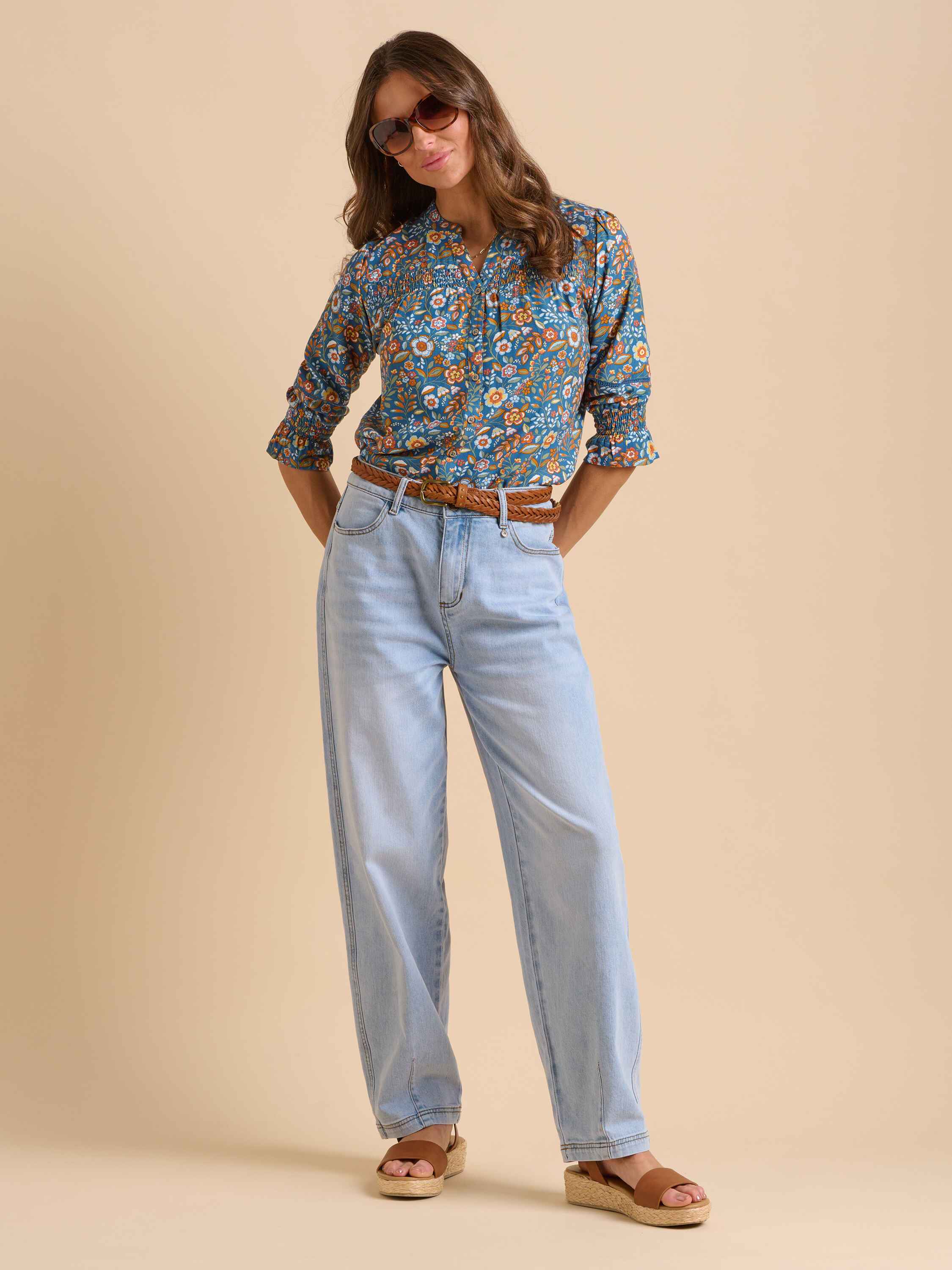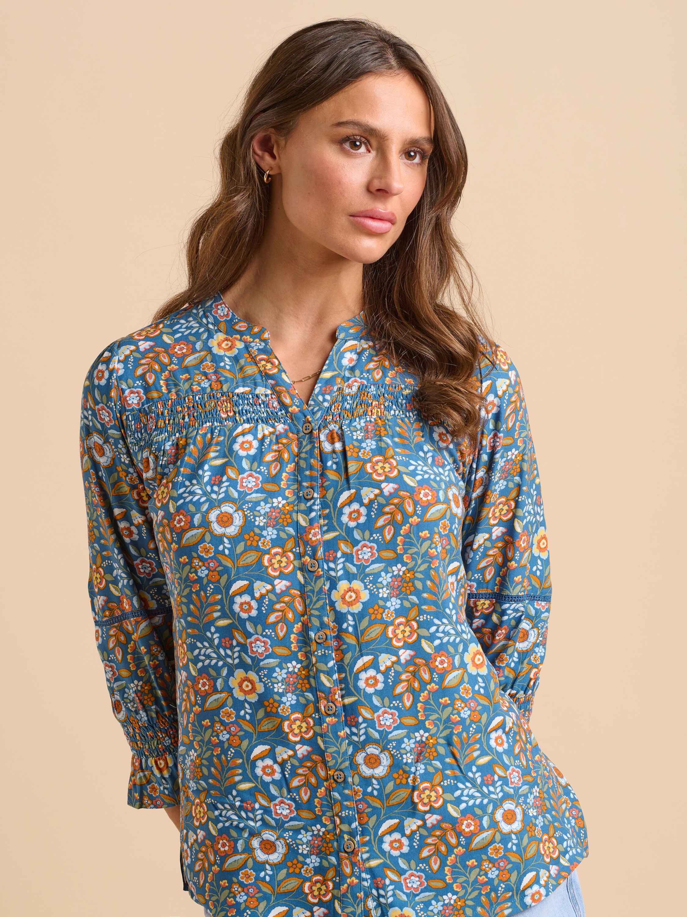 Inspired by a garden at dusk, this top brings floral beauty to life with its intricate print. Shirred chest and sleeves create a soft silhouette, while frilled and broderie detailing add a dose of elegance. Pair with a white midi skirt and sandals for lunch with friends.