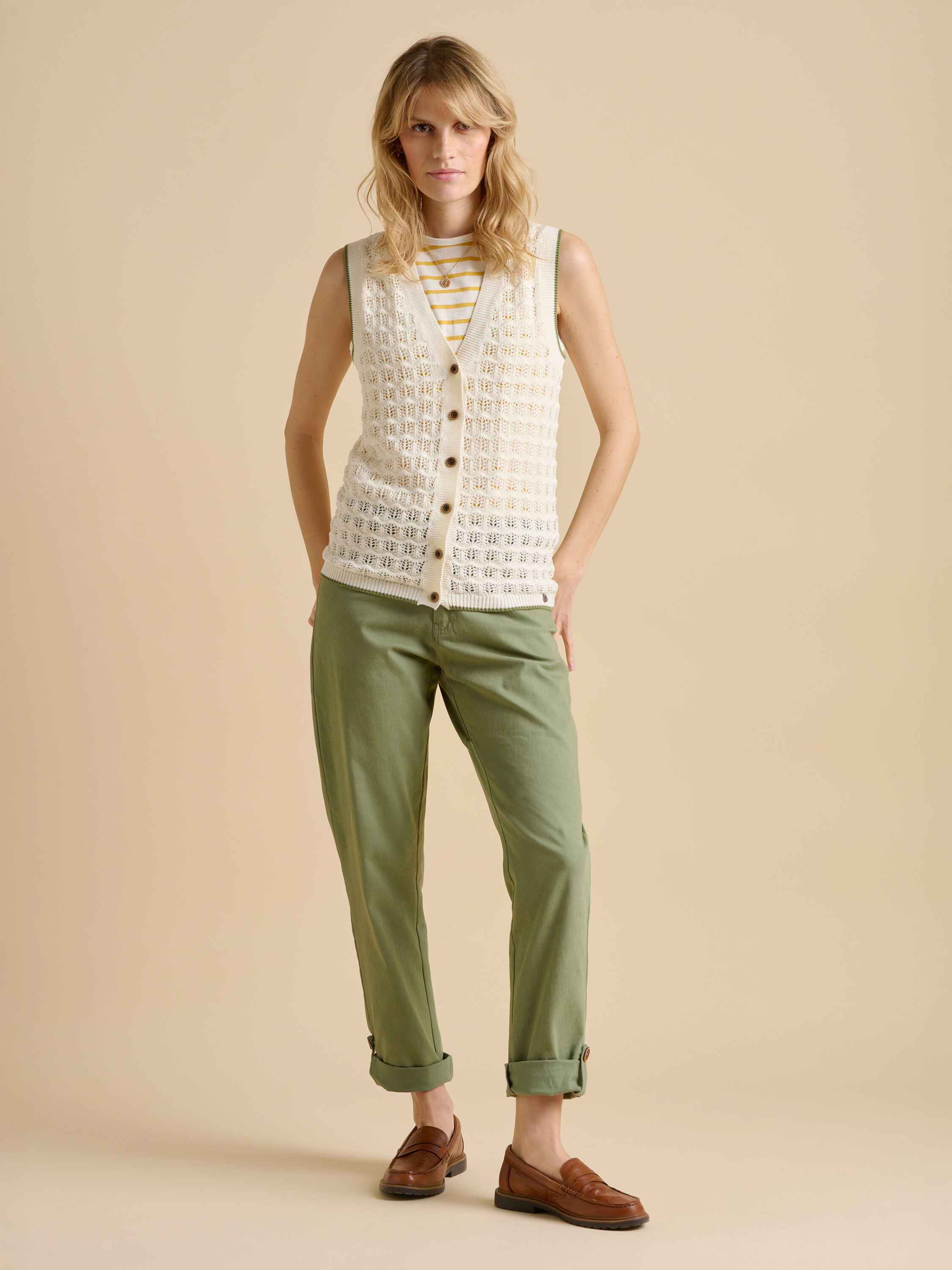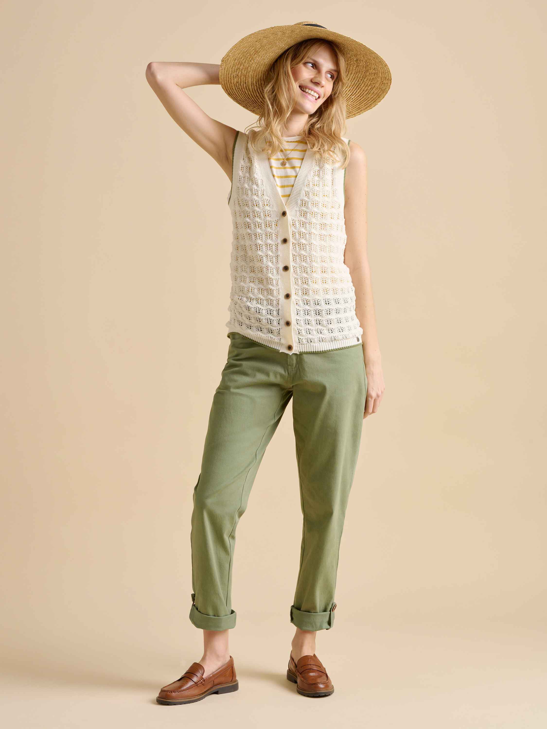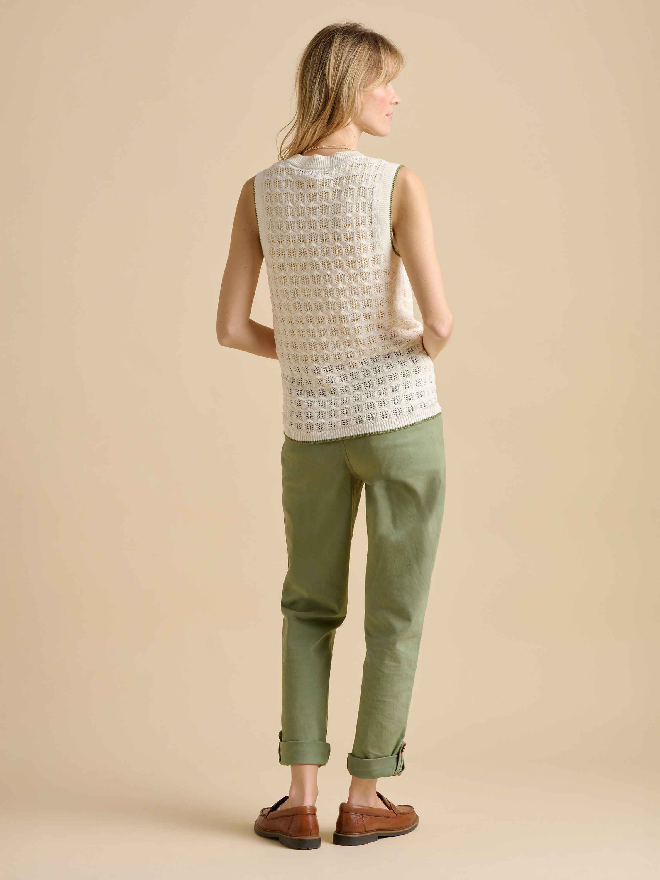 This pointelle knit tank is the perfect layering piece, featuring a soft cream hue with a pop of green edging on the sleeves and hem. A versatile and gorgeous addition to any wardrobe, perfect for styling over a blouse or under a cardigan.100% Cotton