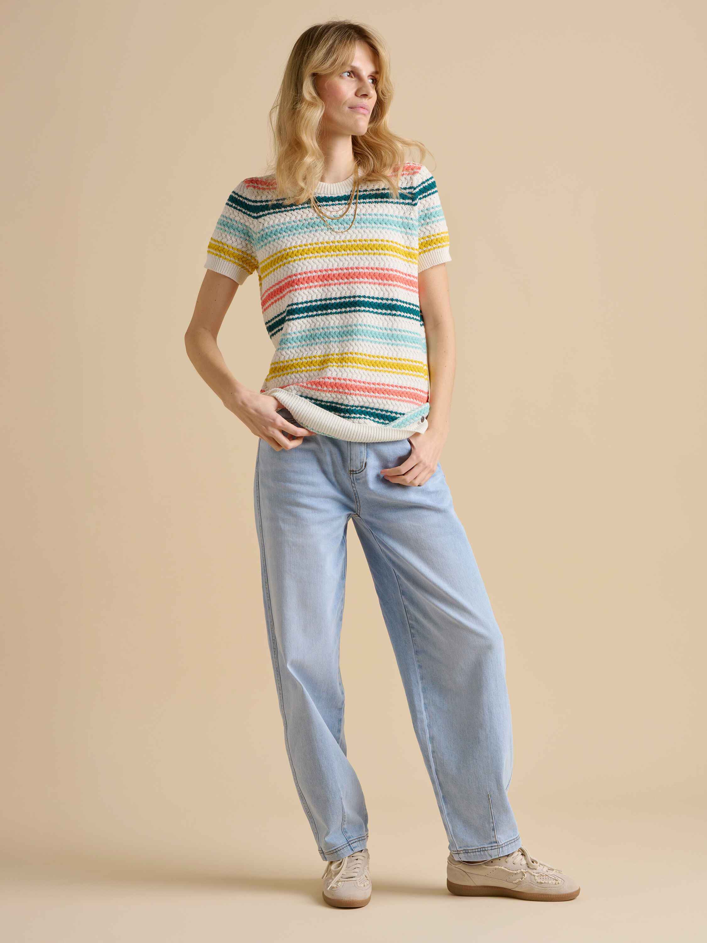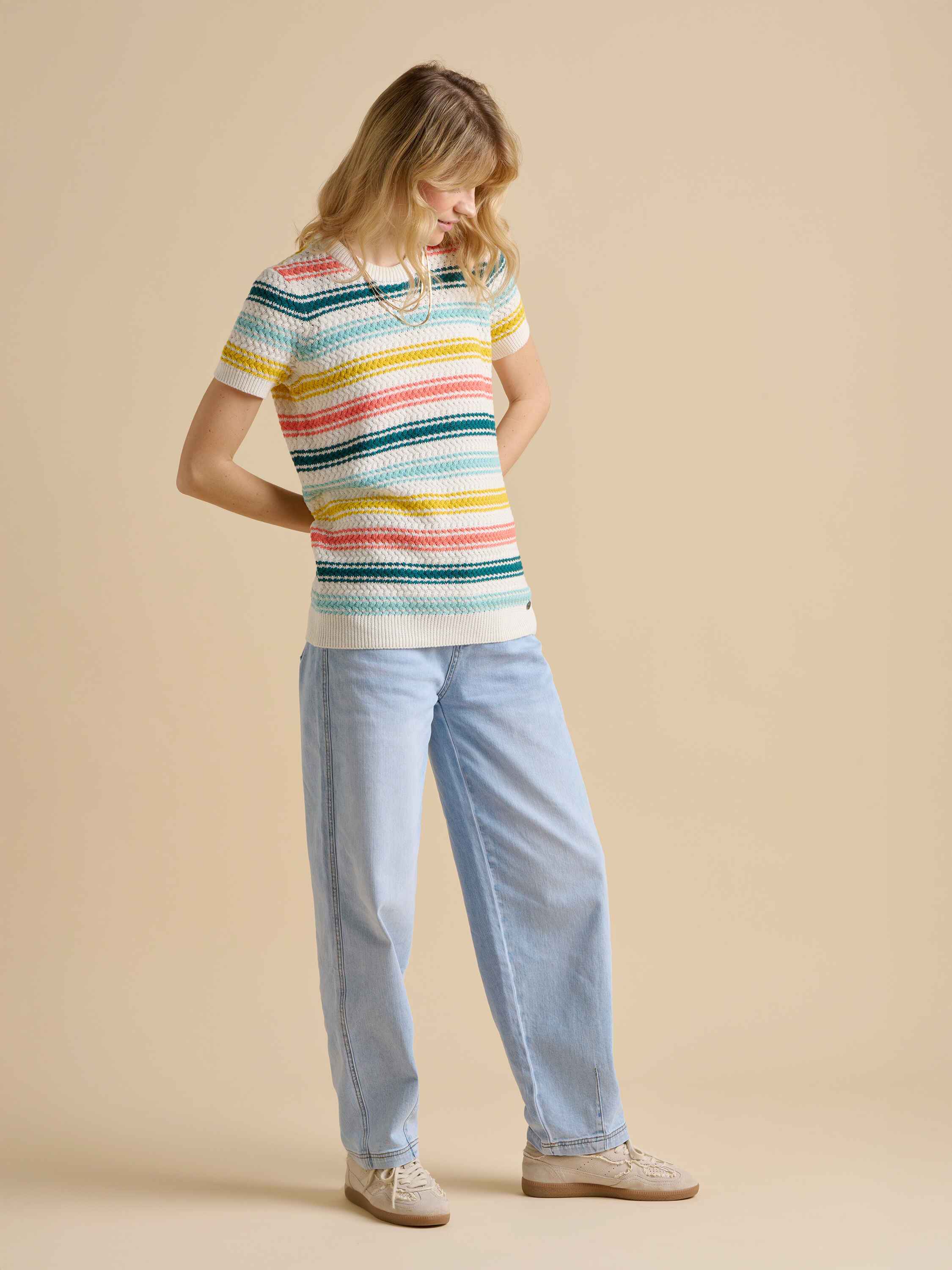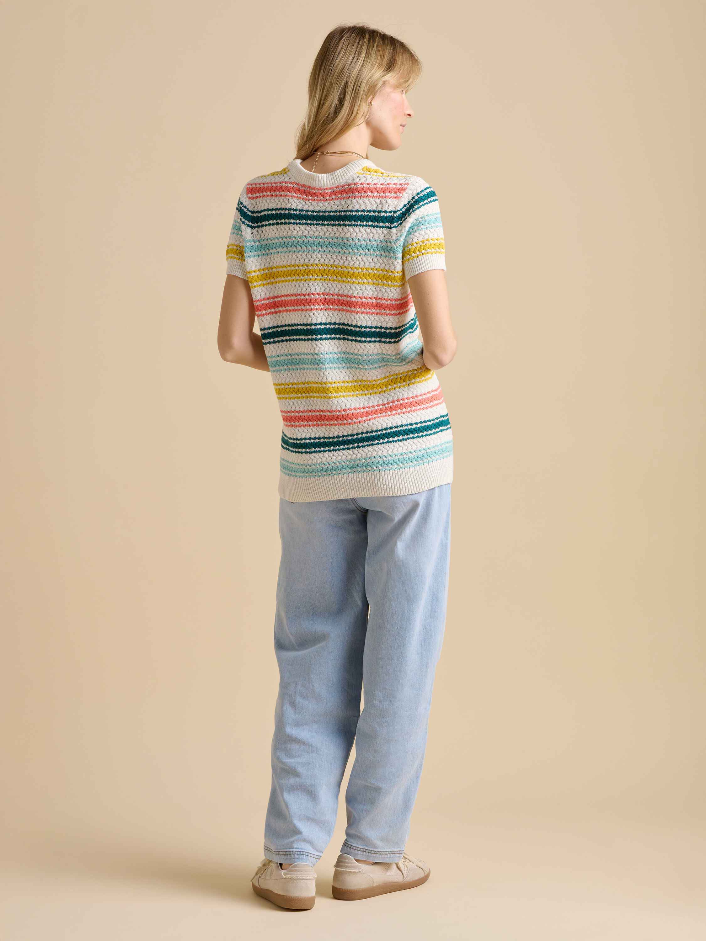 This knitted tee is playful with vibrant rainbow stripes that flow seamlessly into the sleeves. Its quirky design adds a fun, cheerful touch to your wardrobe, making it perfect for casual outings or when you want to brighten up any day with a splash of colour.100% Cotton