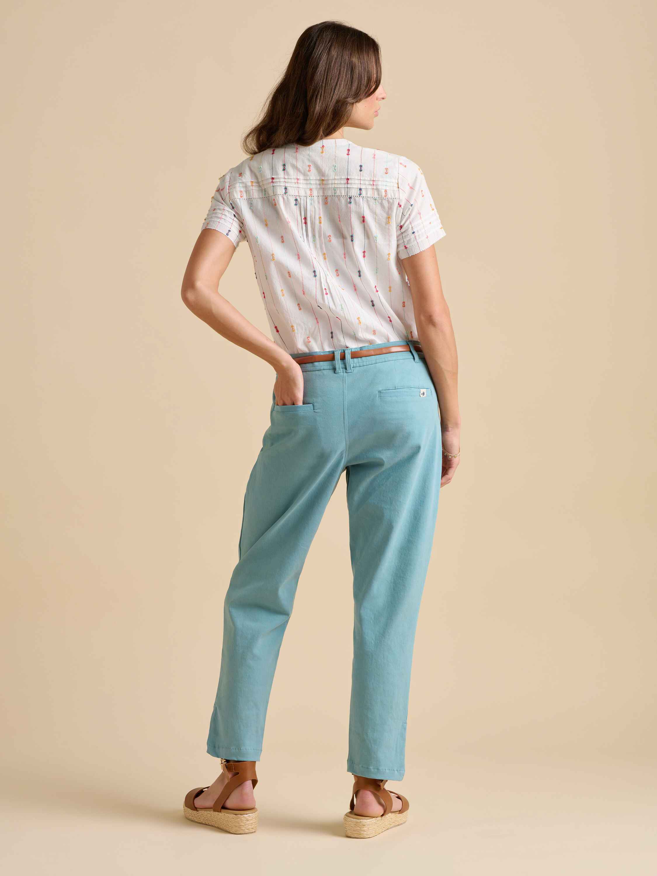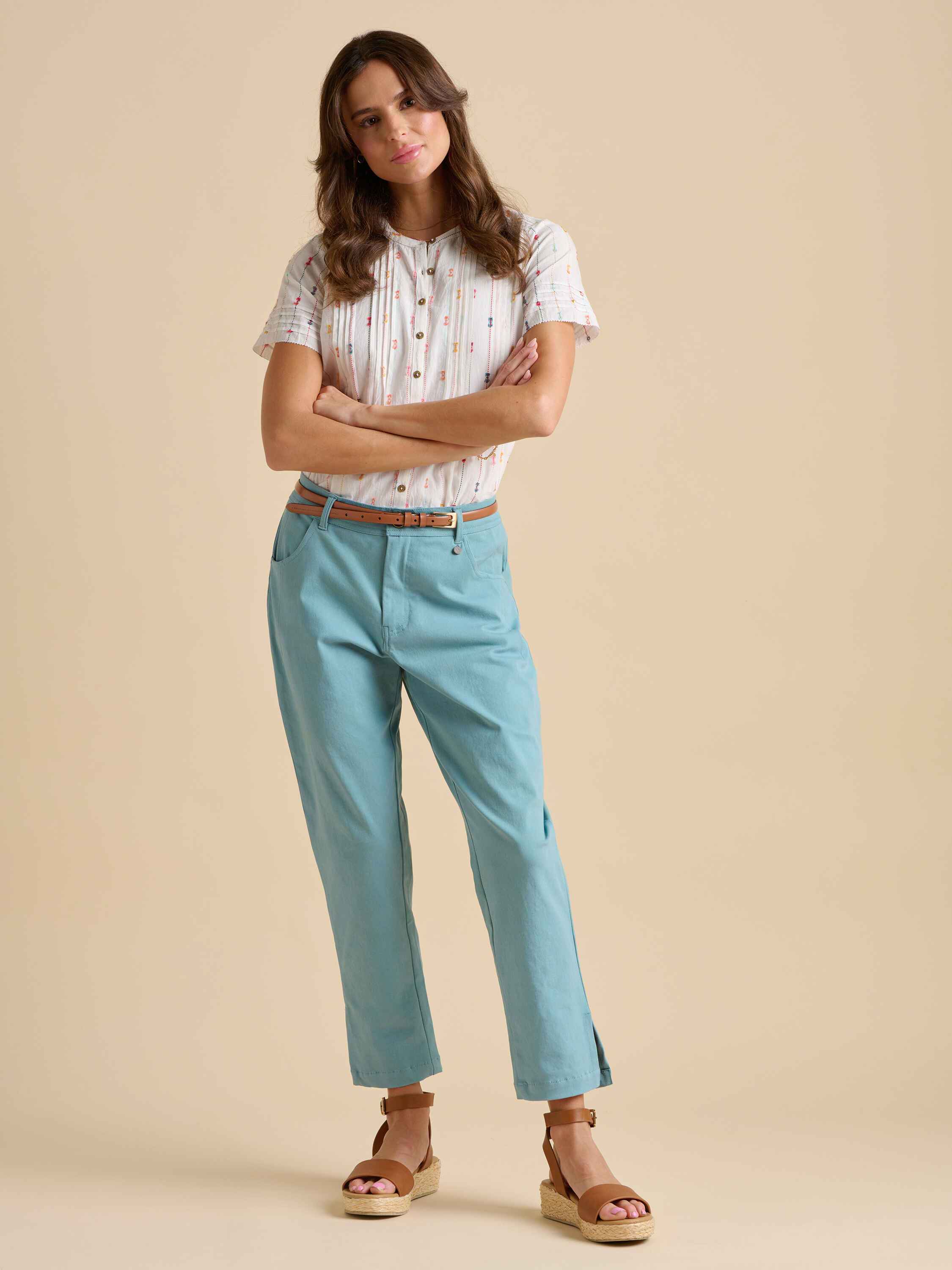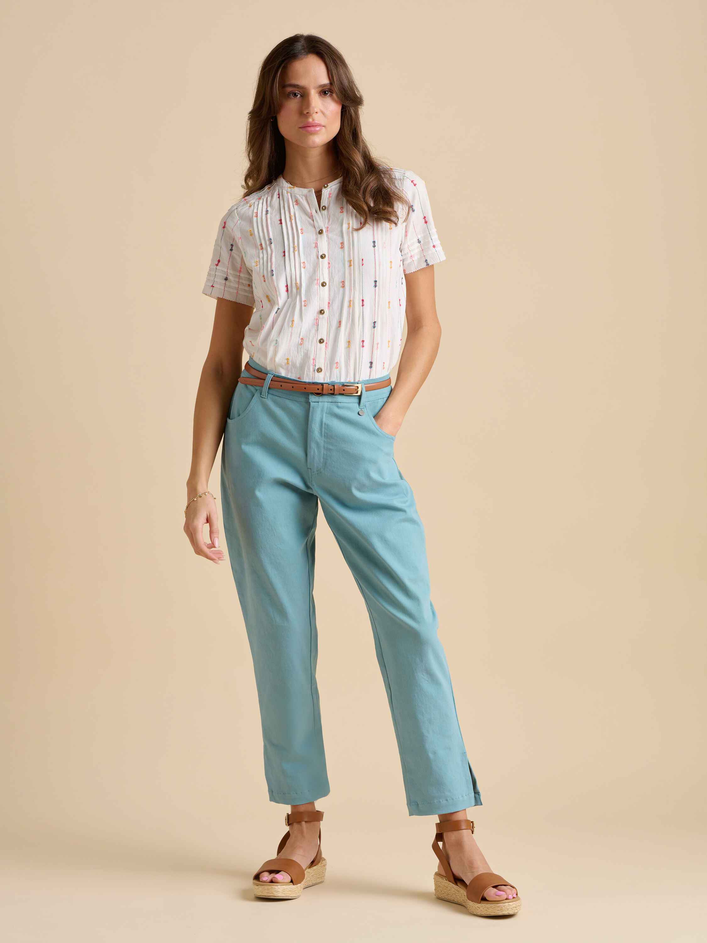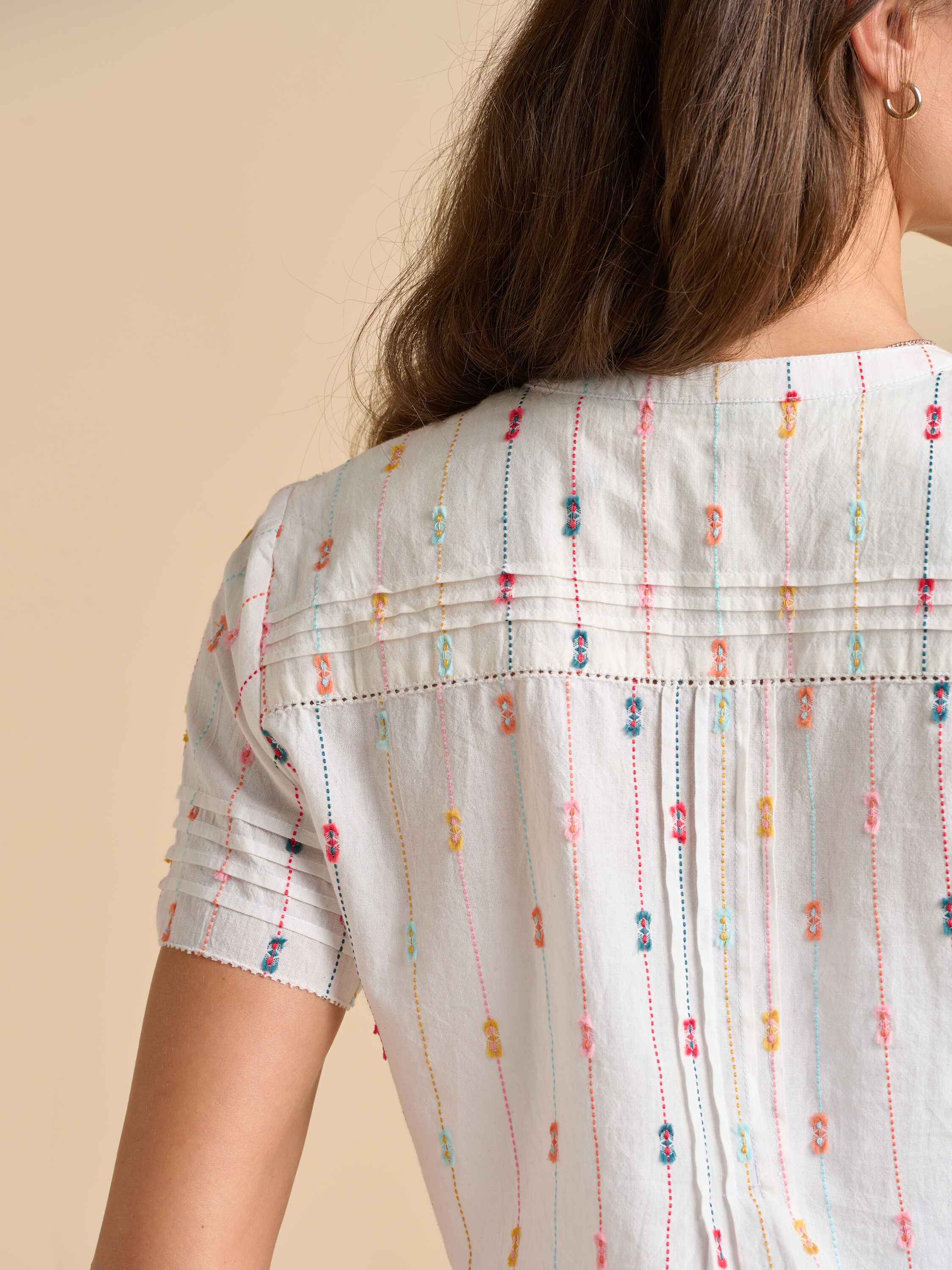 This artistic blouse features pleats, delicate embroidered stripes, and soft cuffs, creating a textured, creative feel. With pleats shaping the front and back, it’s perfect for a day of self-expression or a painter’s retreat - bringing both style and freedom to your day off.94% Cotton, 6% Polyester