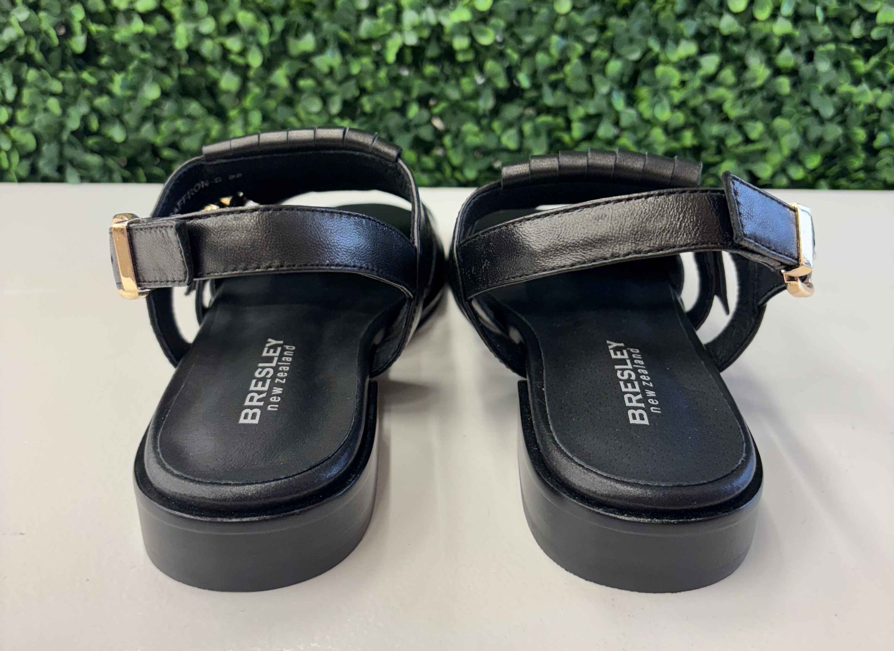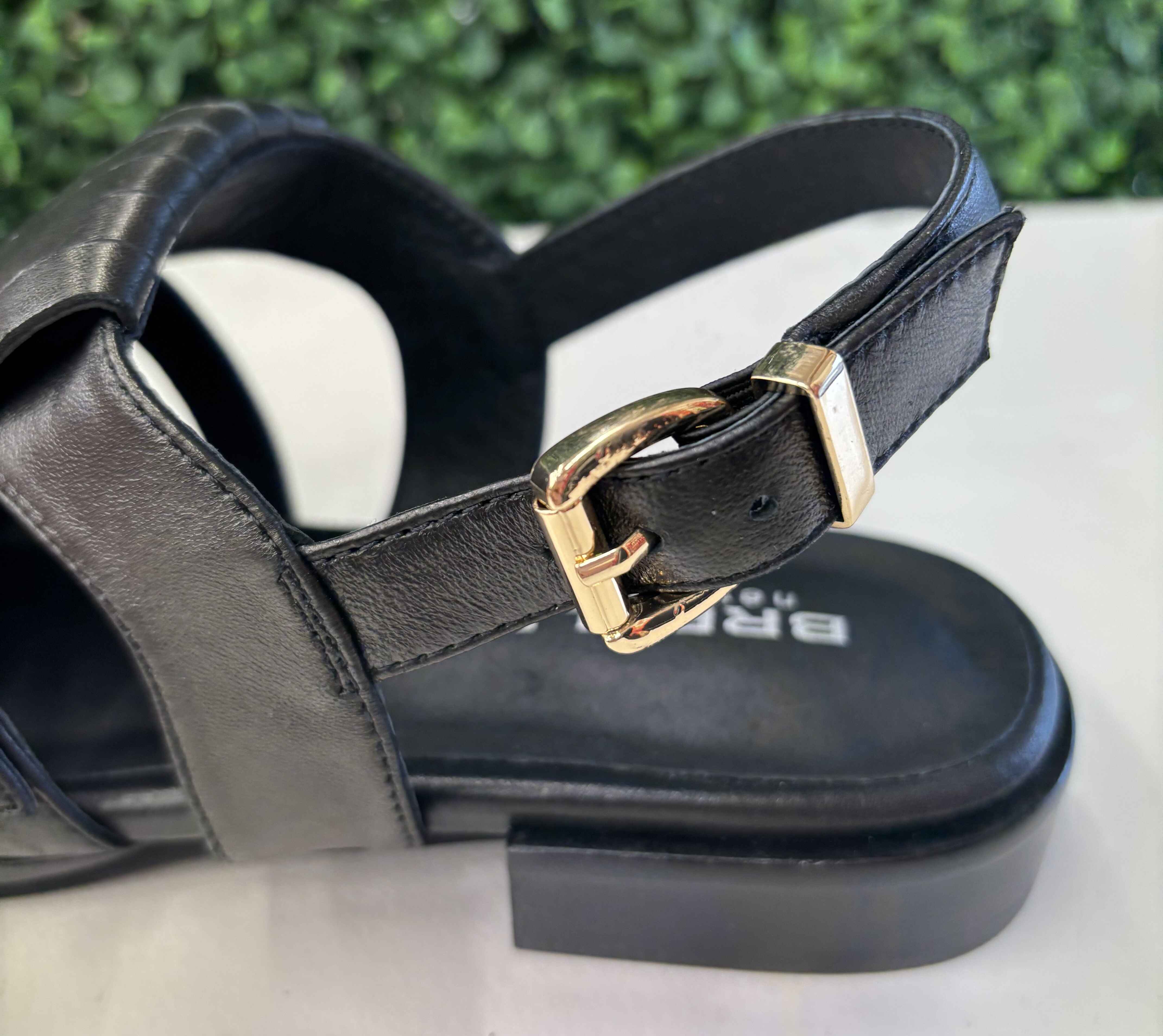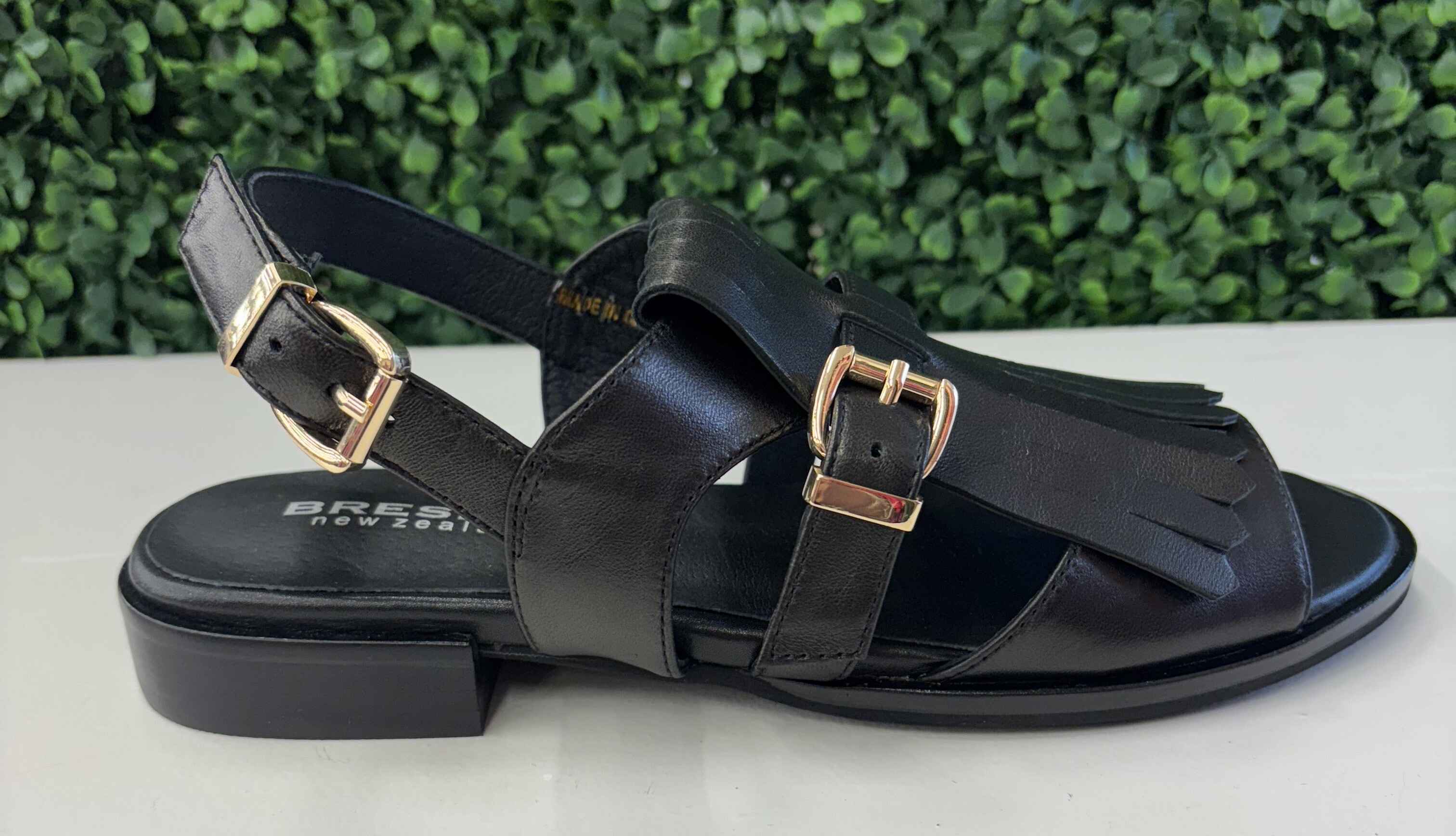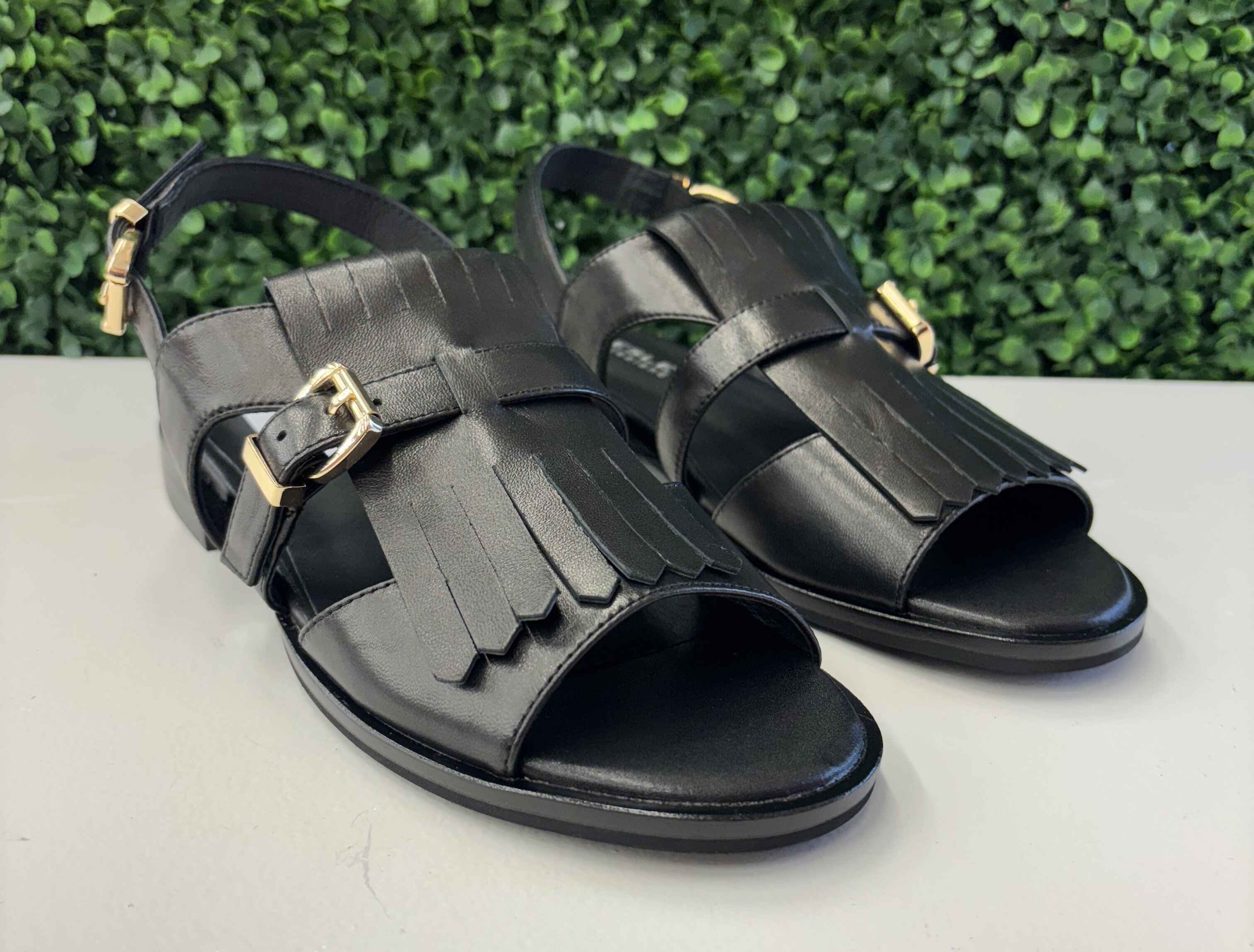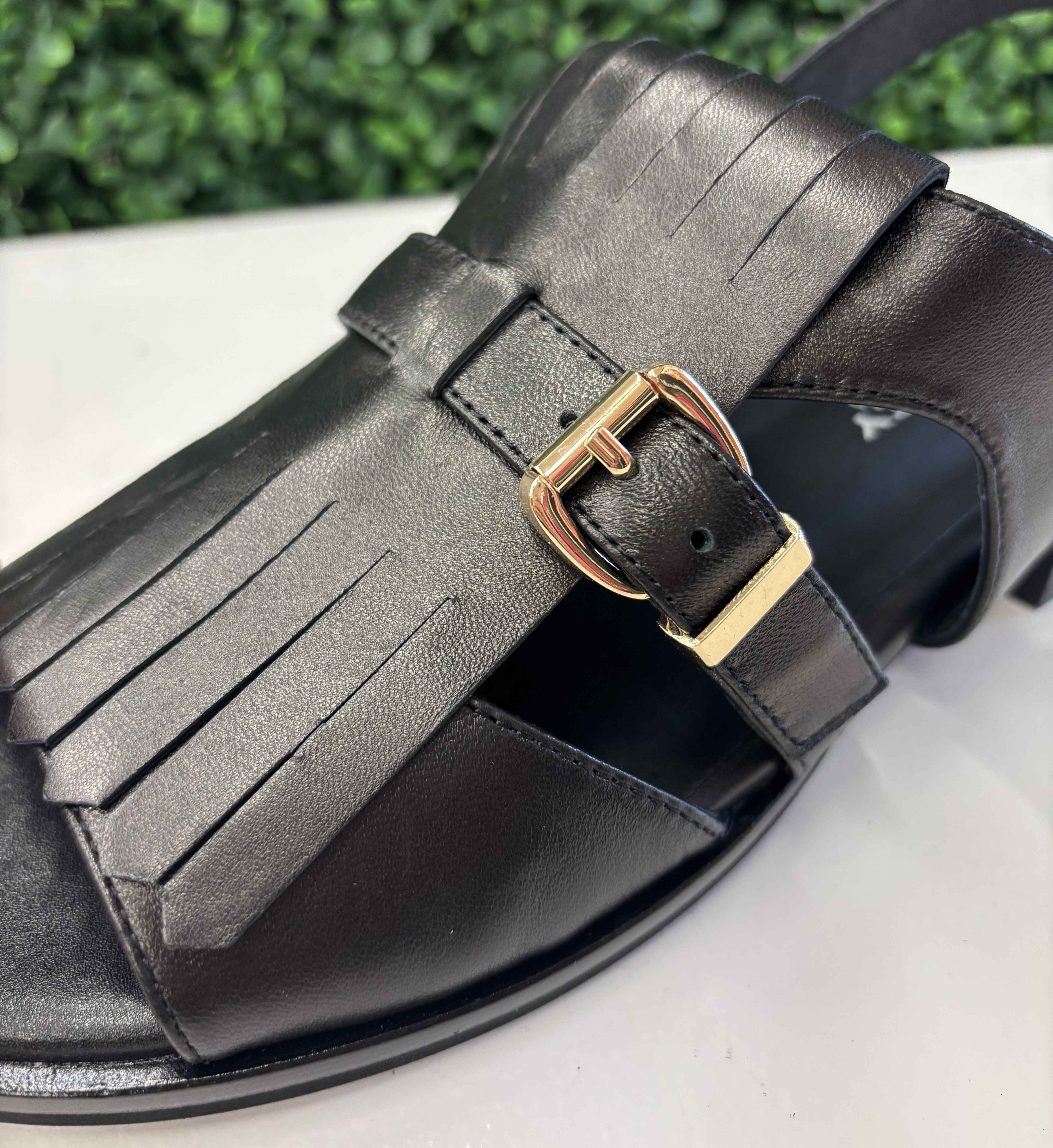 Classic with a modern twist, these black sandals are designed for effortless style and comfort. Featuring sleek crossover straps, a layered fringe detail across the front, and polished gold-tone buckles, they strike the perfect balance between chic and versatile. The flat sole and adjustable straps ensure an easy, comfortable fit for all-day wear.
