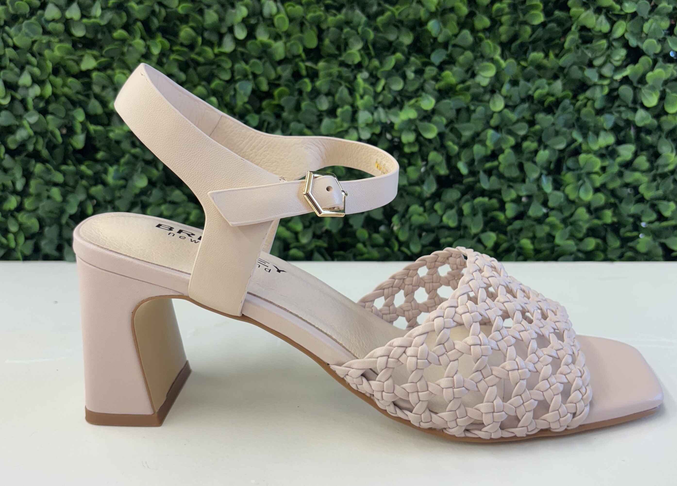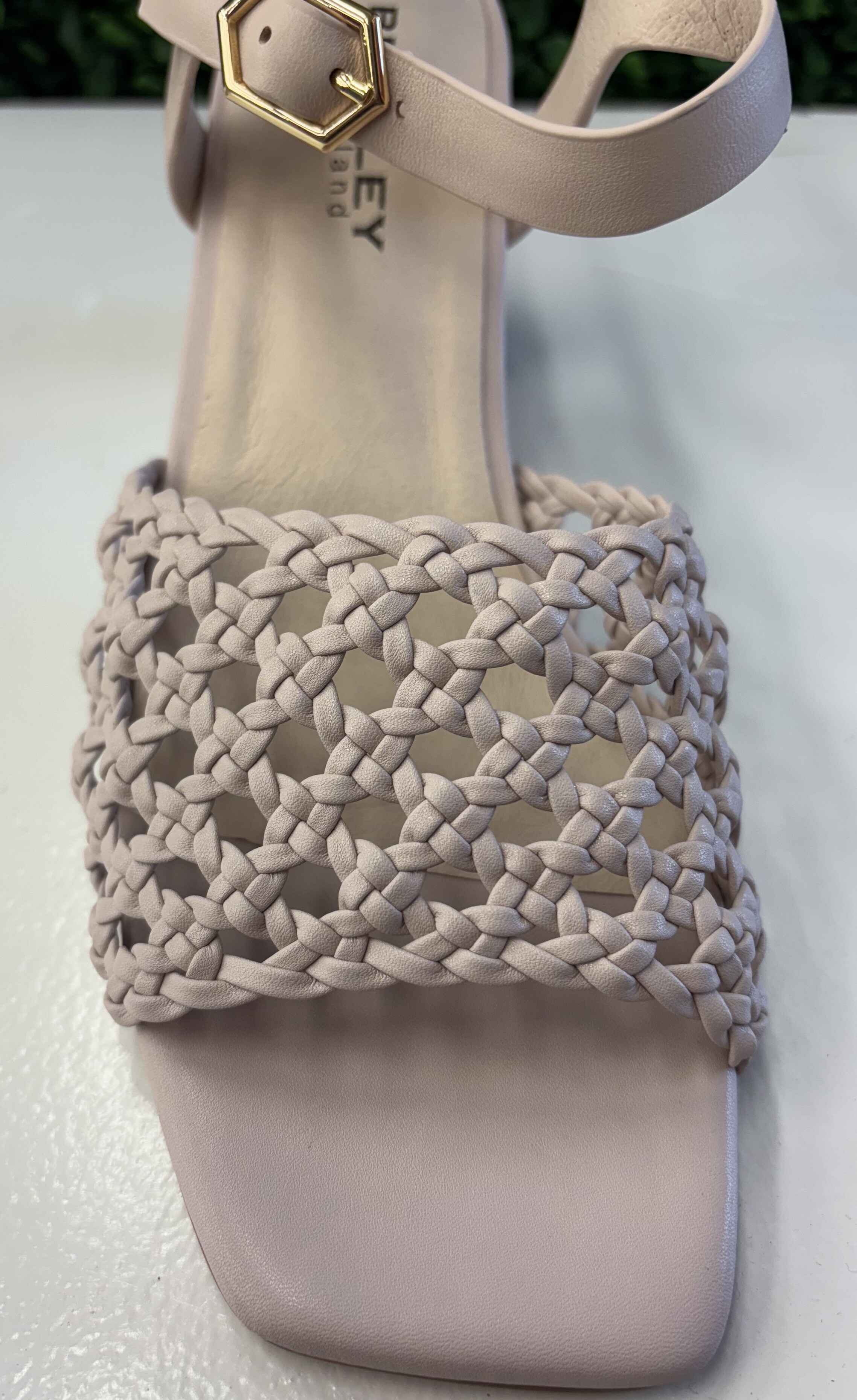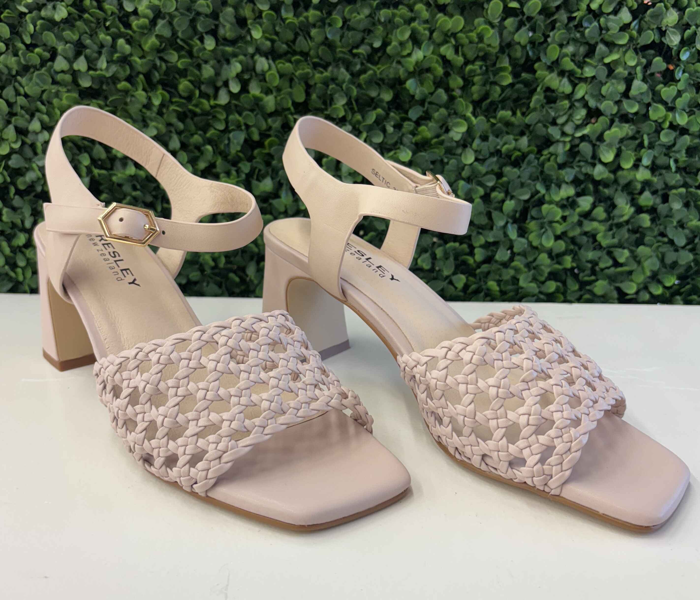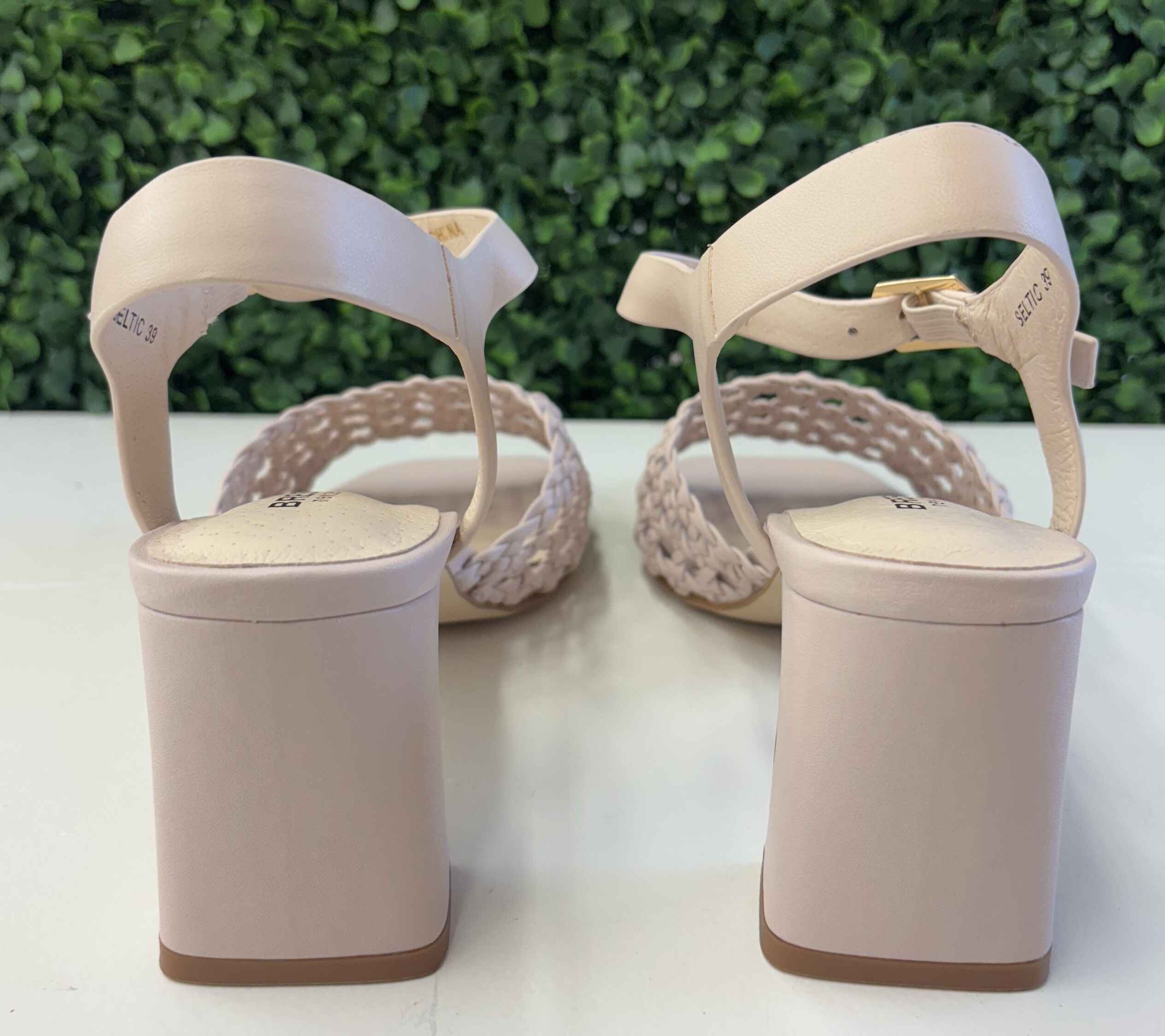 Elegant and versatile, these blush-toned block-heel sandals are designed to complement everything from casual daywear to evening looks. The standout feature is the wide woven strap across the front, adding texture and artisanal charm, while the ankle strap with gold-tone buckle offers a secure and polished finish. A mid-height block heel ensures comfort without compromising on style, making them perfect for all-day wear.