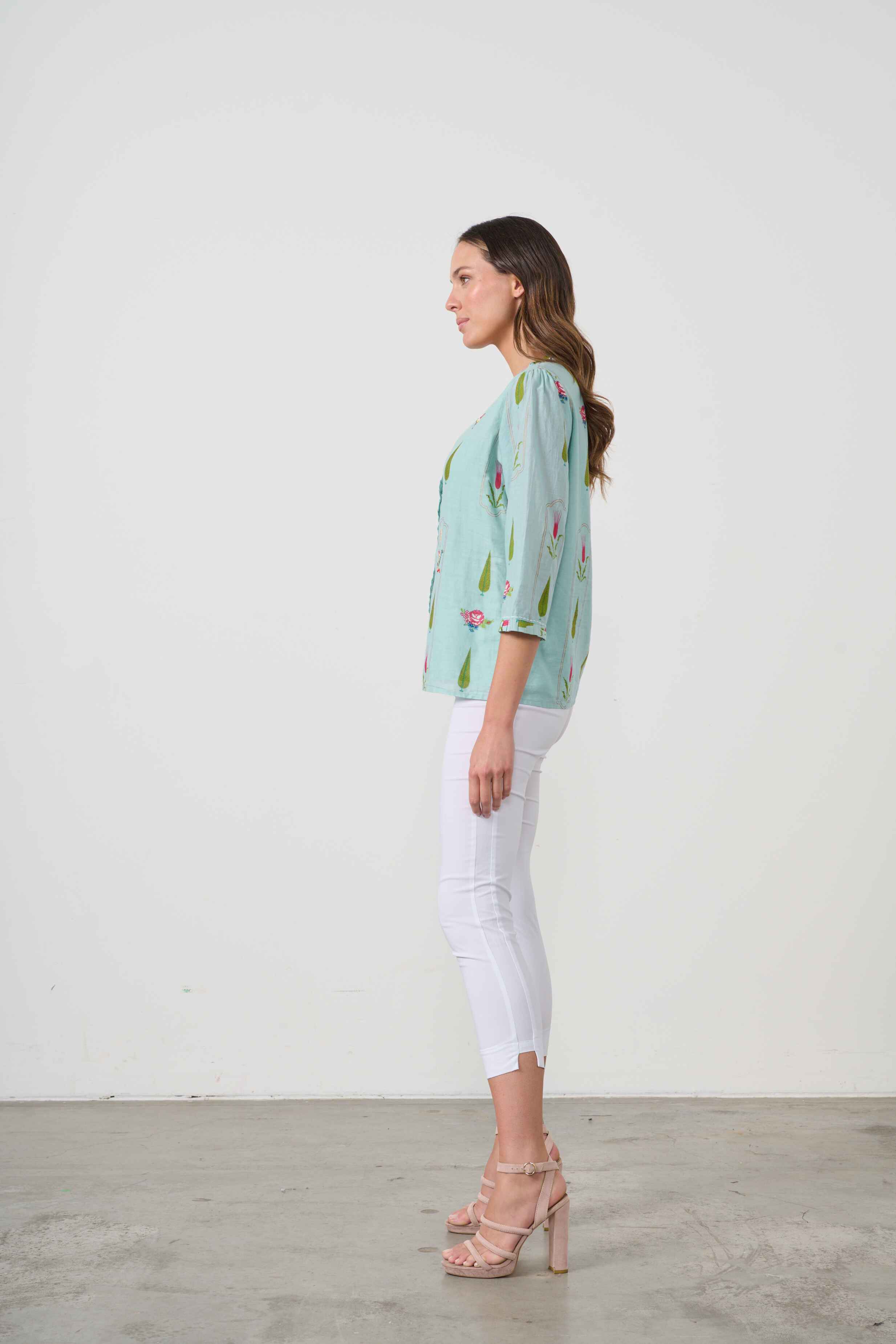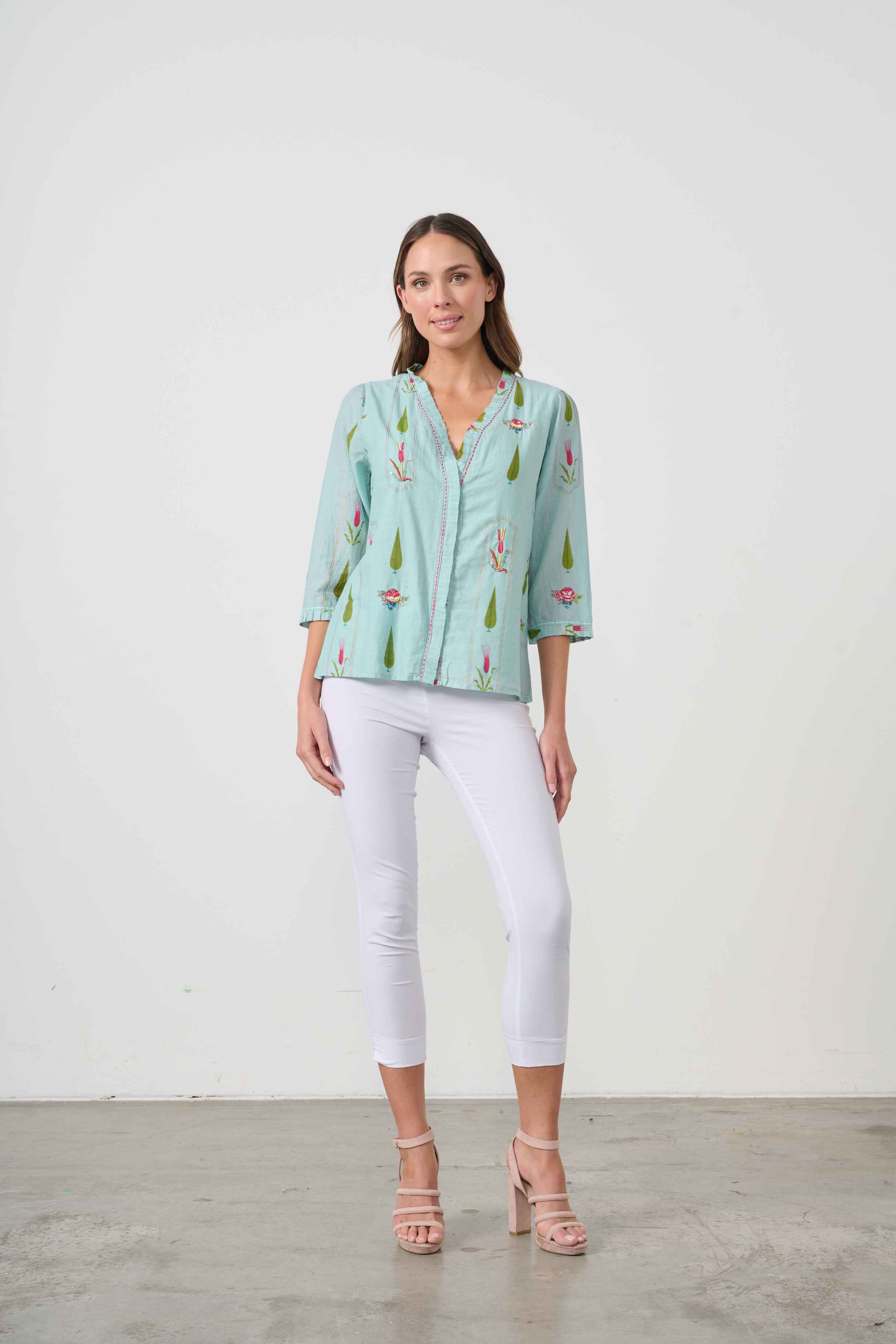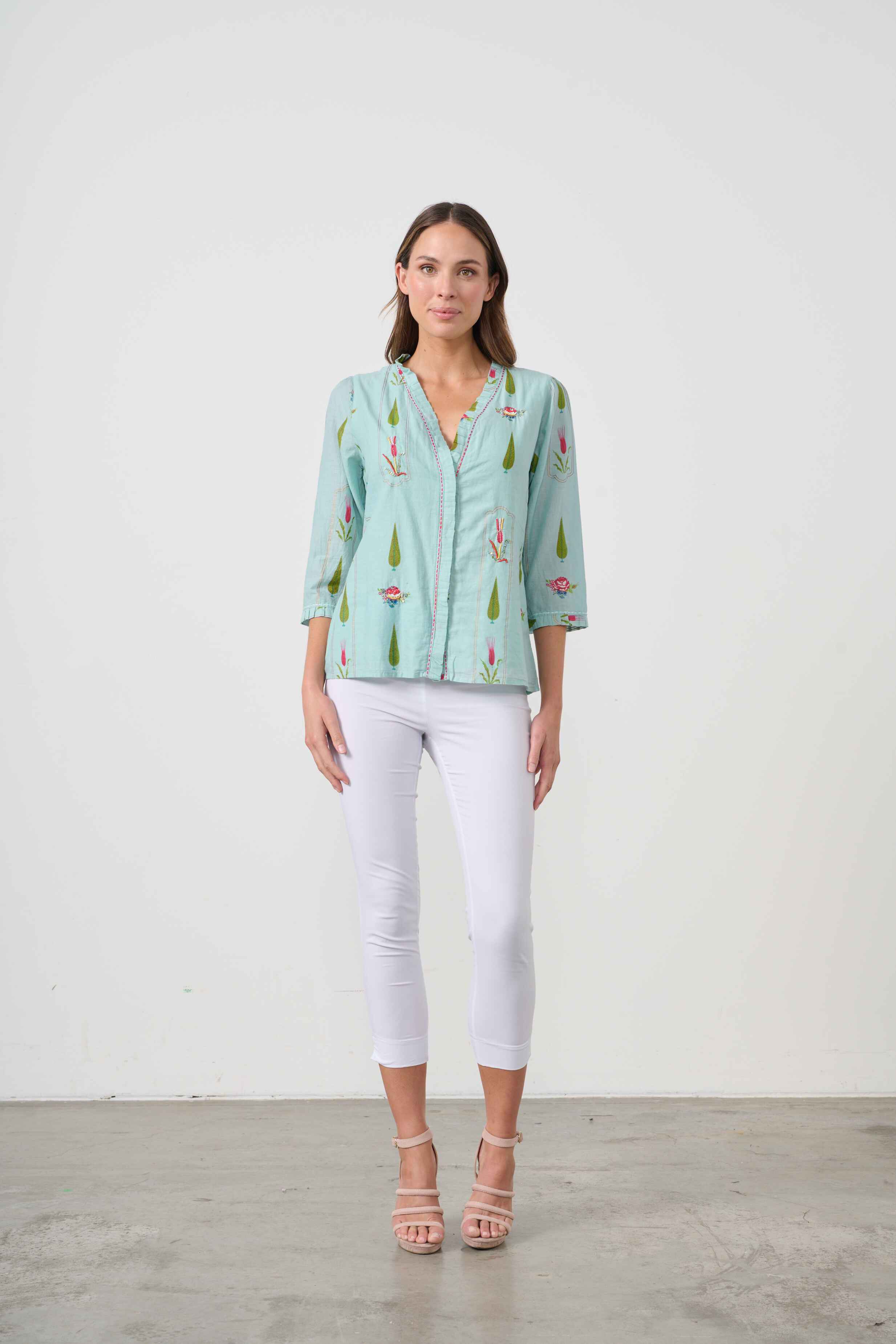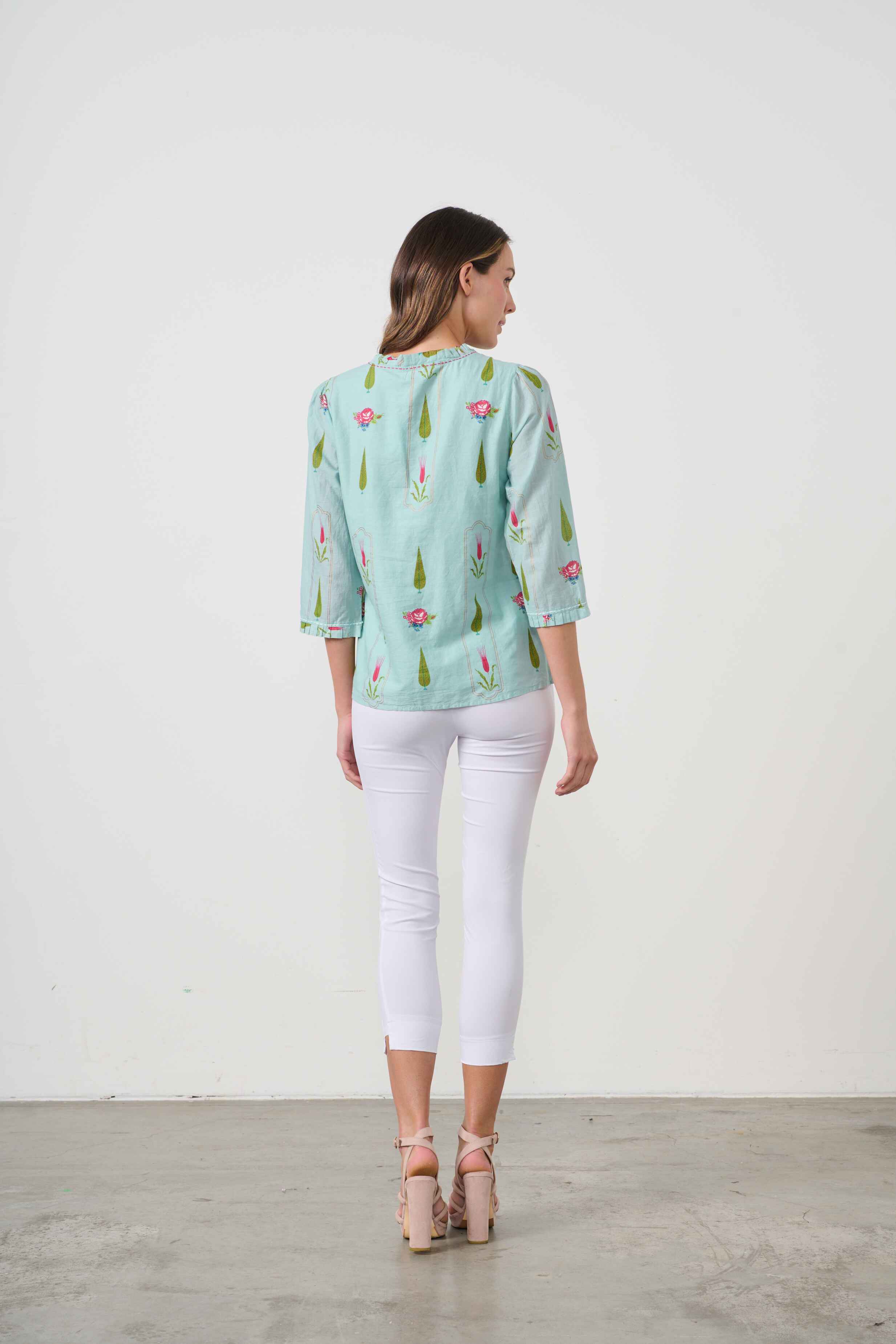 Fresh, feminine, and easy to wear. This aqua cotton blouse features delicate floral embroidery in pops of pink, green, and red, giving it a handcrafted, boho-inspired charm. The relaxed silhouette is finished with a split v-neckline and 3/4 sleeves, making it a breezy option for warm days.