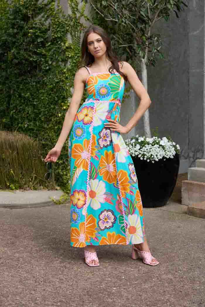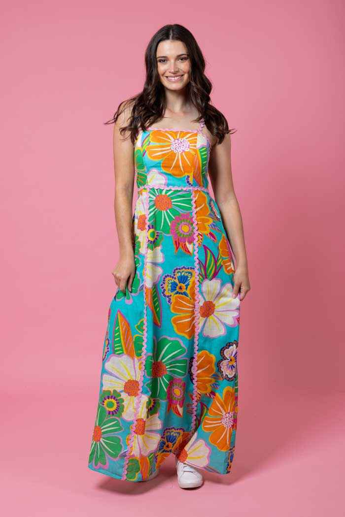 A vibrant teal floral design maxi with pink ric rac and a shoe string strap.