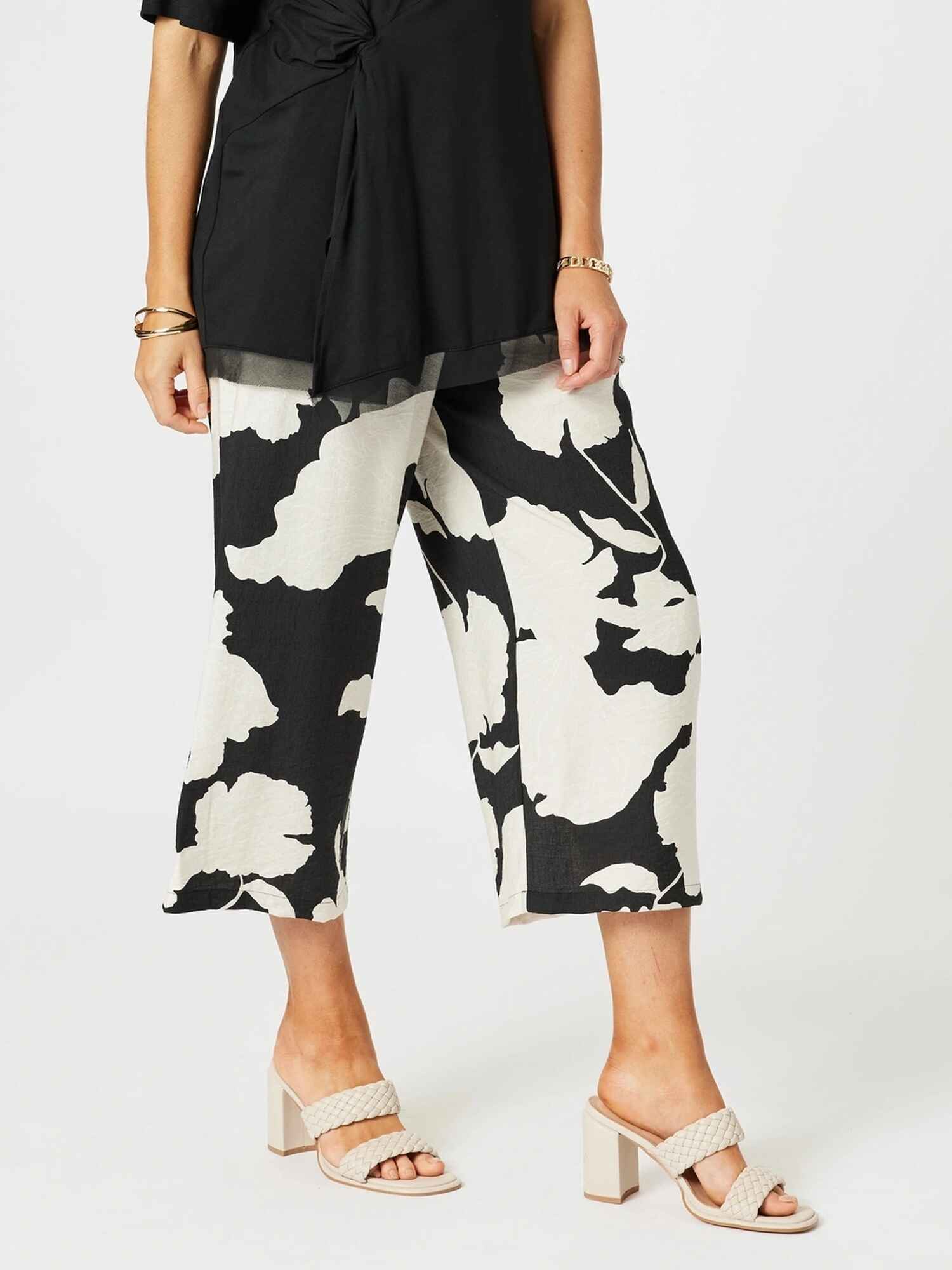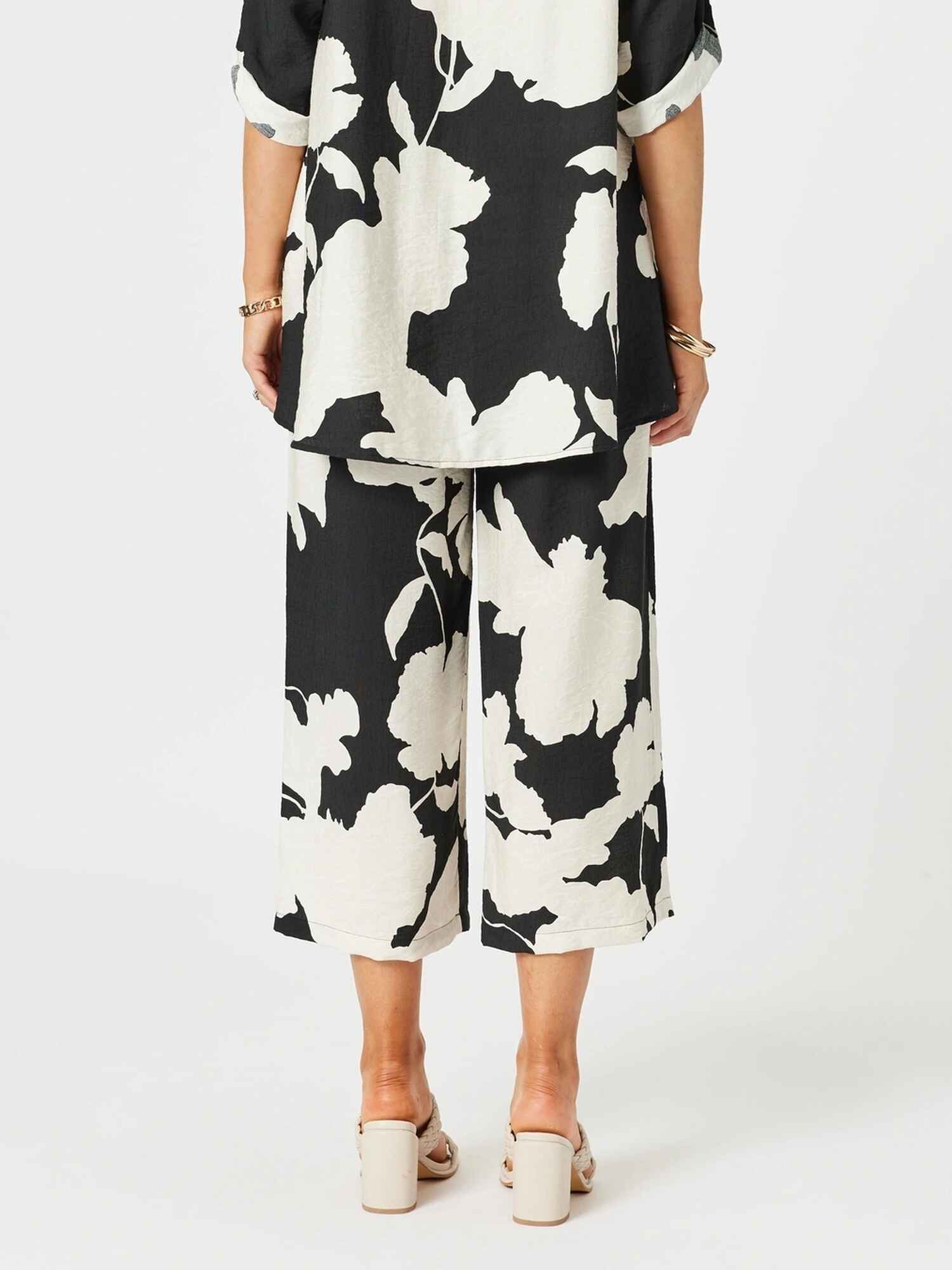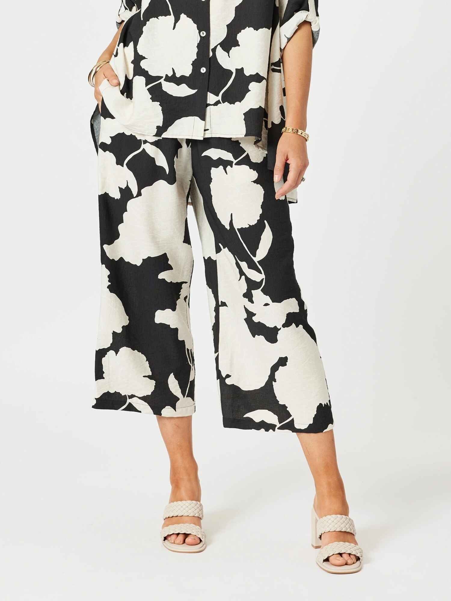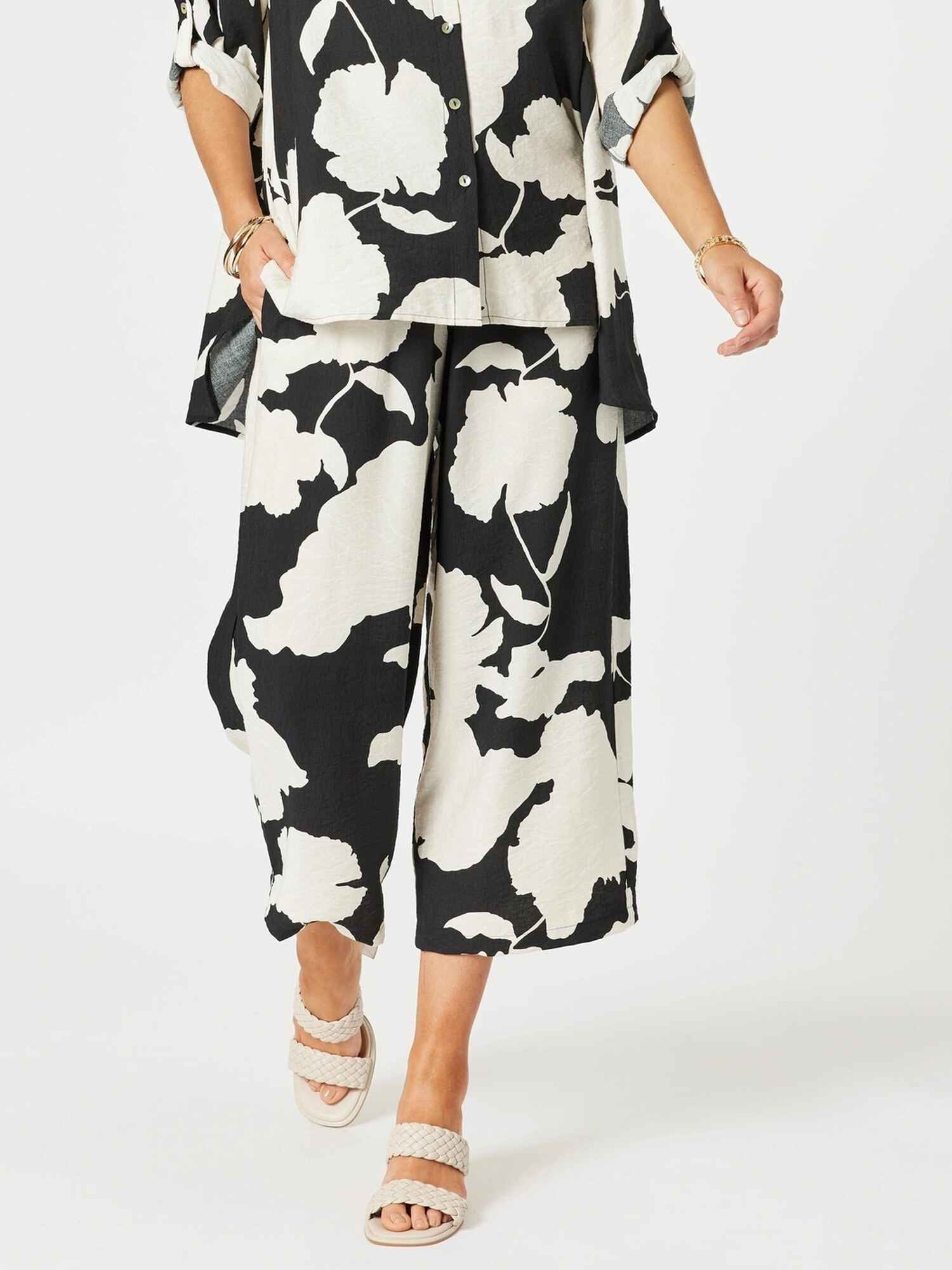 Step into effortless style with these black and natural wide-leg cropped pants. Showcasing a striking oversized floral print, these lightweight trousers offer a relaxed fit with a modern cropped length. Perfect for both casual days and elevated evenings, they can be paired with the matching shirt for a coordinated look or styled simply with a solid top.