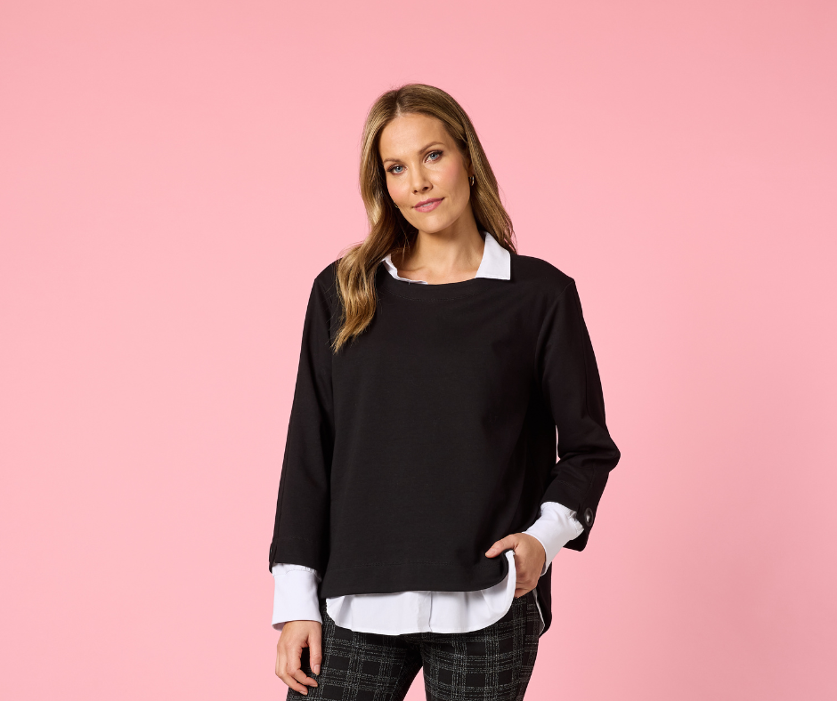 True to sizeRelaxed fitSubtle curved hem - longer in the back¾ sleeves