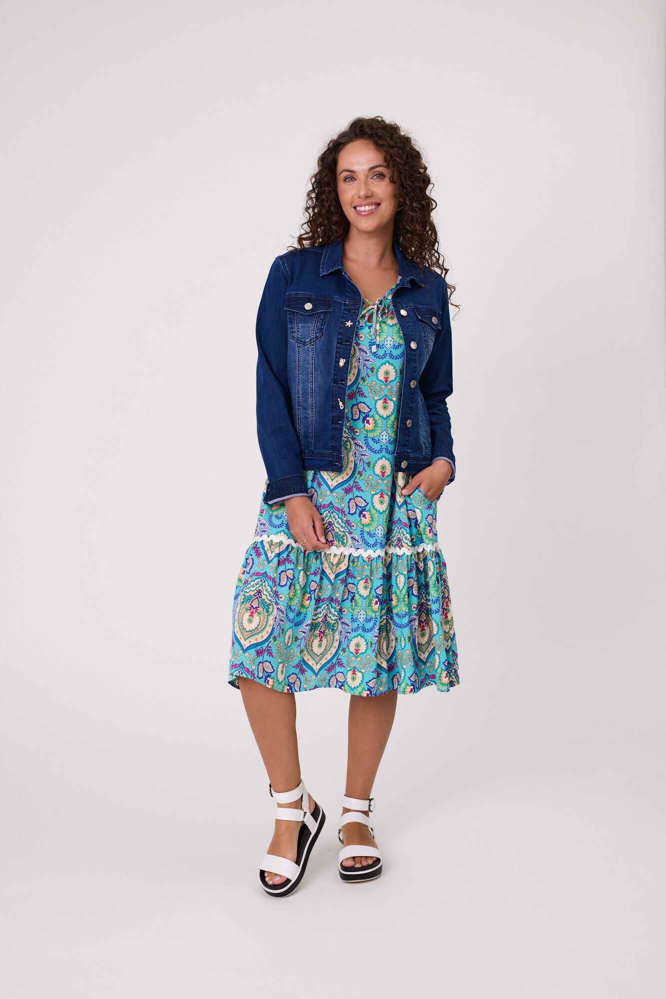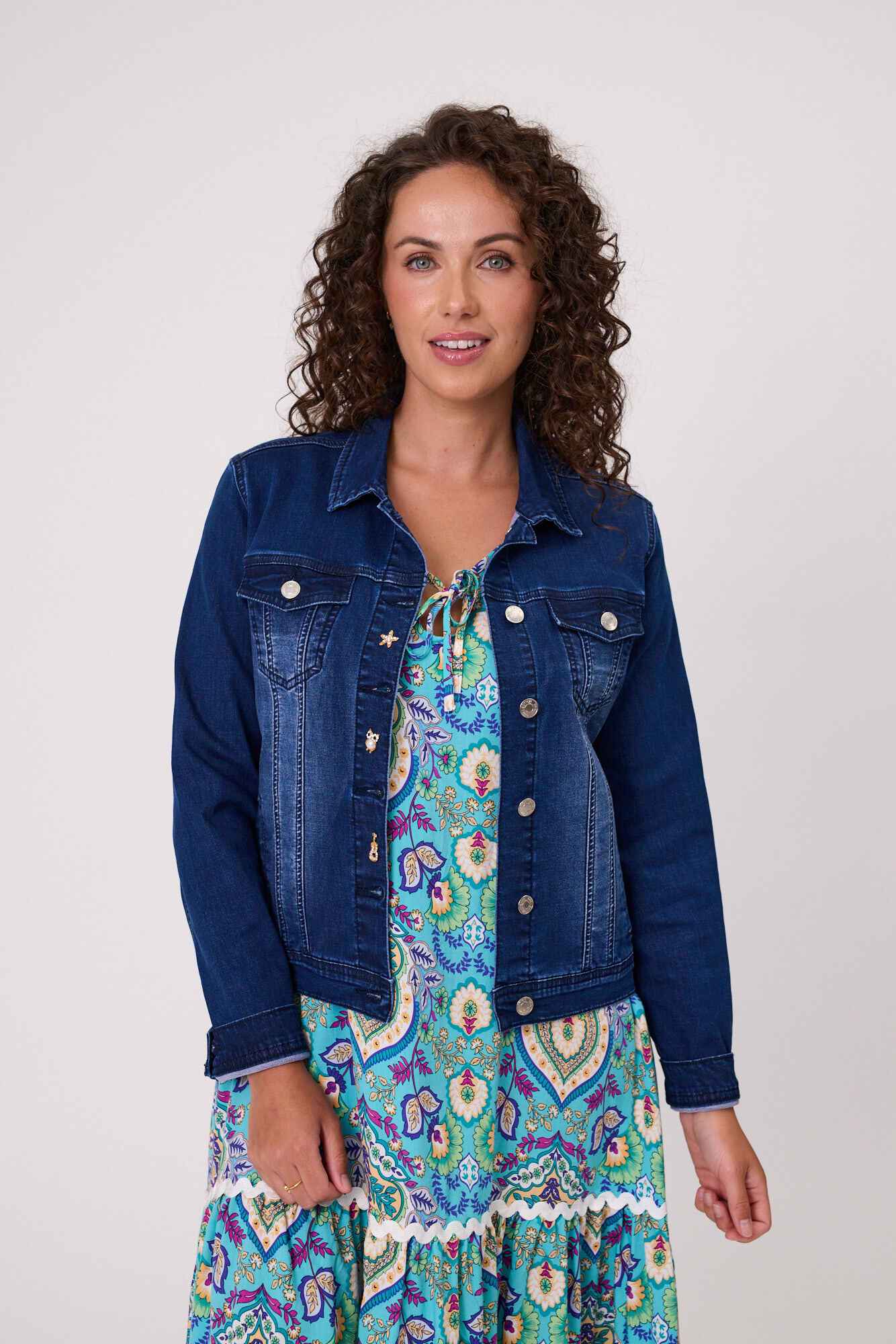 A modern stretch denim jacket offering timeless appeal and polished layering.