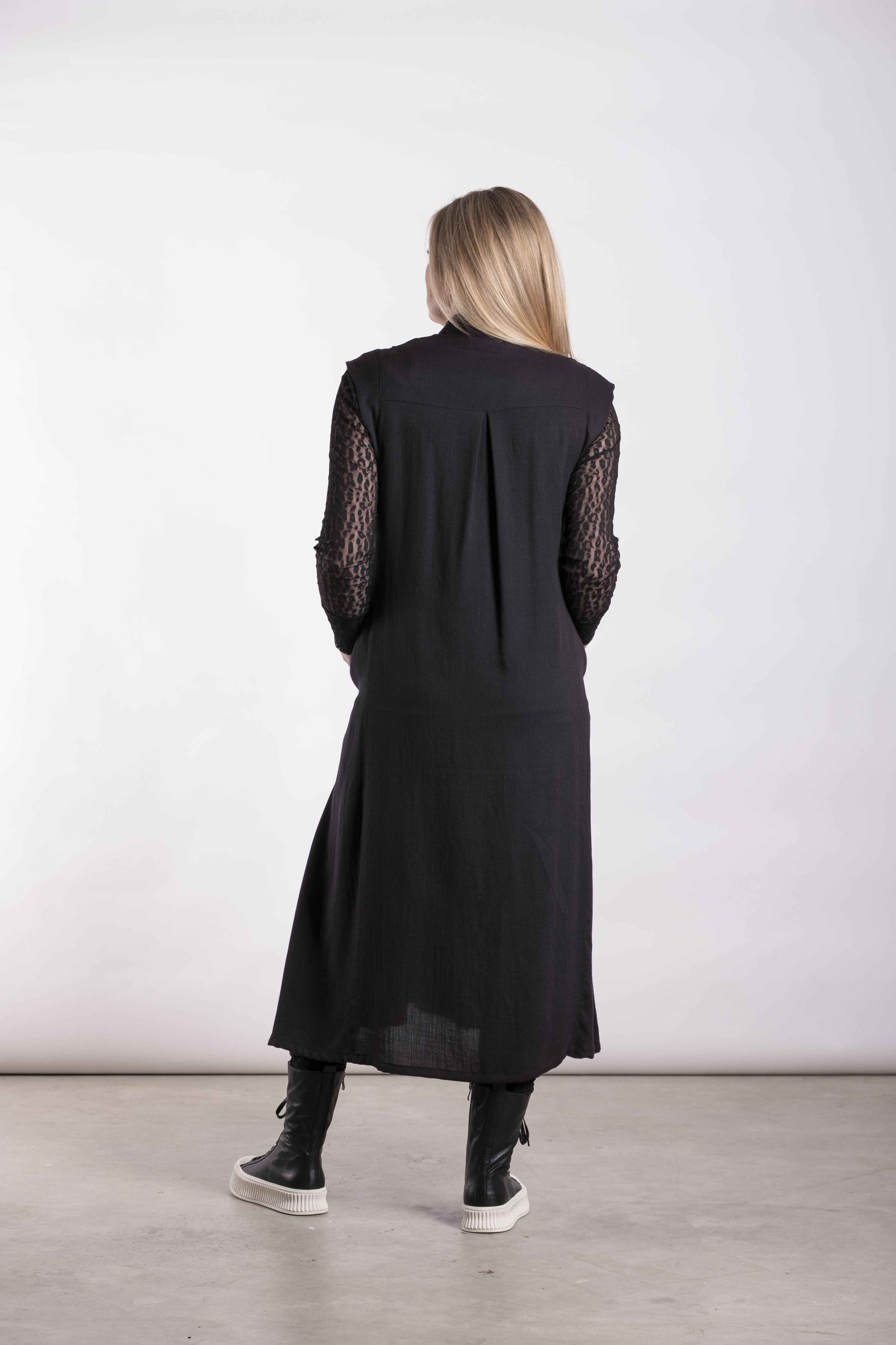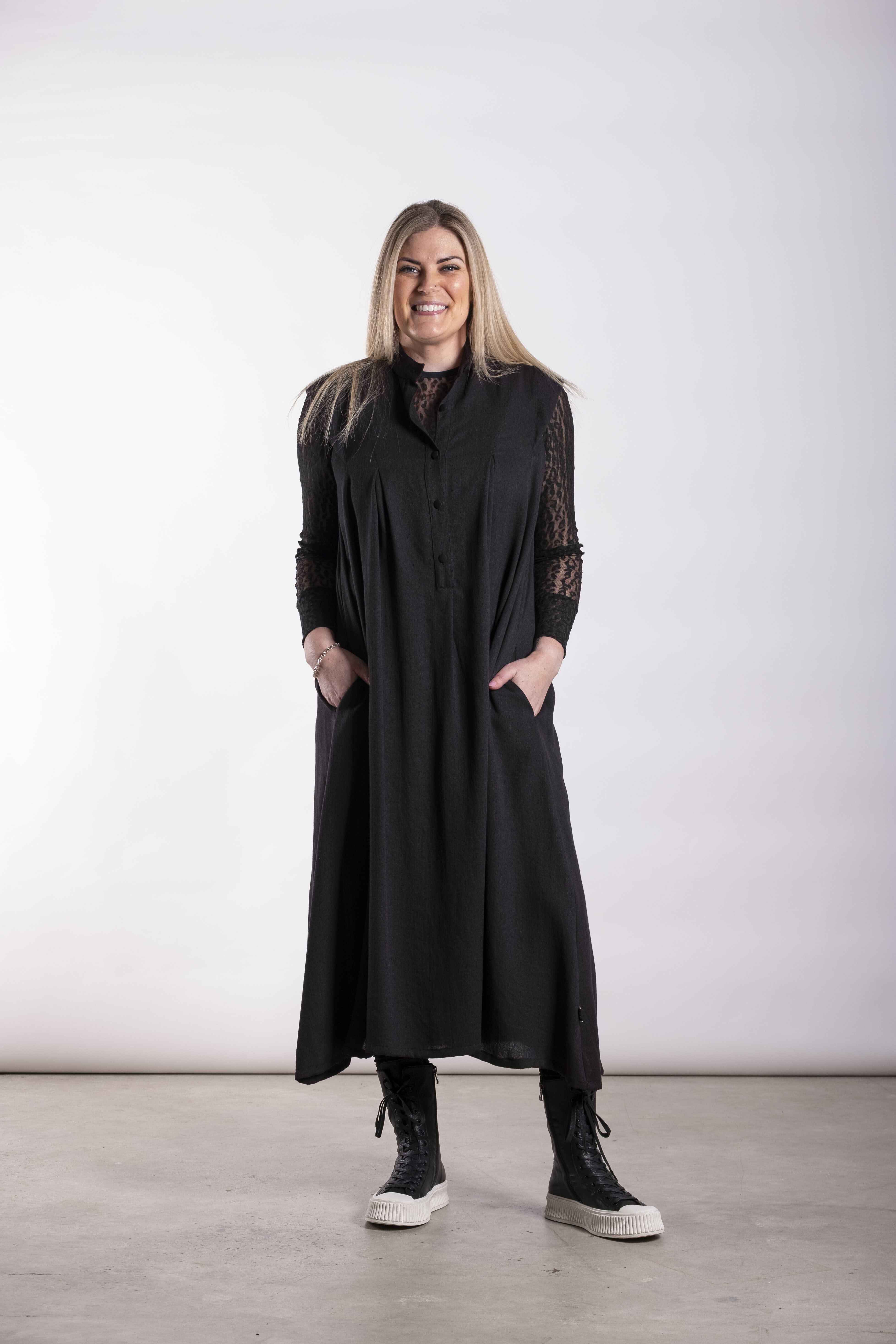 Key Features• Relaxed fit through the body• Soft V-shaped neckline with clean finish• Front pleat detailing for shape and movement• Sleeveless design for easy layering• Softly flared skirt• Inseam side pockets• Midi length• Easy pull-on styleFabric: Rayon / NylonCare Instructions:Wash inside out, cold gentle wash with similar colours. Do not soak or bleach. Line dry in shade, do not tumble dry. Dry cleanable. Always check the label.