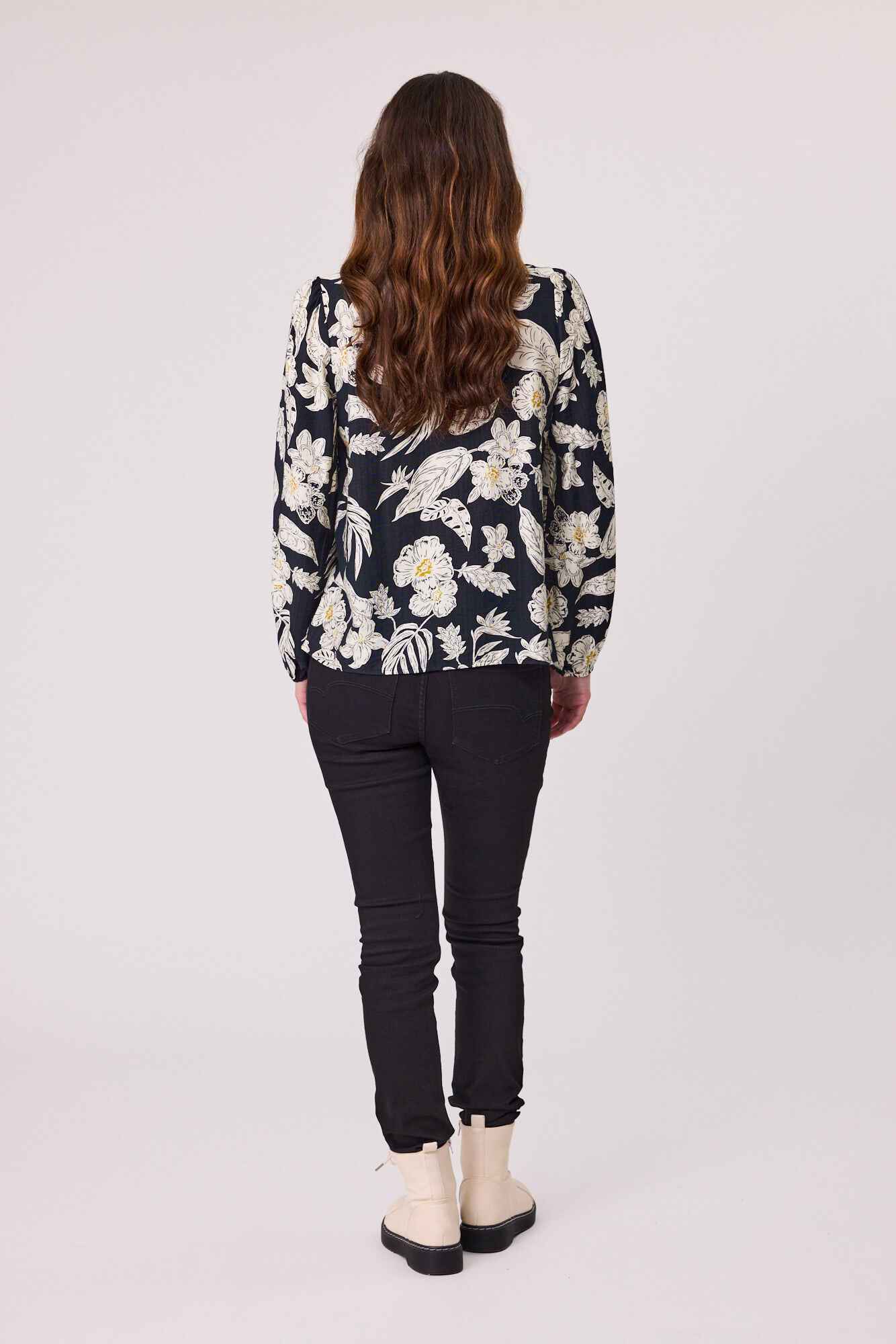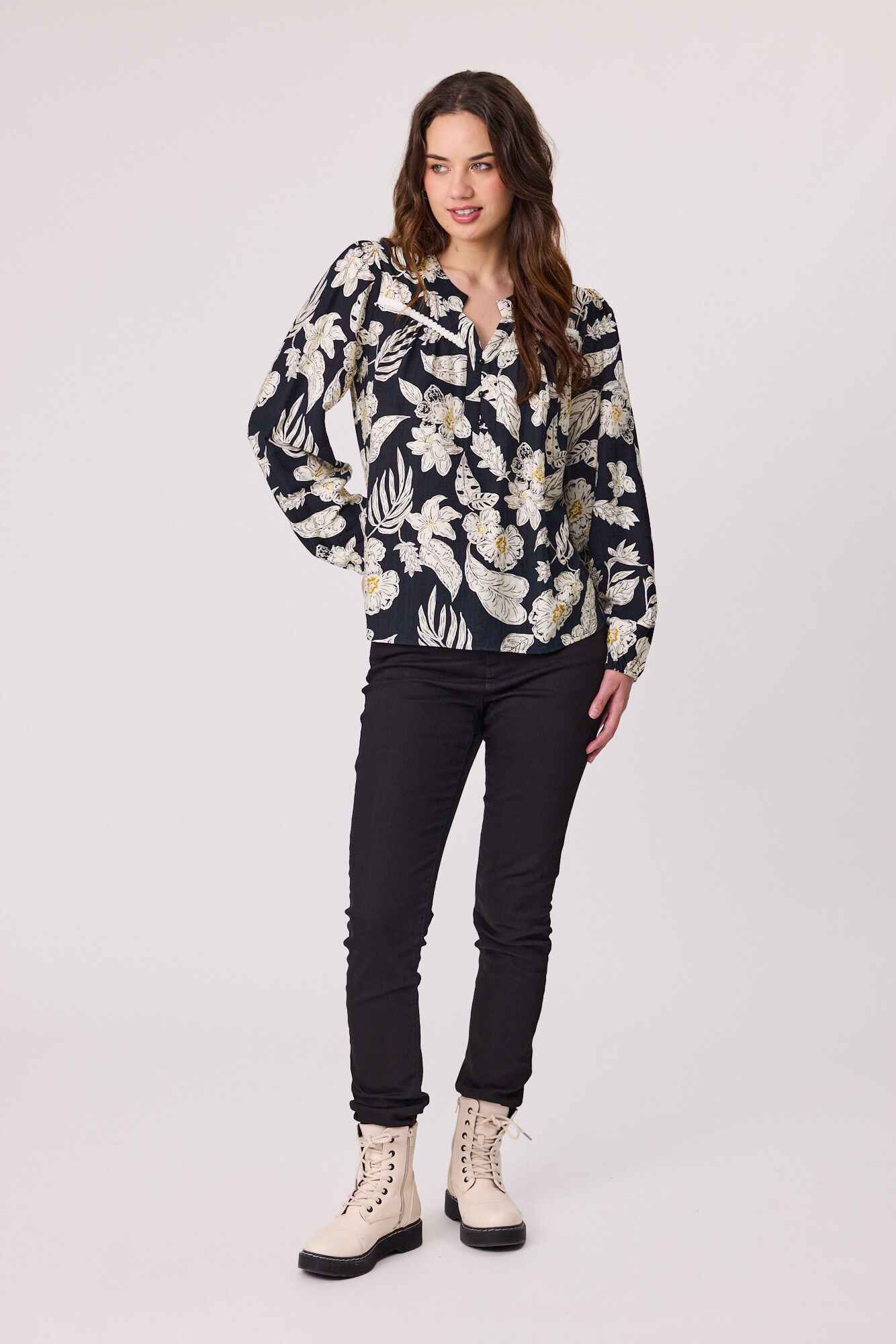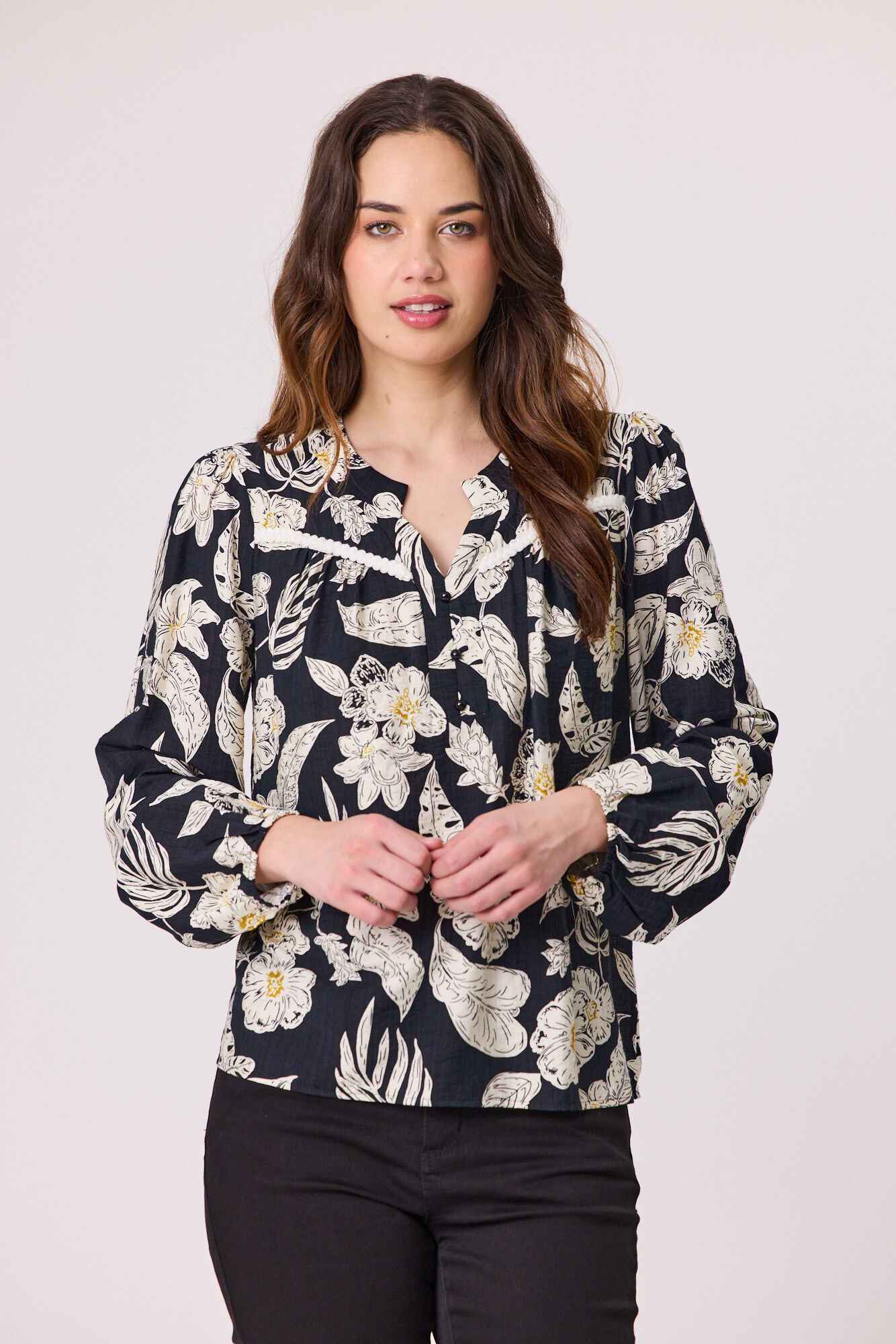 A chic mock button-front blouse featuring delicate trim detailing on the yoke for an elevated touch. Designed with elasticated long sleeves for comfort and subtle volume, it’s perfect for both everyday wear and dressier occasions.90% Viscose/10% Nylon
