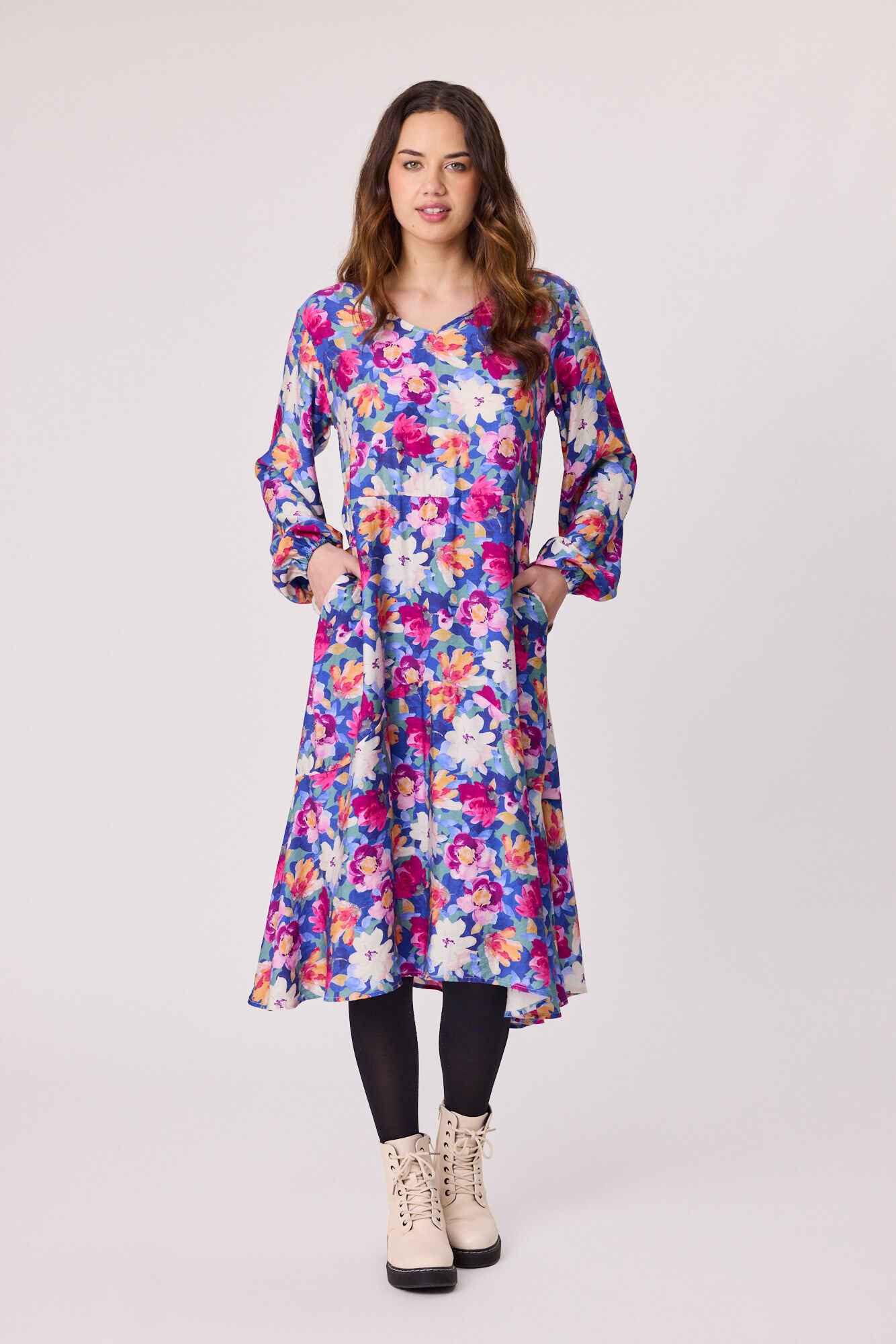 A stylish printed woven dress featuring long sleeves, practical side pockets, and a flattering shaped hem. Designed for comfort with an easy silhouette, it’s perfect for both everyday wear and effortless dressing up.