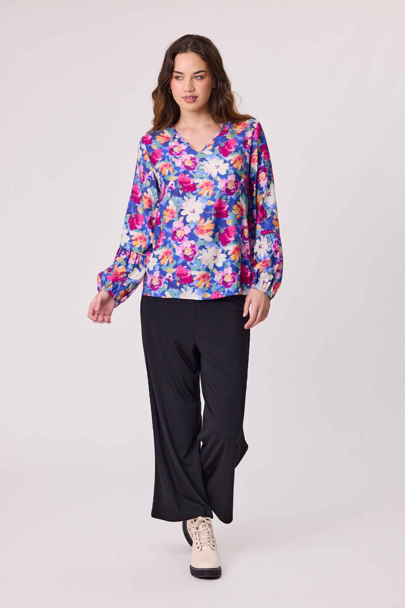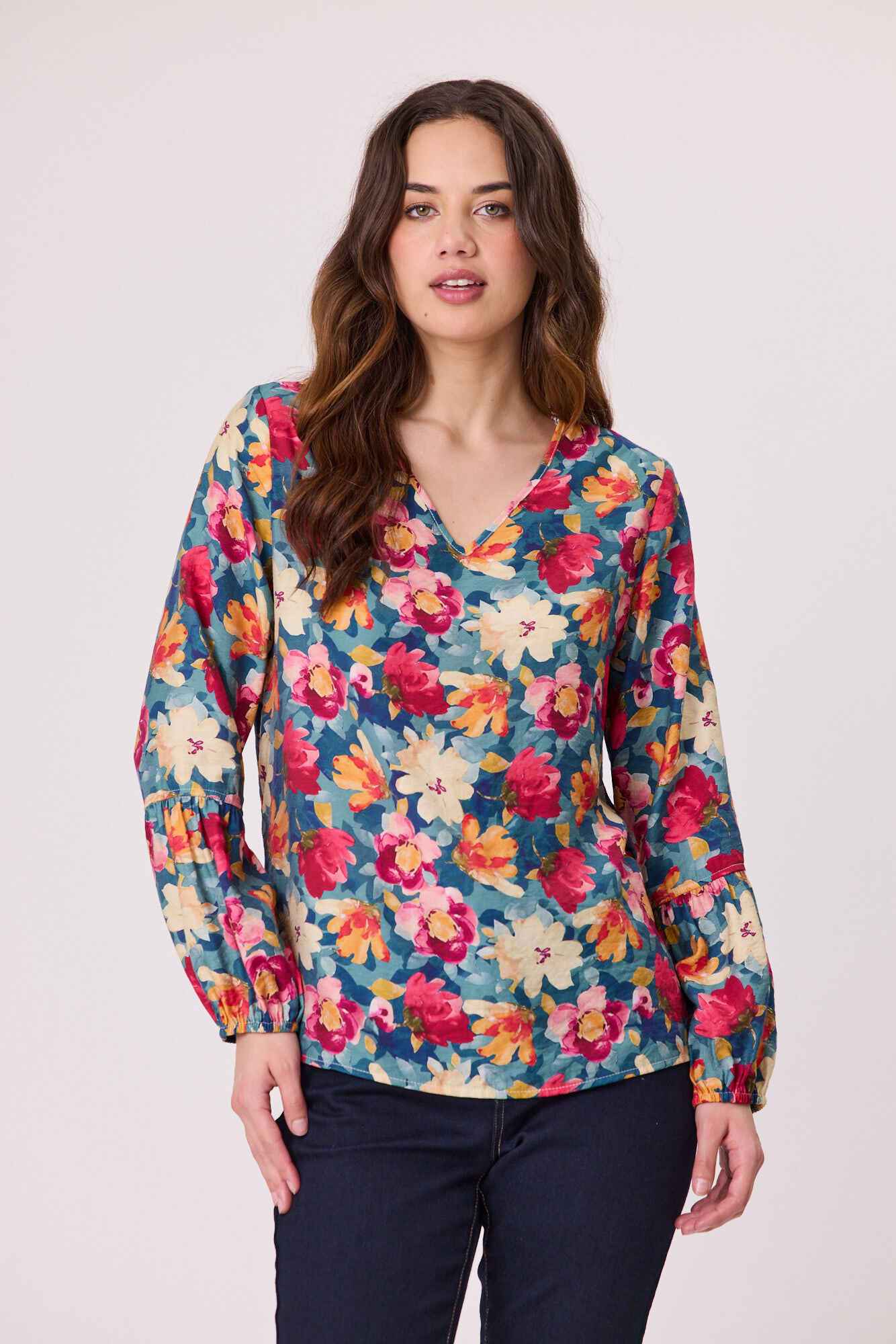 A versatile V-neck blouse featuring 3/4 sleeves with elasticated cuffs for a comfortable, flattering fit. Designed with a clean silhouette, it’s perfect for both workwear and everyday styling.