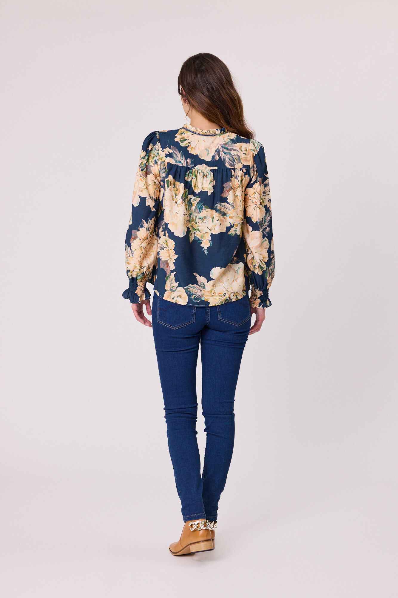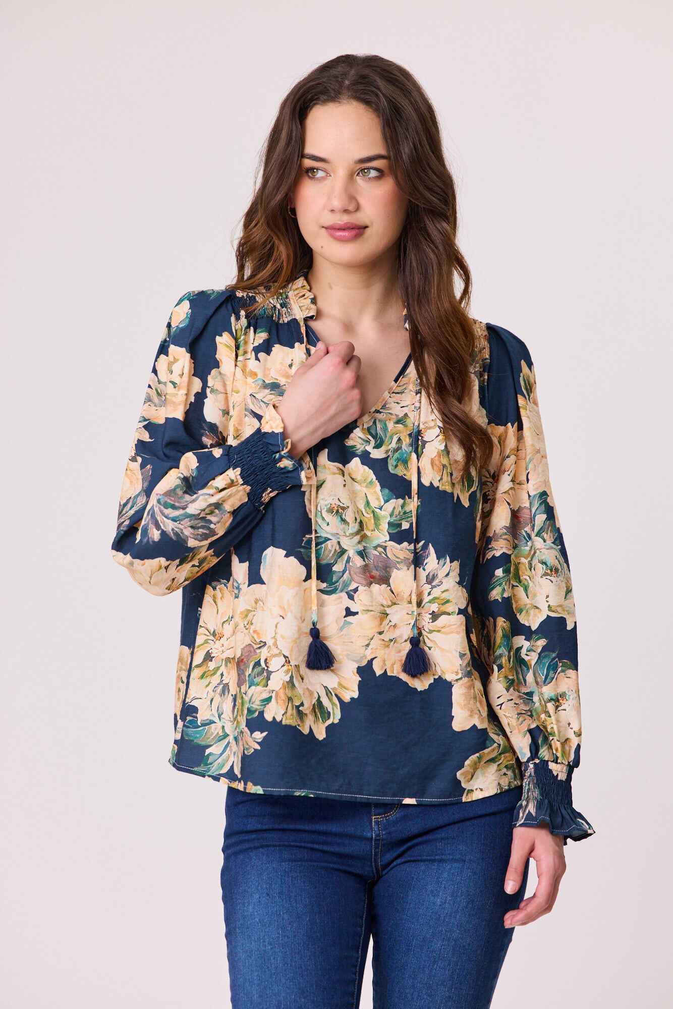 A feminine rouched shoulder peasant top featuring a soft ruffle neckline for a romantic touch. Designed with a relaxed fit, it offers effortless comfort while adding a stylish, boho-inspired feel to your everyday look.
