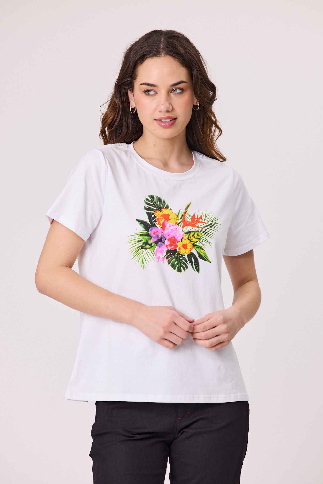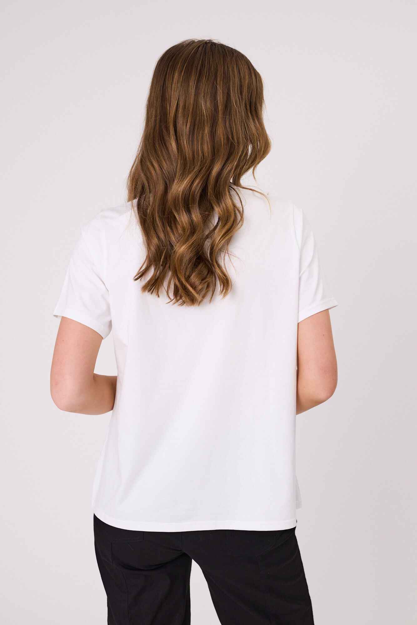 A classic print tee elevated with stylish shoulder trim — simple, versatile, and effortlessly chic.