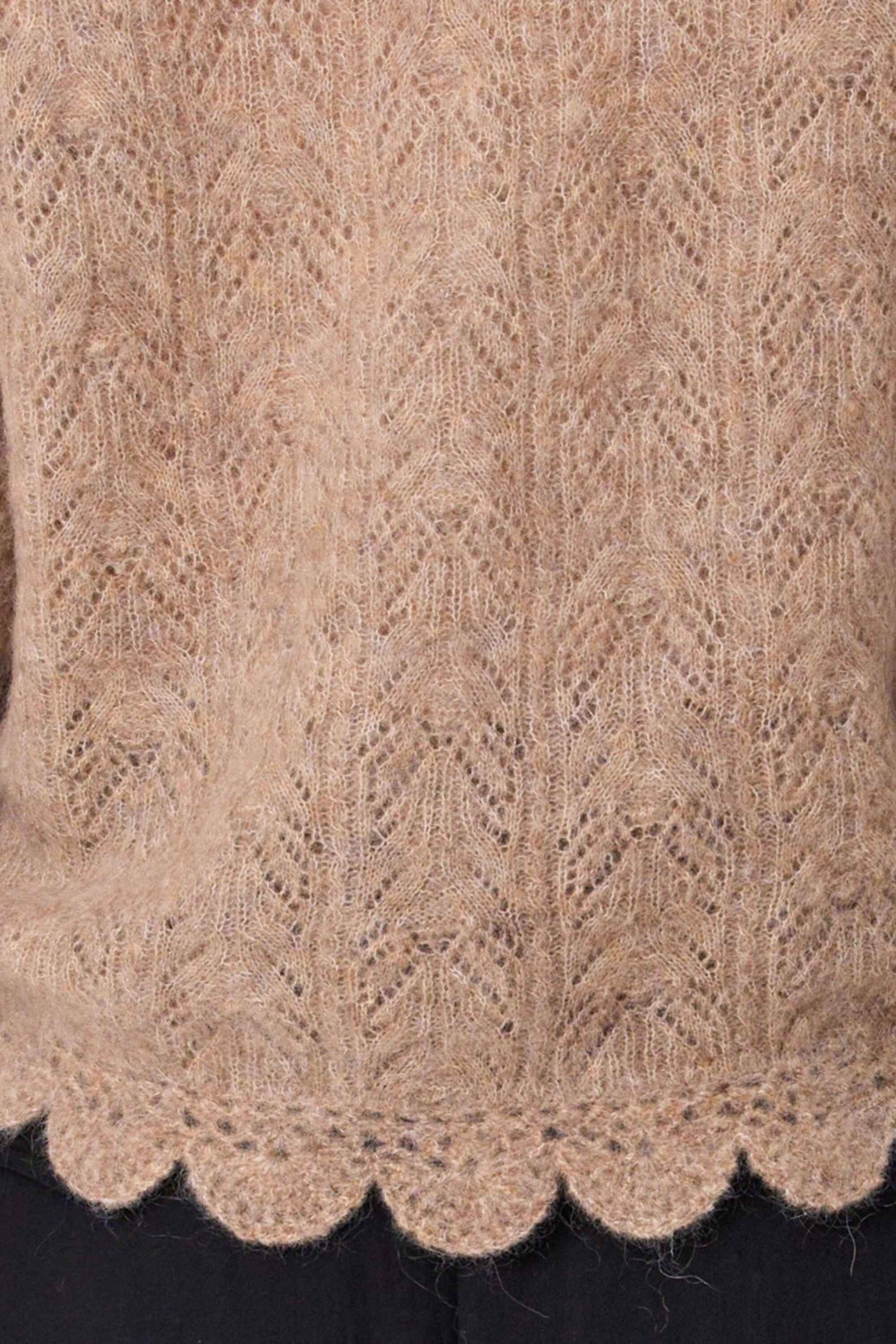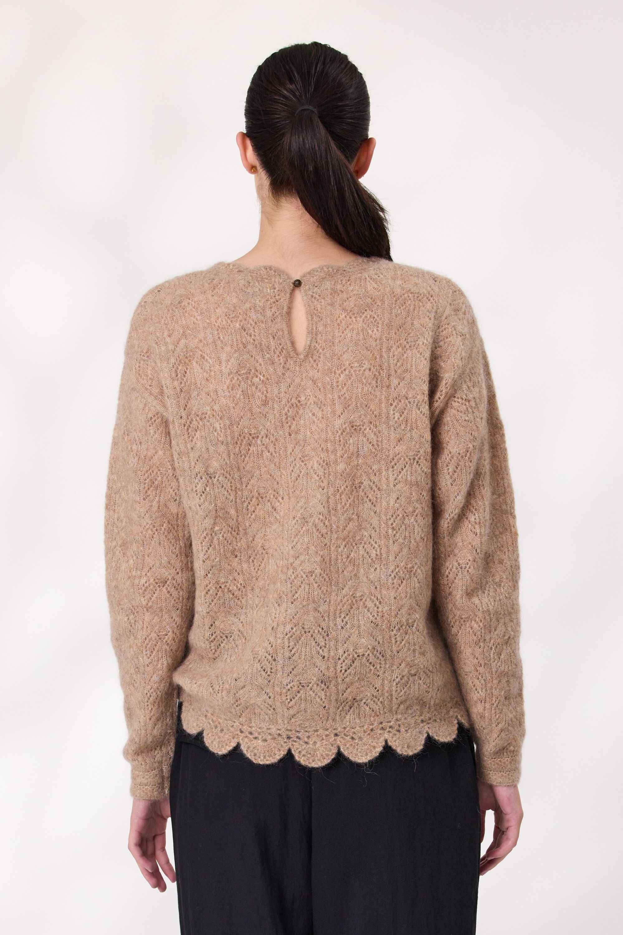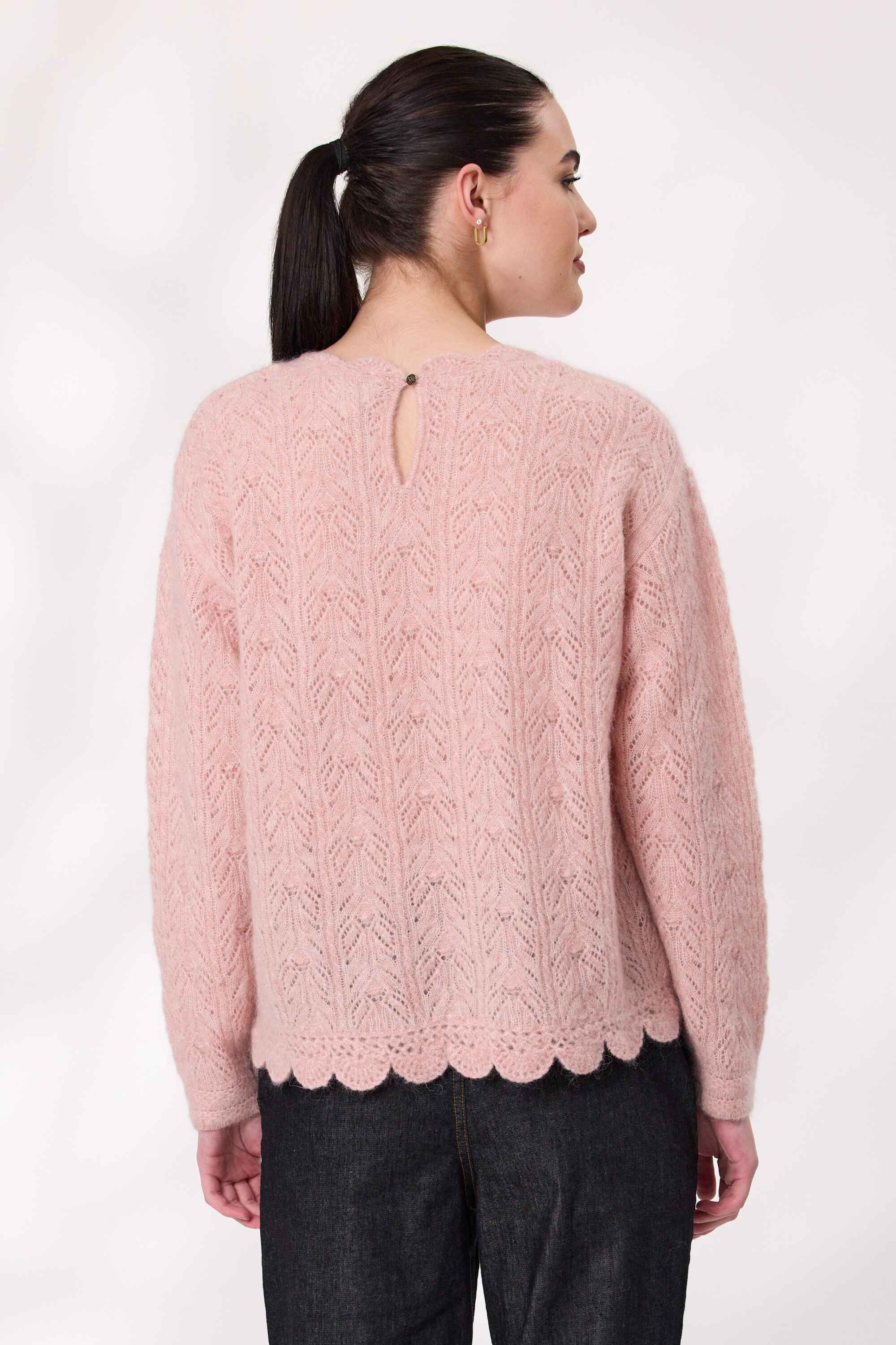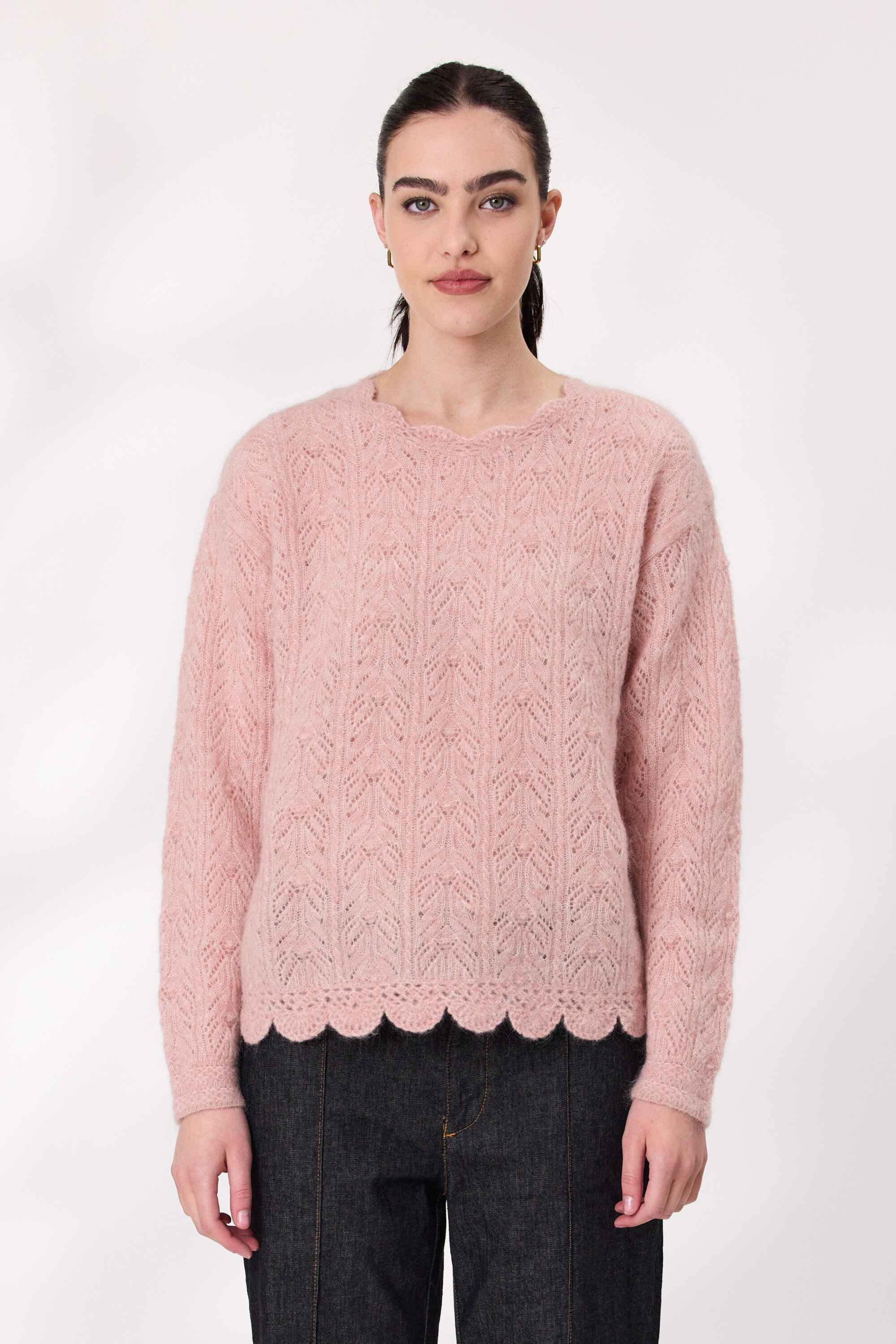 Soft, stylish, and full of character—this mohair wool blend jumper is a standout piece for cooler days. With long sleeves and a cozy feel, it features an intricate design that adds texture and charm. The scalloped hemline gives it a playful finish, while the colour tone keeps it fresh and feminine.