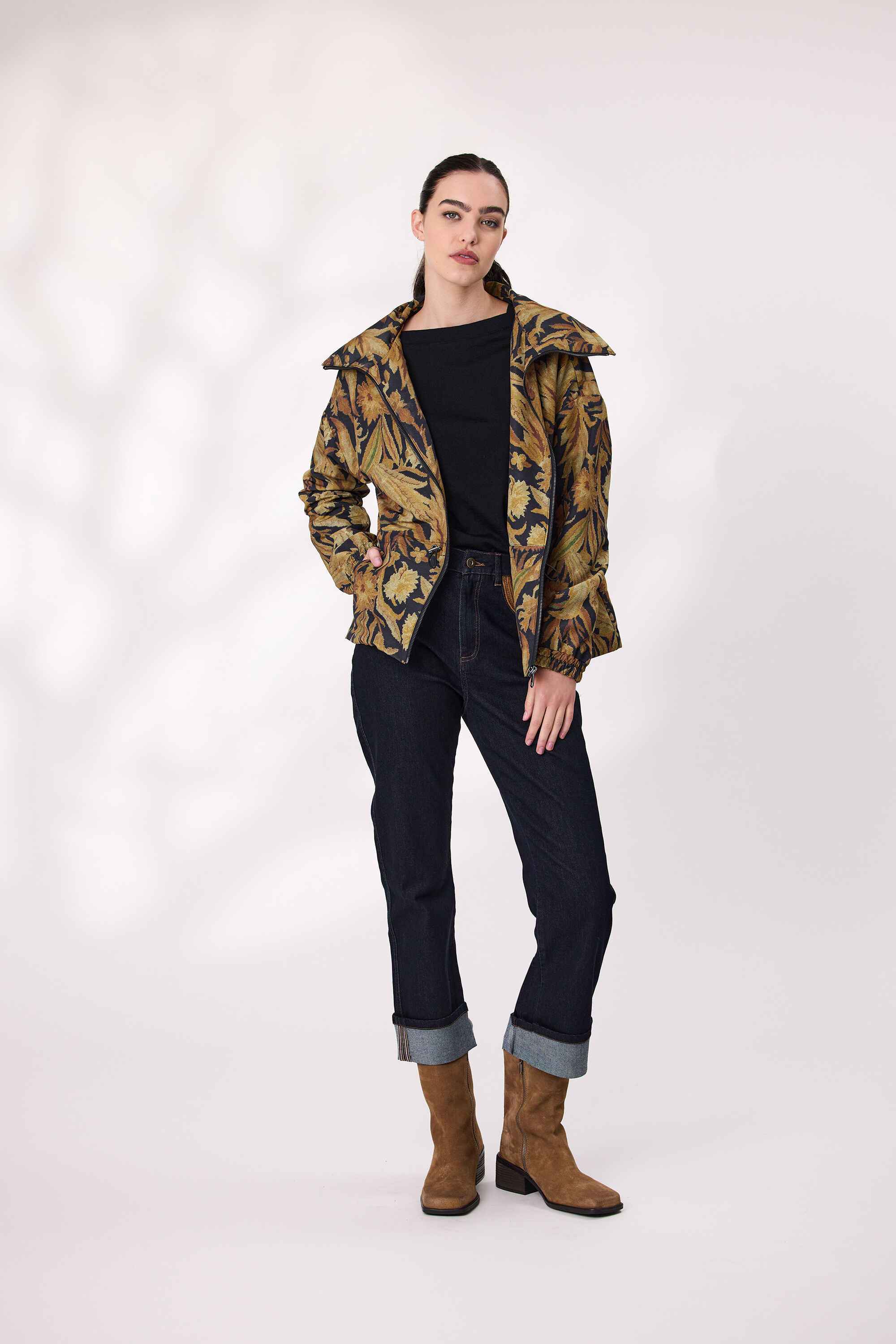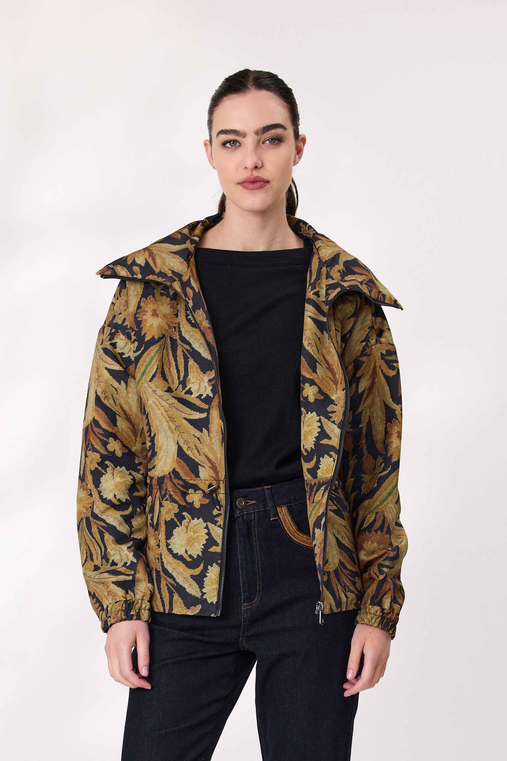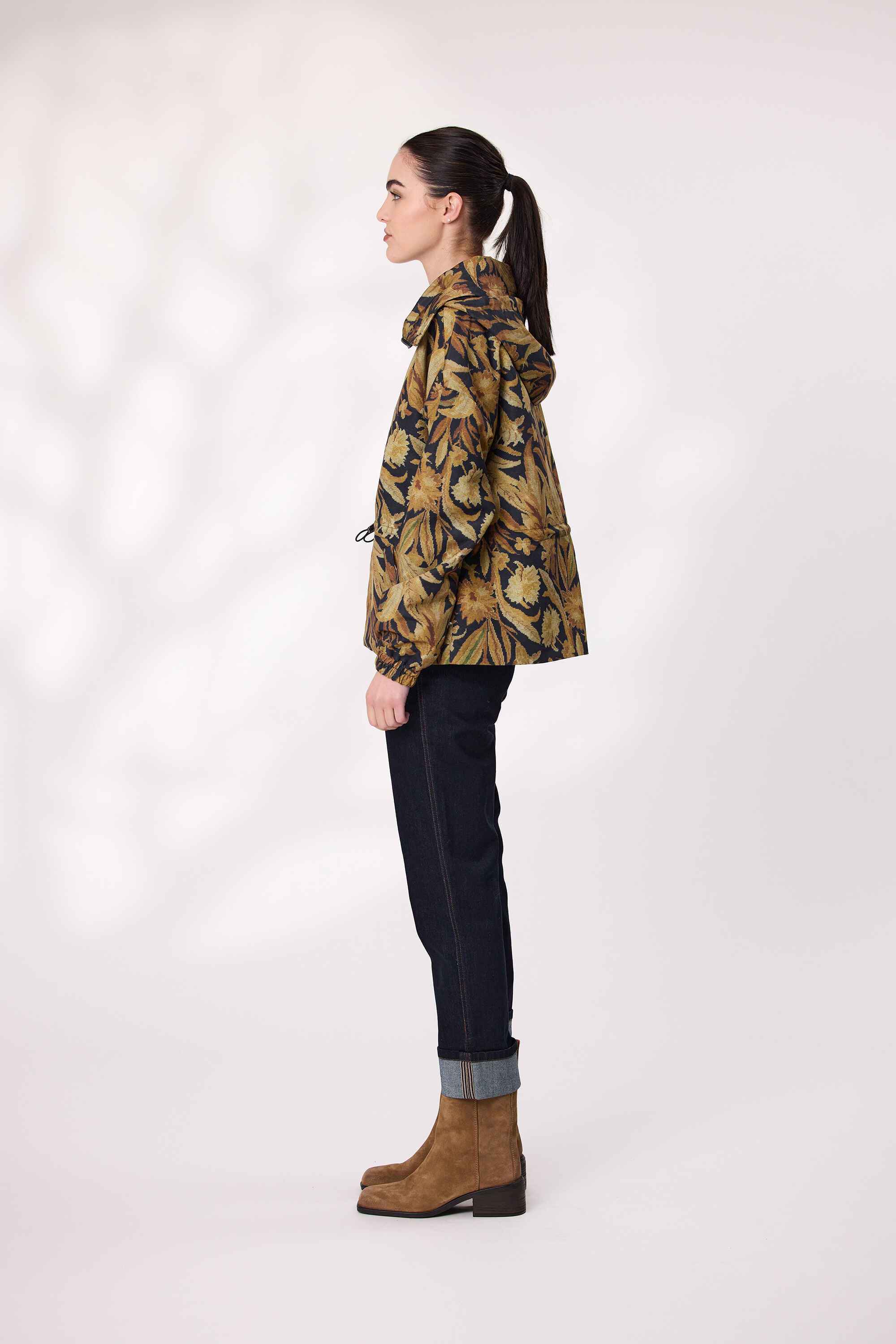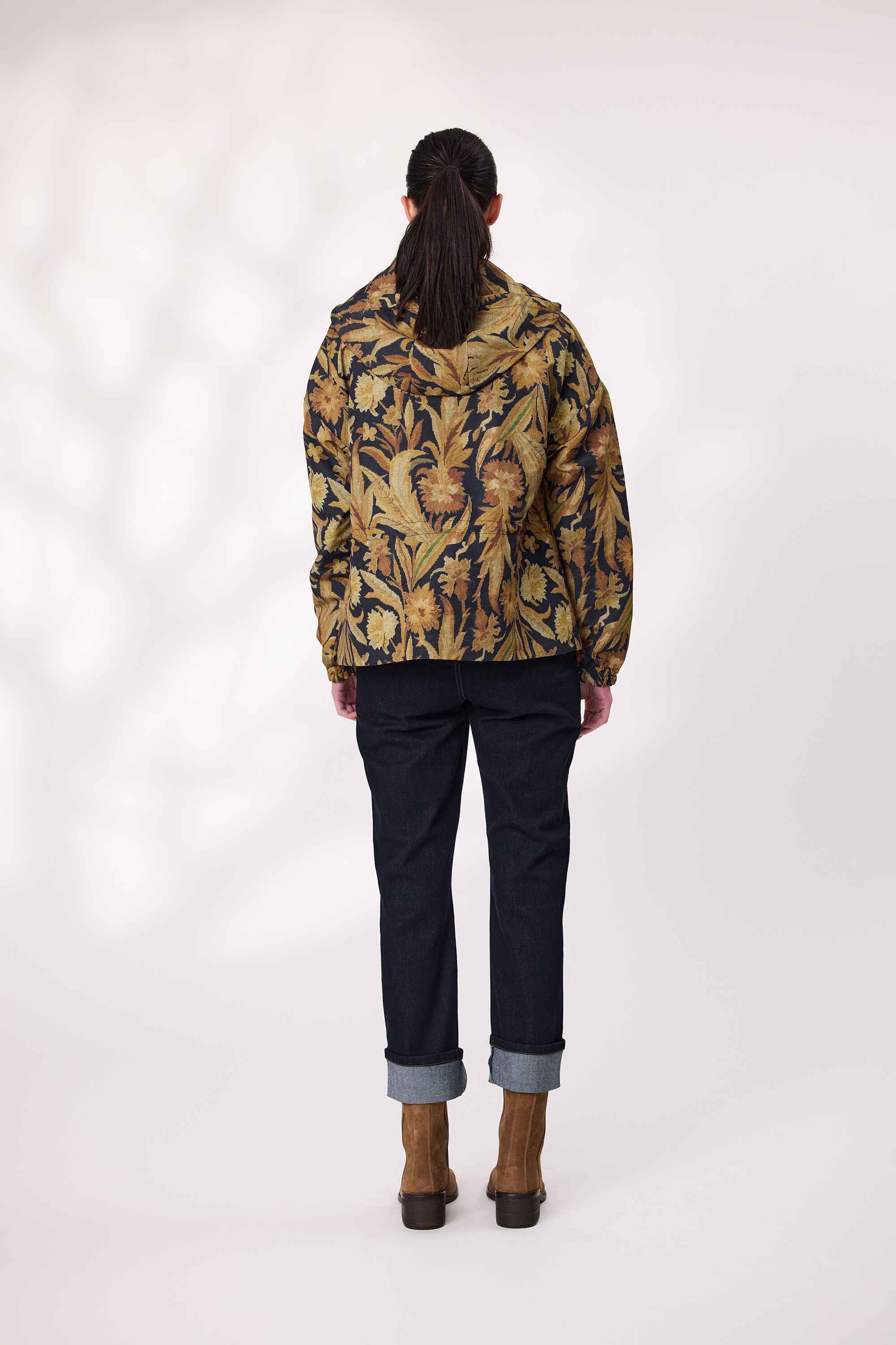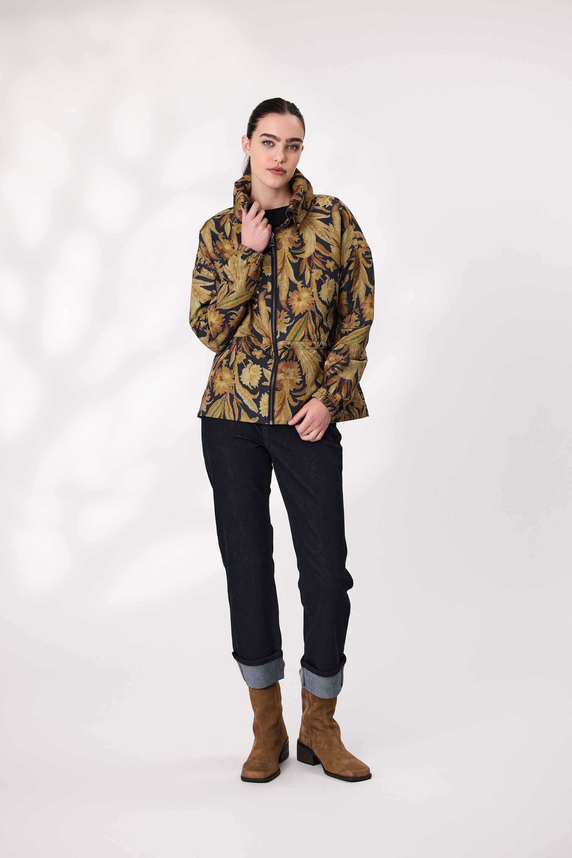 Stay dry in style with this long-sleeved jacket. Featuring a rich print in warm tones over a dark base, this jacket blends practicality with personality. The front zipper closure ensures easy wear, while side pockets offer convenience on the go. A hood provides added protection when needed.