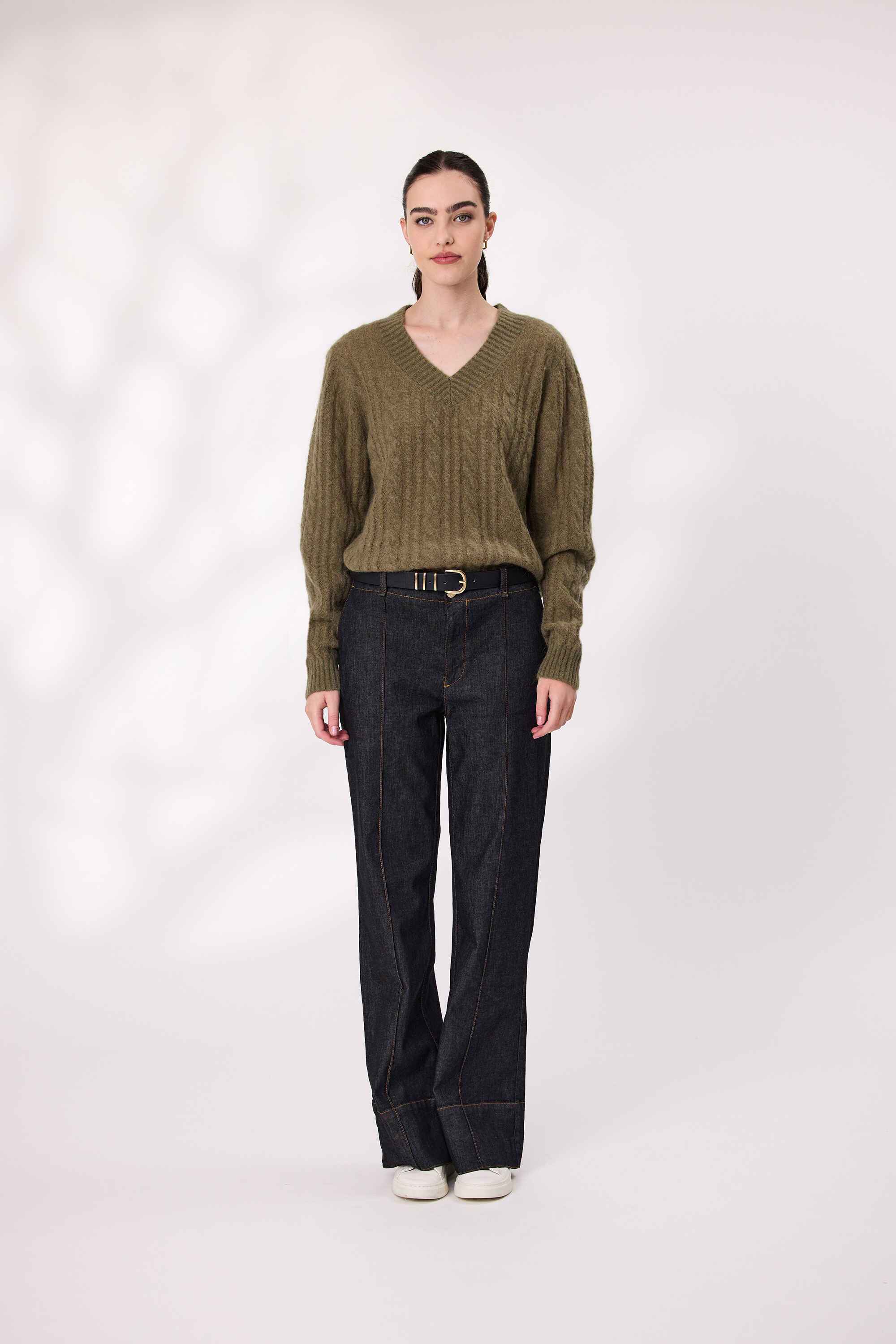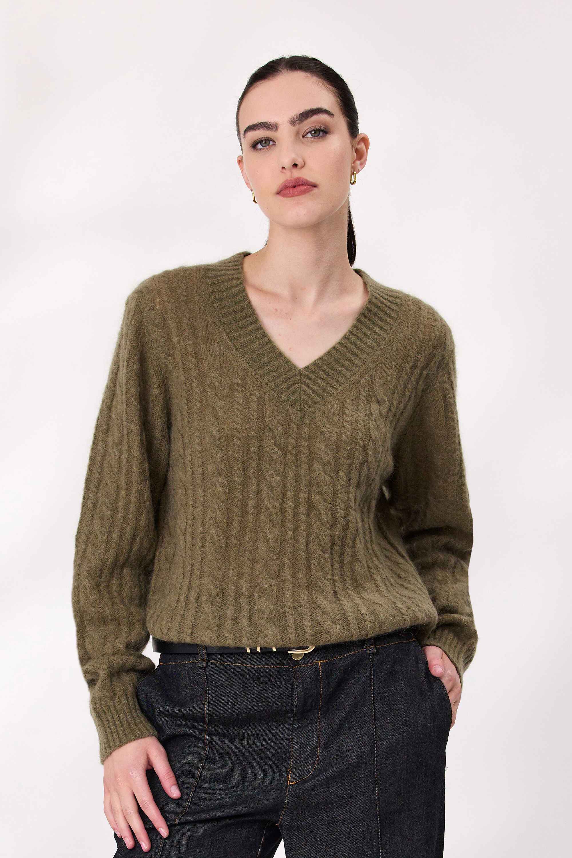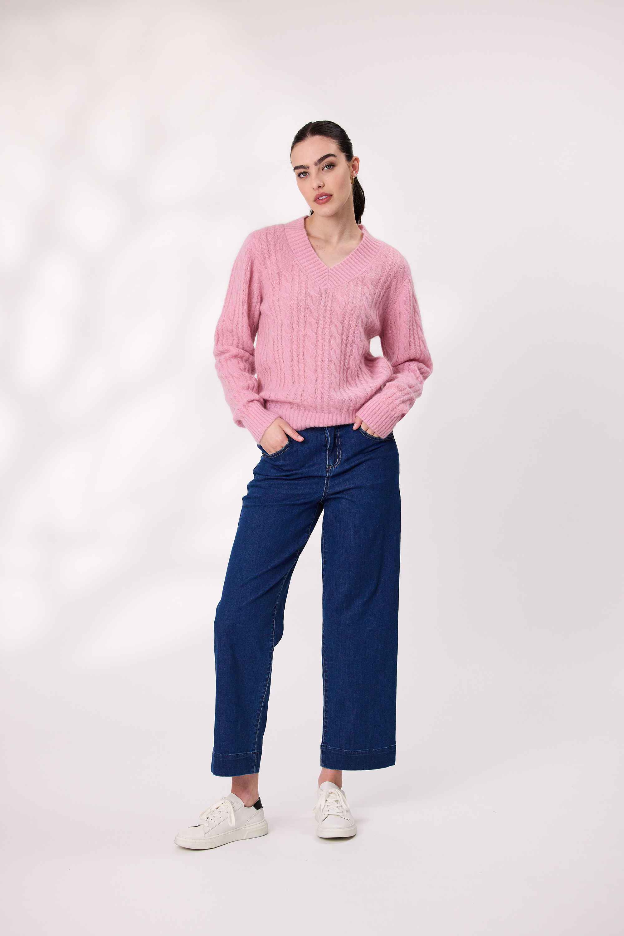 Stay cozy and stylish in this soft-touch jumper. With a flattering V-neckline and long sleeves, it is perfect for layering or wearing solo. The textured knit adds a subtle detail, while the relaxed fit makes it easy to pair with your favorite jeans or trousers.