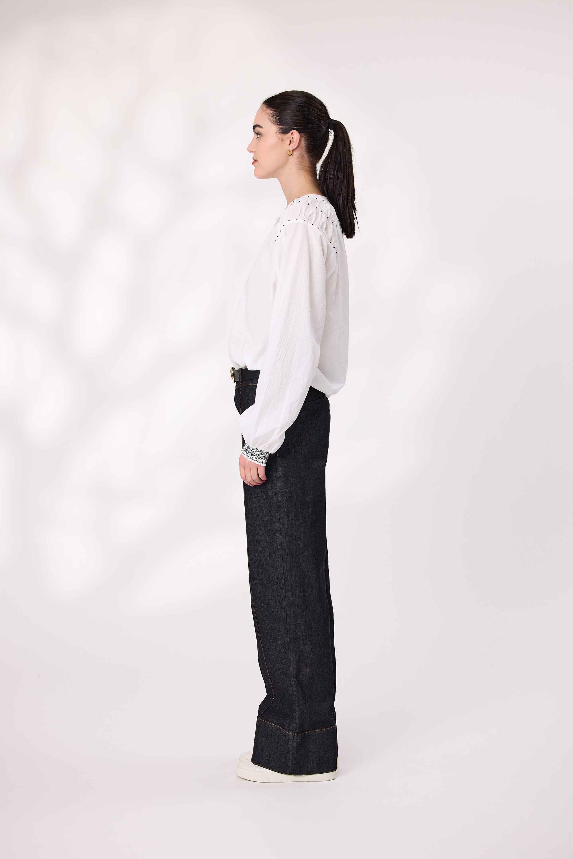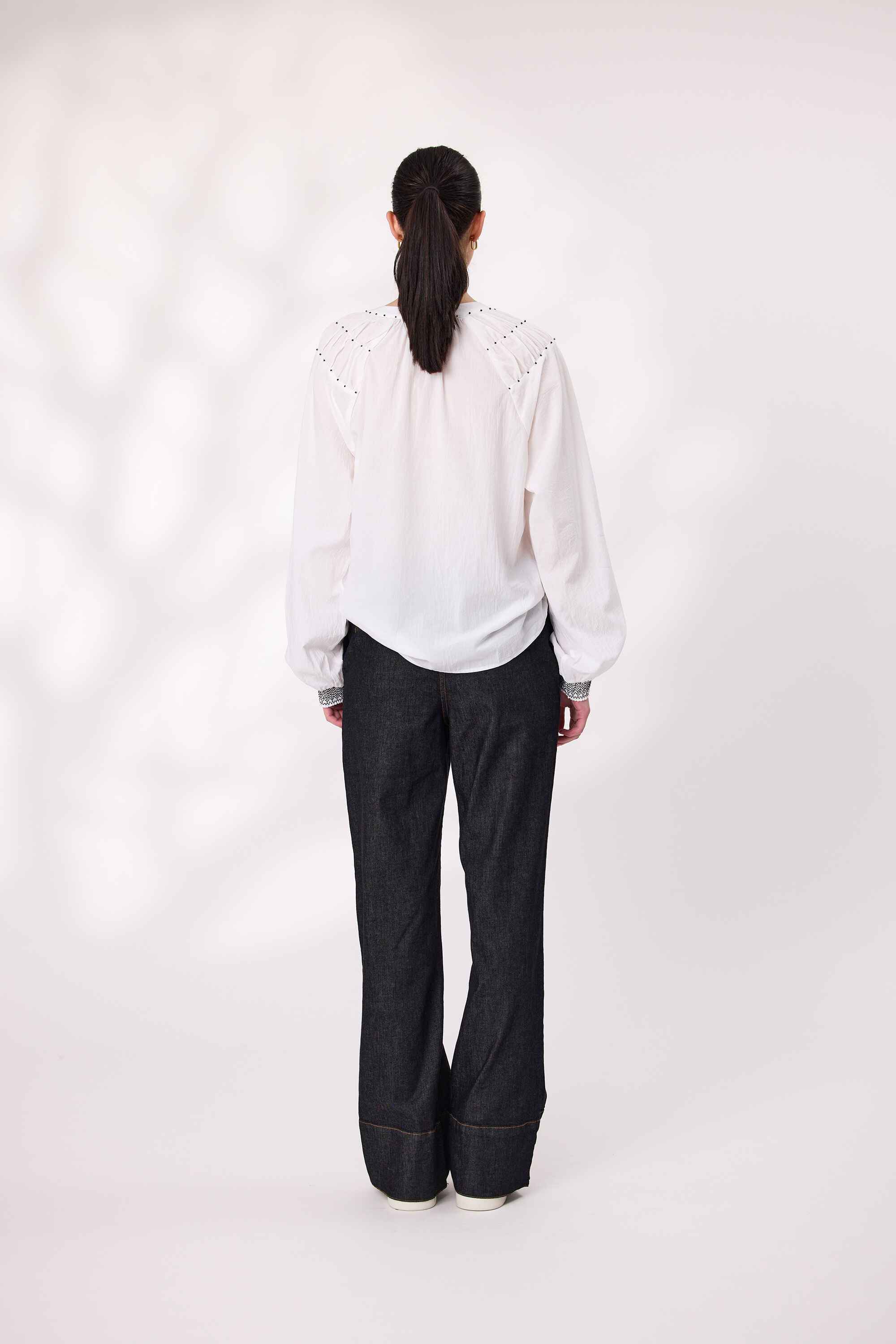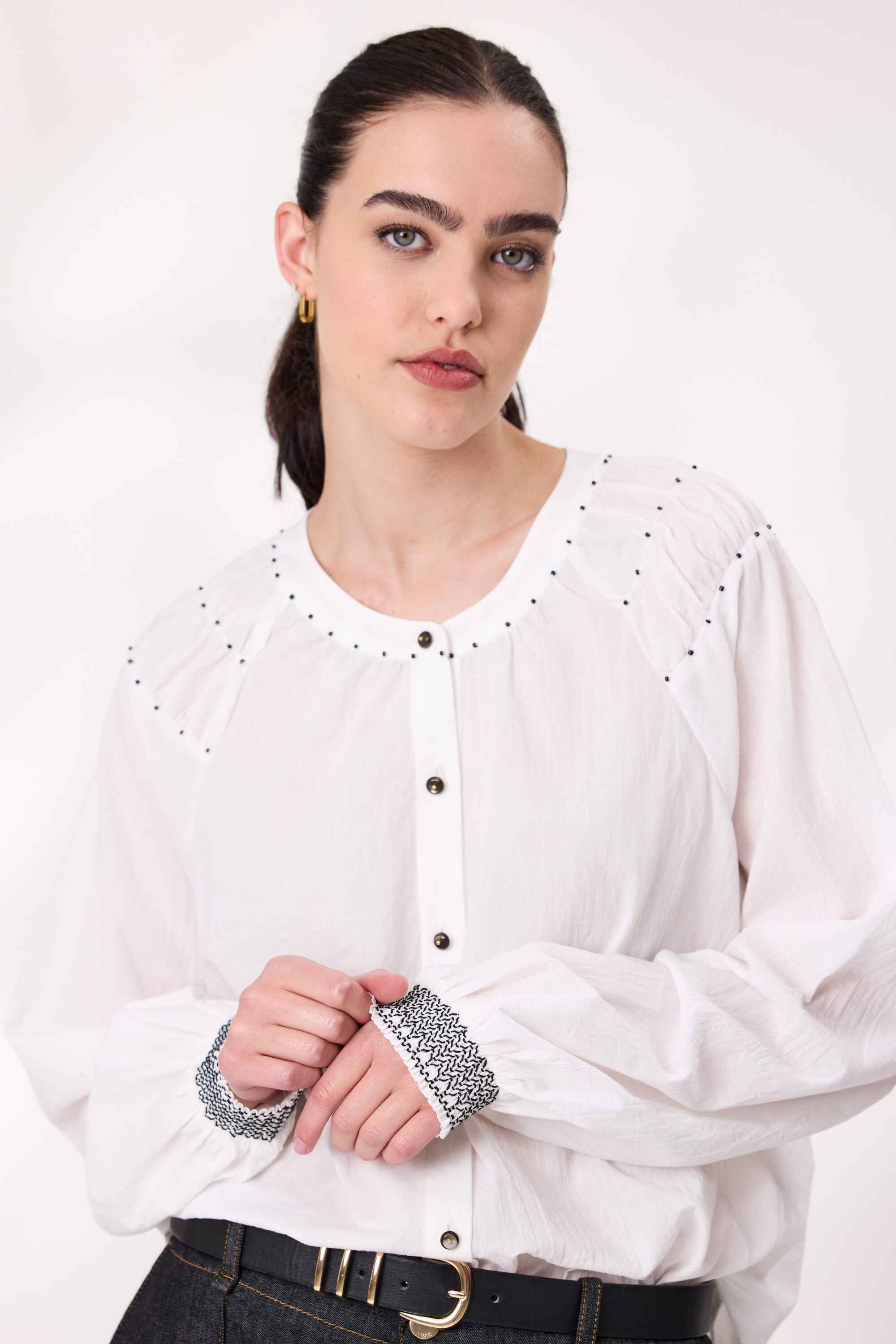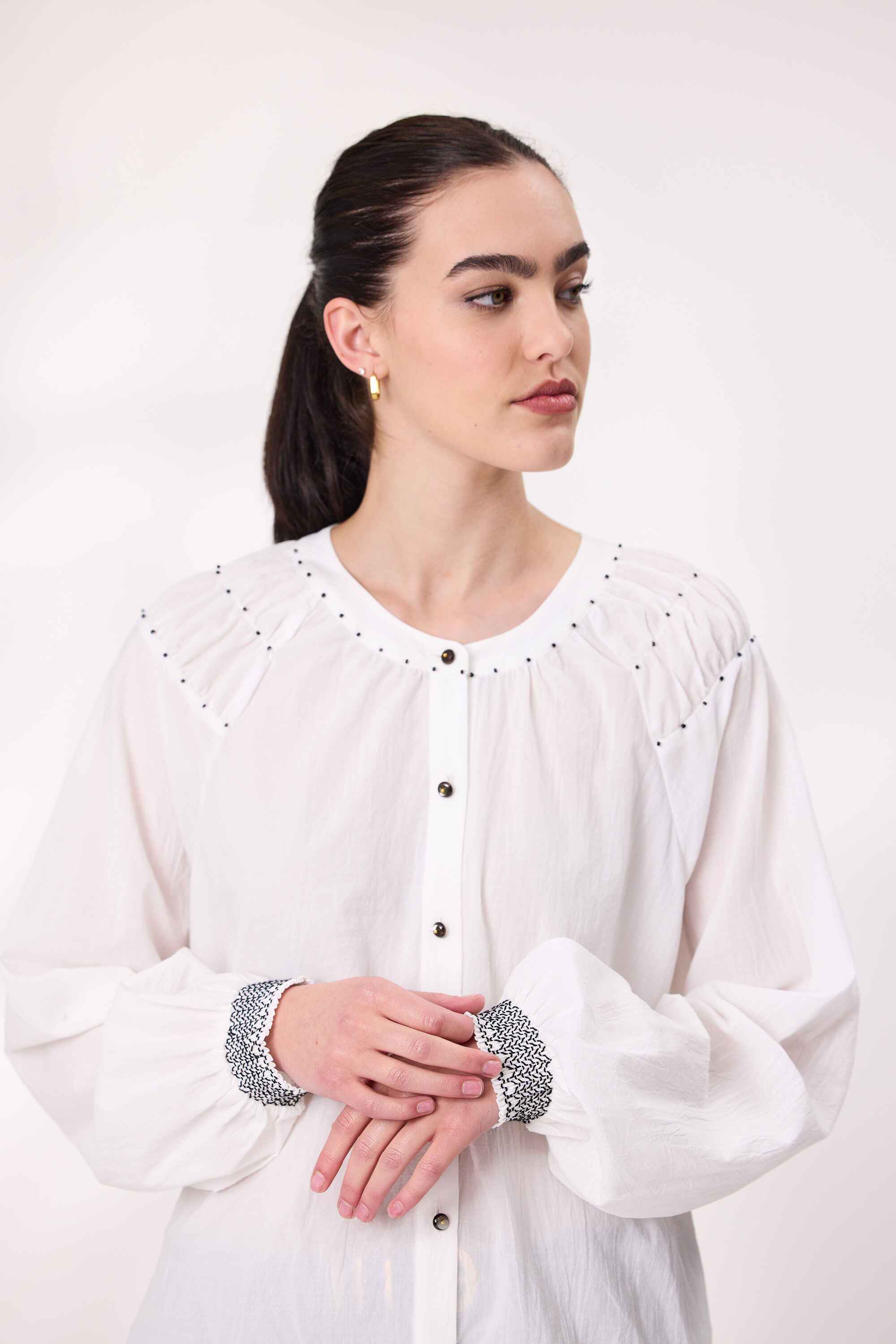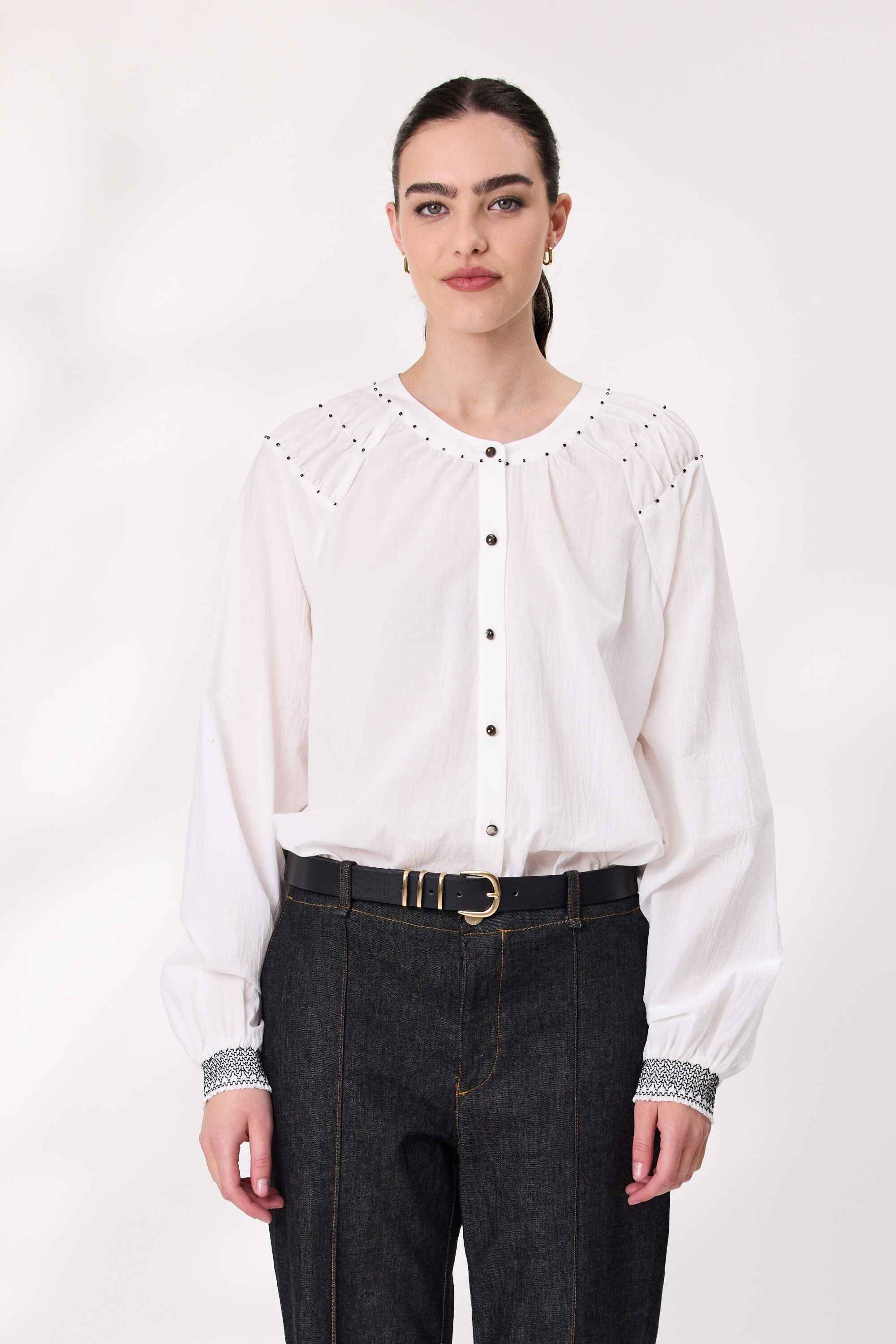 Elevate your wardrobe with this elegant long sleeve shirt, designed to blend timeless tailoring with artisanal detail. Crafted from a soft, breathable fabric, it features a classic button-down front for versatile styling and delicate beads embellishments. Lovely shirring at  sleeves cuffs that add visual interest.