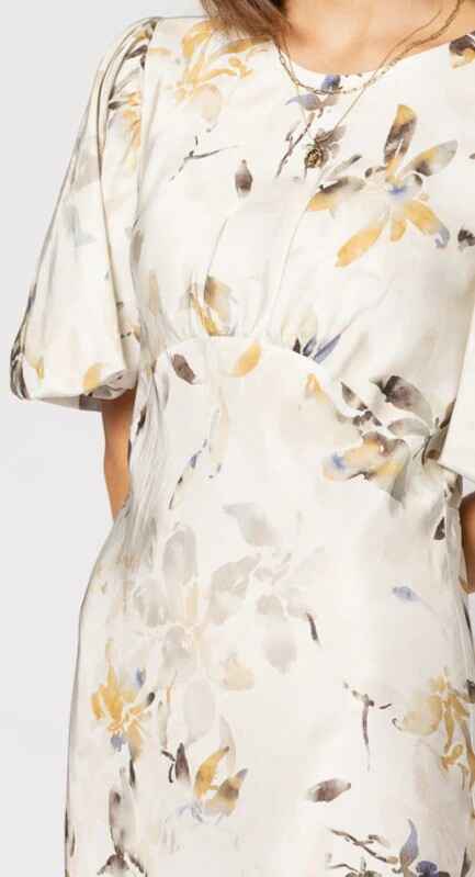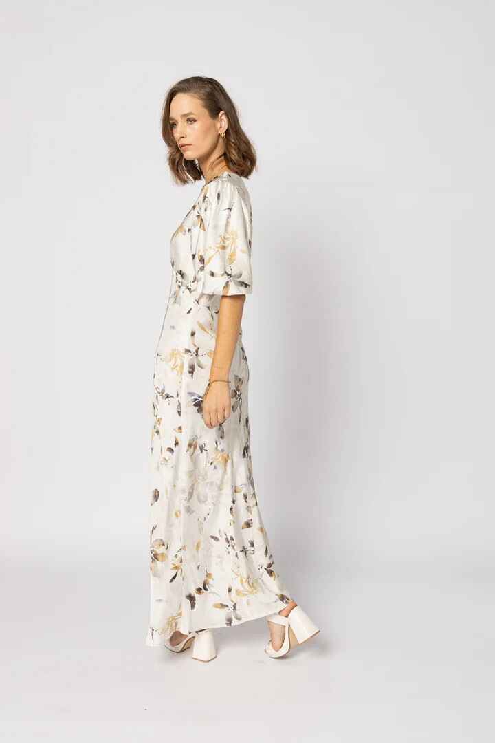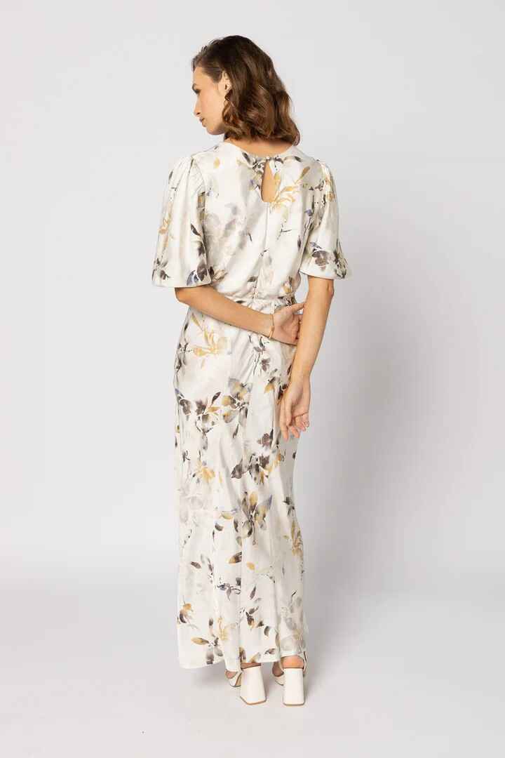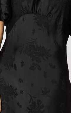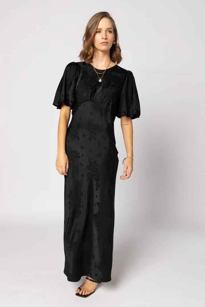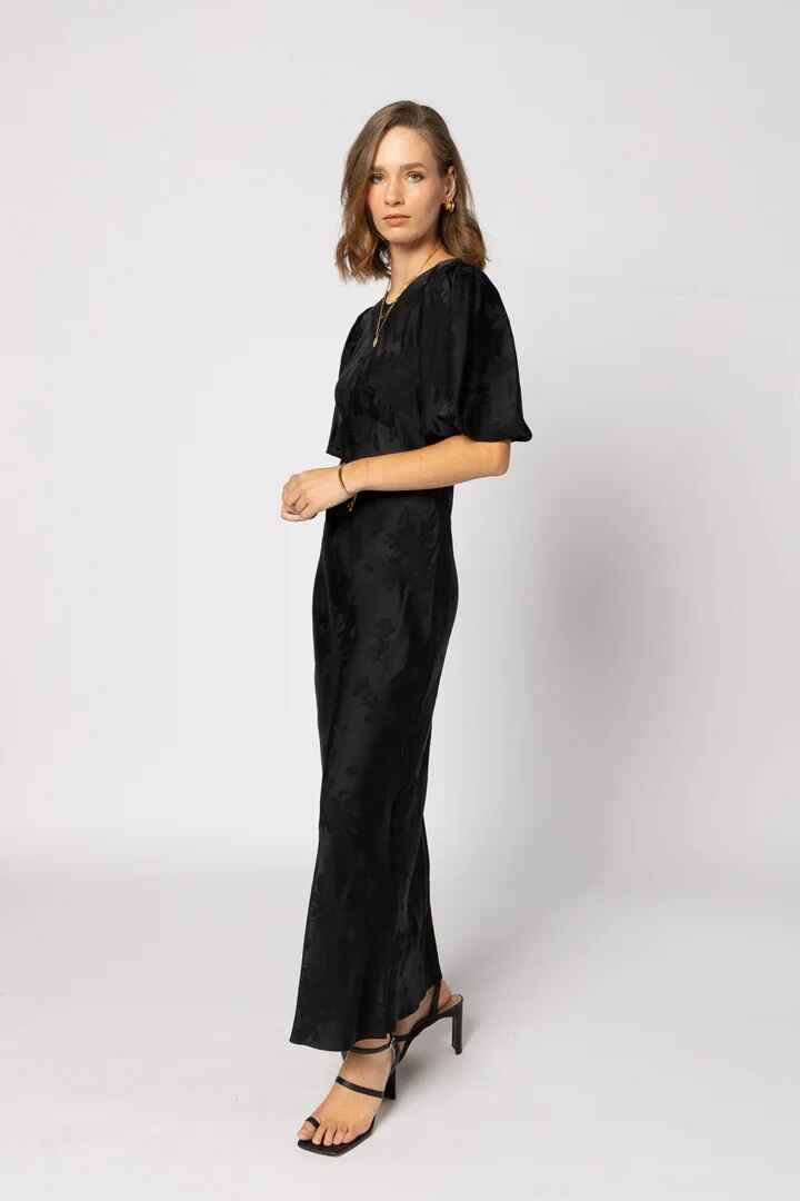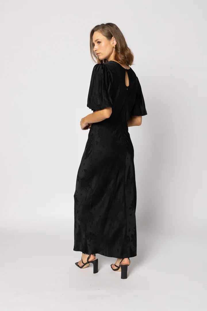 Amara Dress, an exquisite choice for your next special occasion. This elegant garment showcases a sophisticated crew neckline adorned with a back button and keyhole detail. The puff sleeves add a touch of whimsy, while the flattering yoke design at the front enhances the dress's maxi length. For ease of wear, a discreet zipper is located at the back. Elevate your wardrobe with the timeless charm of the Amara Dress. A Beautiful Black Jacquard and Soft Floral Print.