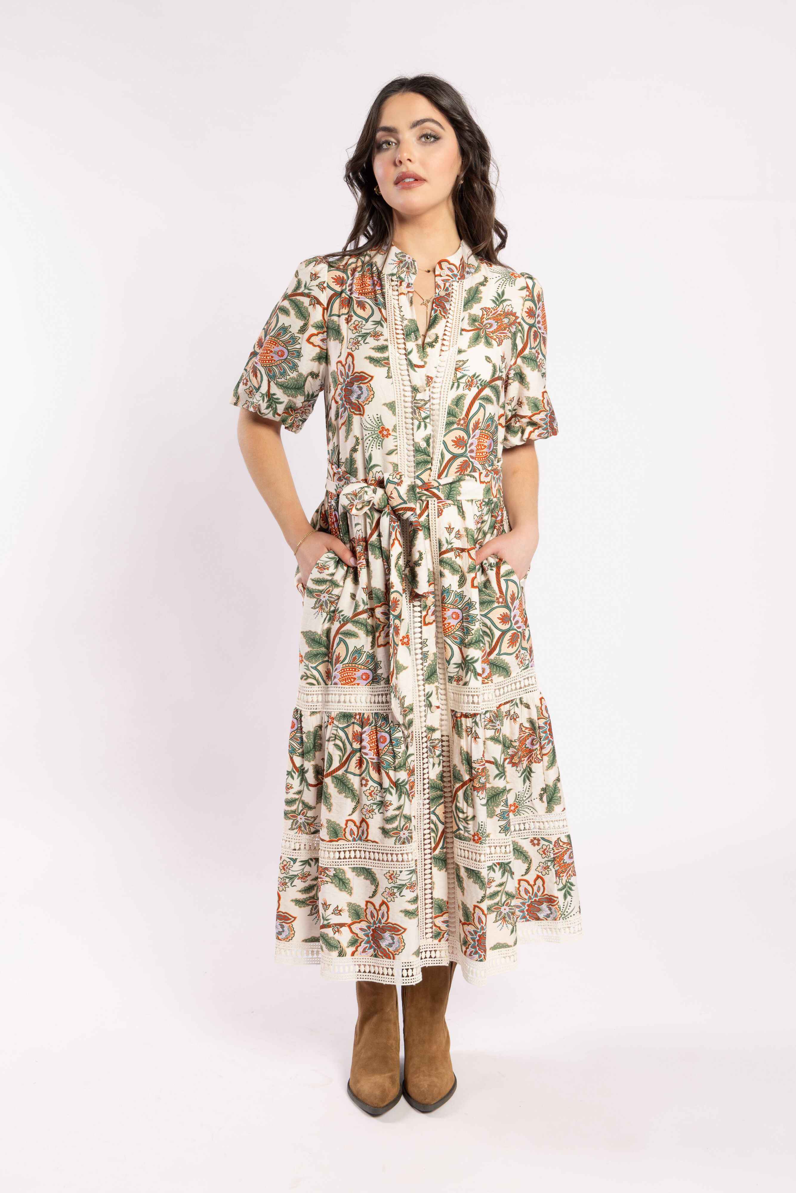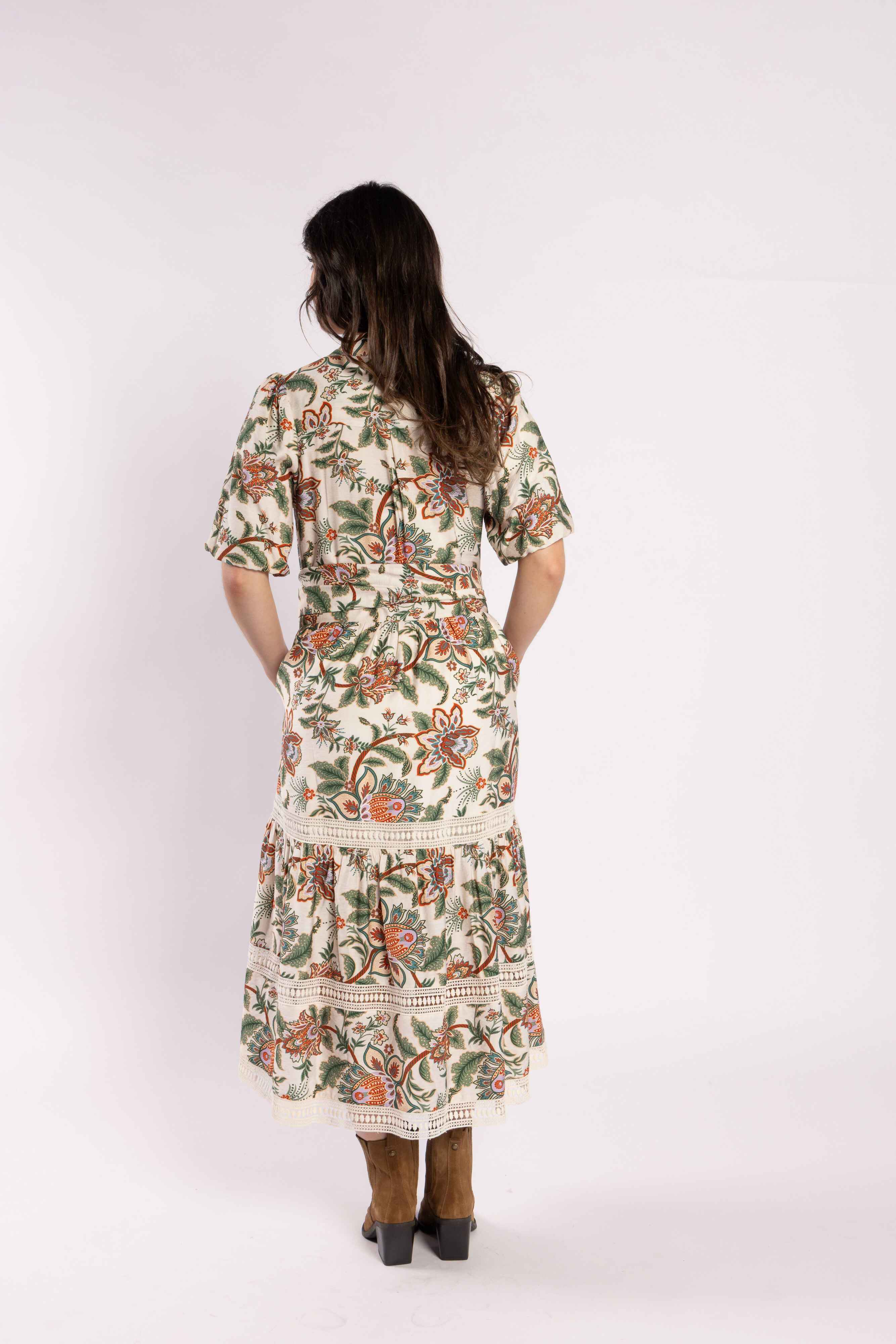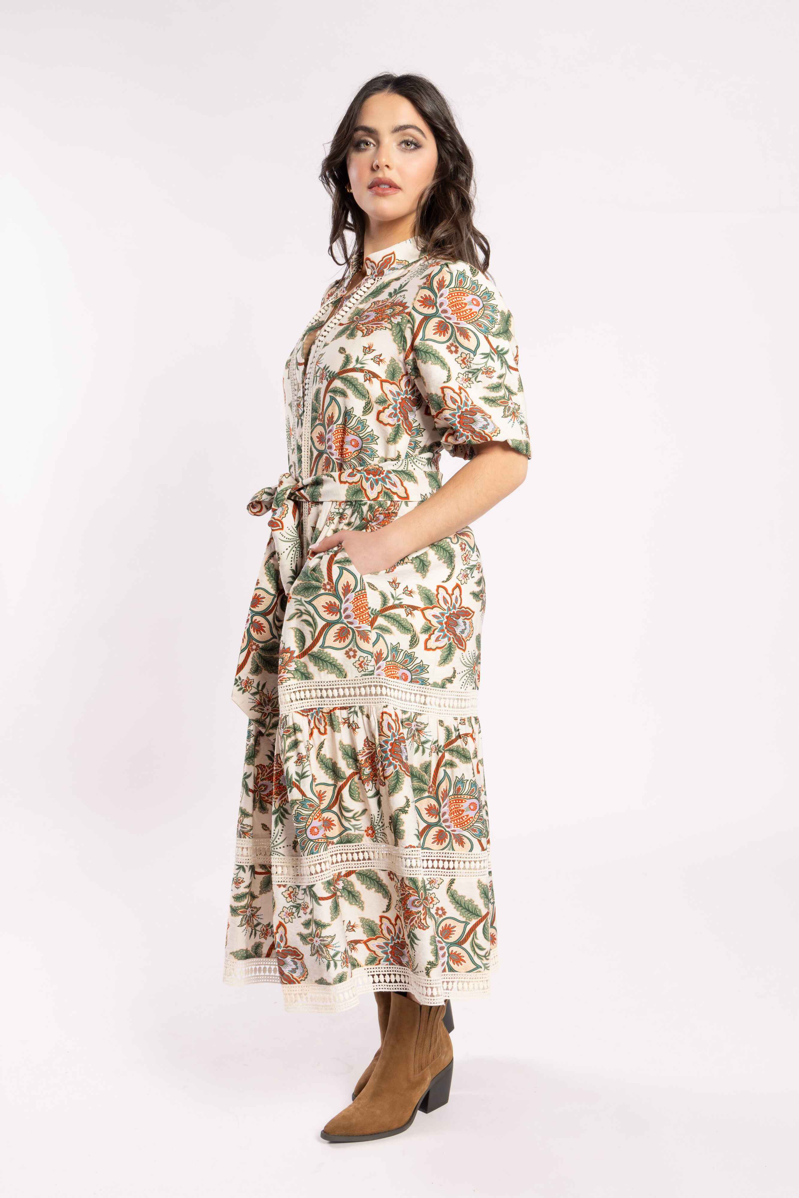 The Paisley Print Del Ray Midi Dress is an easy, throw-on style you’ll reach for again and again. Made from a soft rayon-nylon blend, it features puff sleeves, ladder lace details, a mandarin collar, and an adjustable waist tie for a flattering fit. Plus, it has pockets — because we love practical details. With its Del Ray Cream paisley print and trans-seasonal feel, this midi dress works just as well with sandals on warm days as it does layered with boots when it cools down. MAIN: 80% RAYON 20% NYLON LINING: 100% POLYESTER Care Instructions:Wash inside out, cold gentle wash with similar colours. Do not soak or bleach. Line dry in shade, do not tumble dry. Dry cleanable. Always check the label.