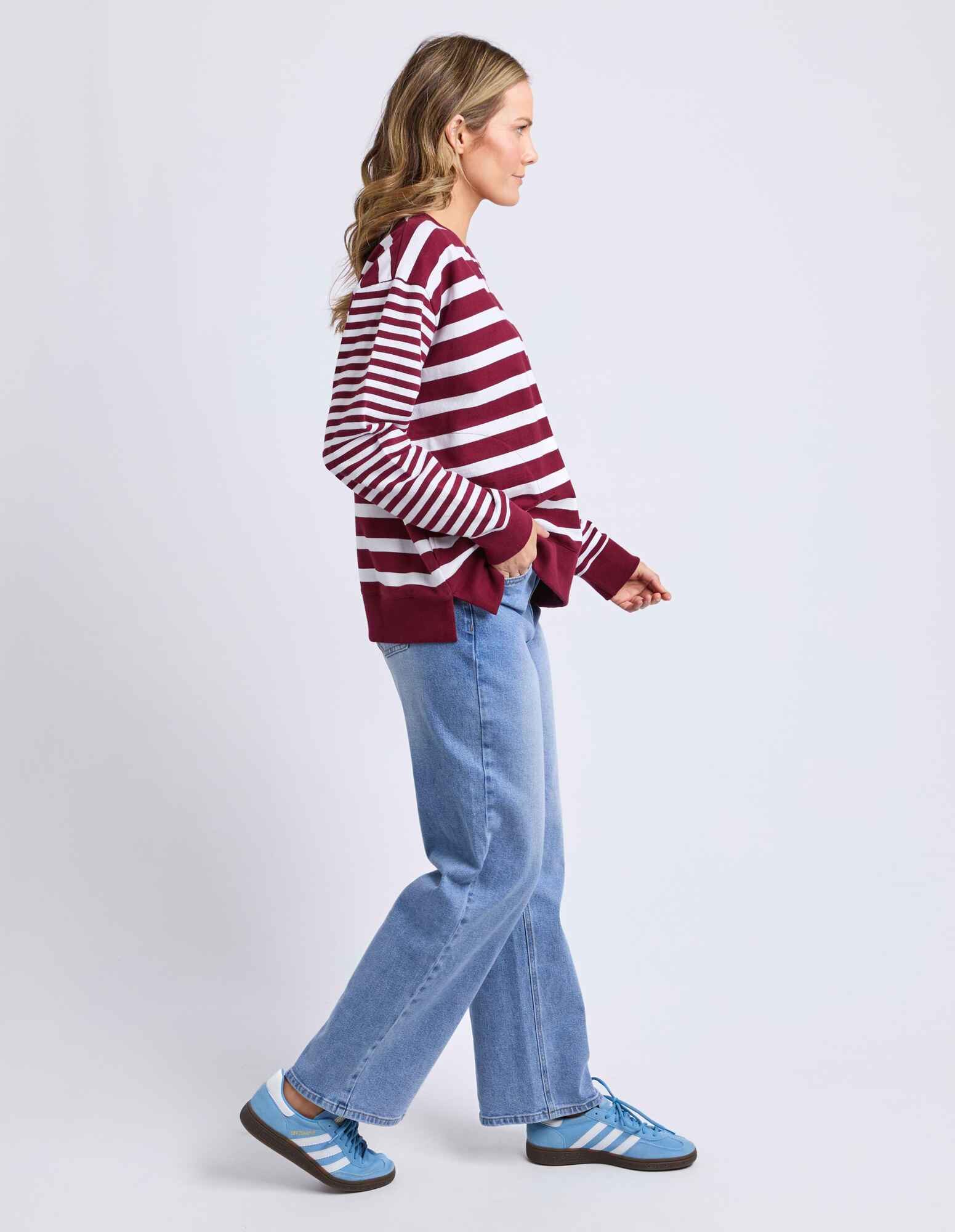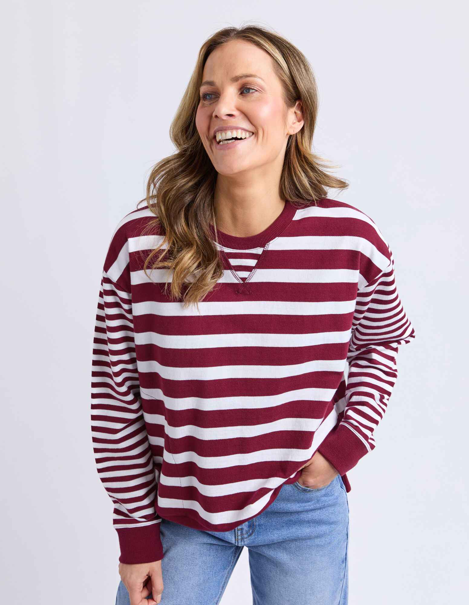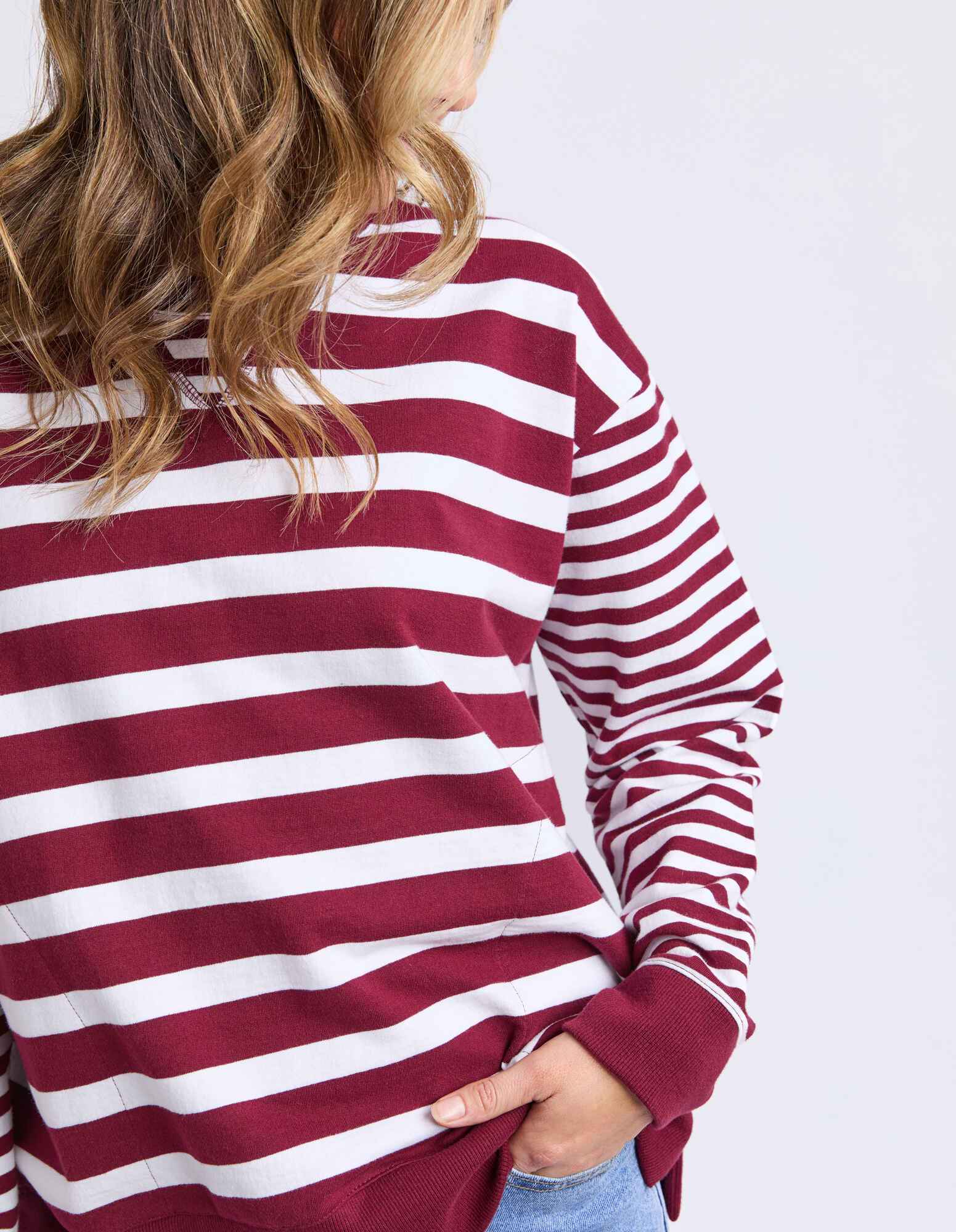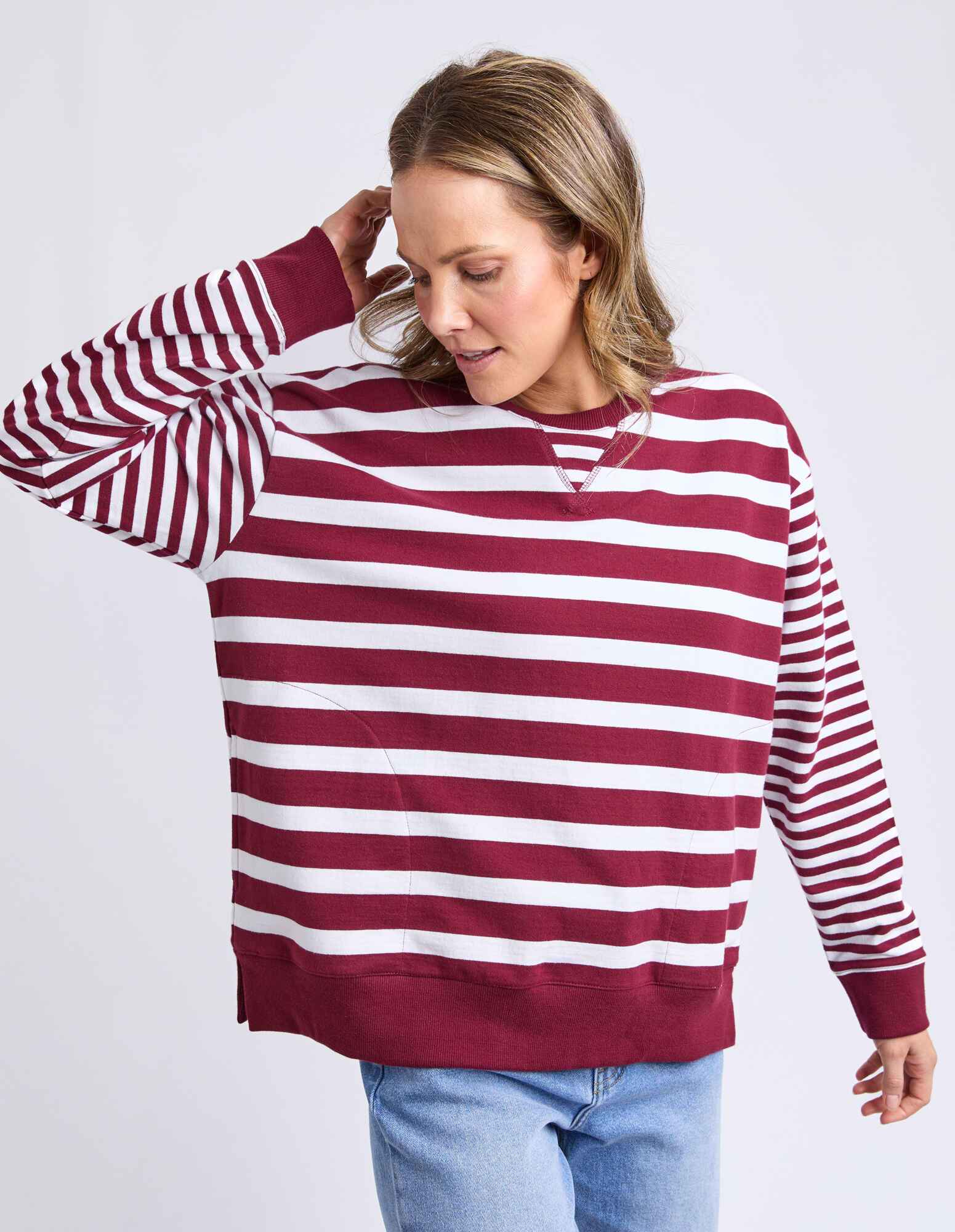 This casual crew is designed with a relaxed fit and classic stripe pattern for effortless everyday wear. Featuring a comfortable round neckline and long sleeves, it’s finished with ribbed trims at the neck, cuffs, and hem for a neat yet laid-back feel. The rich plum and white stripes add a timeless touch, making it an easy throw-on piece for off-duty days.