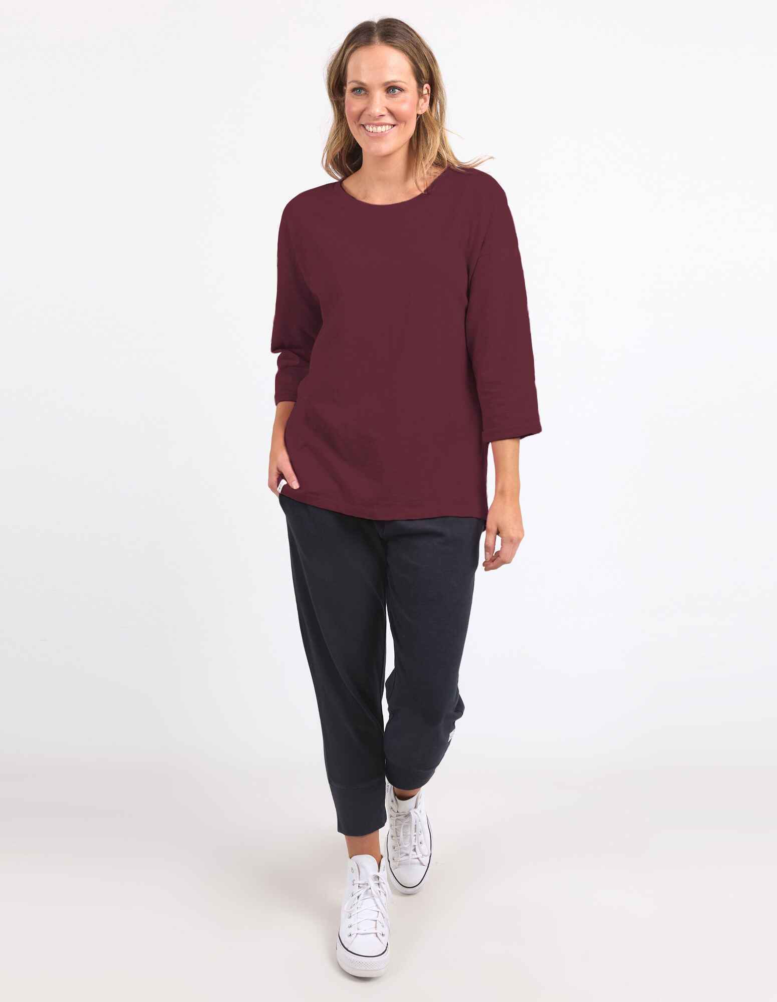 This easy-wear top is designed with a relaxed silhouette for everyday comfort and versatility. Featuring a classic round neckline and flattering ¾-length sleeves, it’s a timeless piece that layers effortlessly or stands alone. Finished in a rich plum tone, it’s perfect for pairing with your go-to pants for casual days or laid-back weekends.