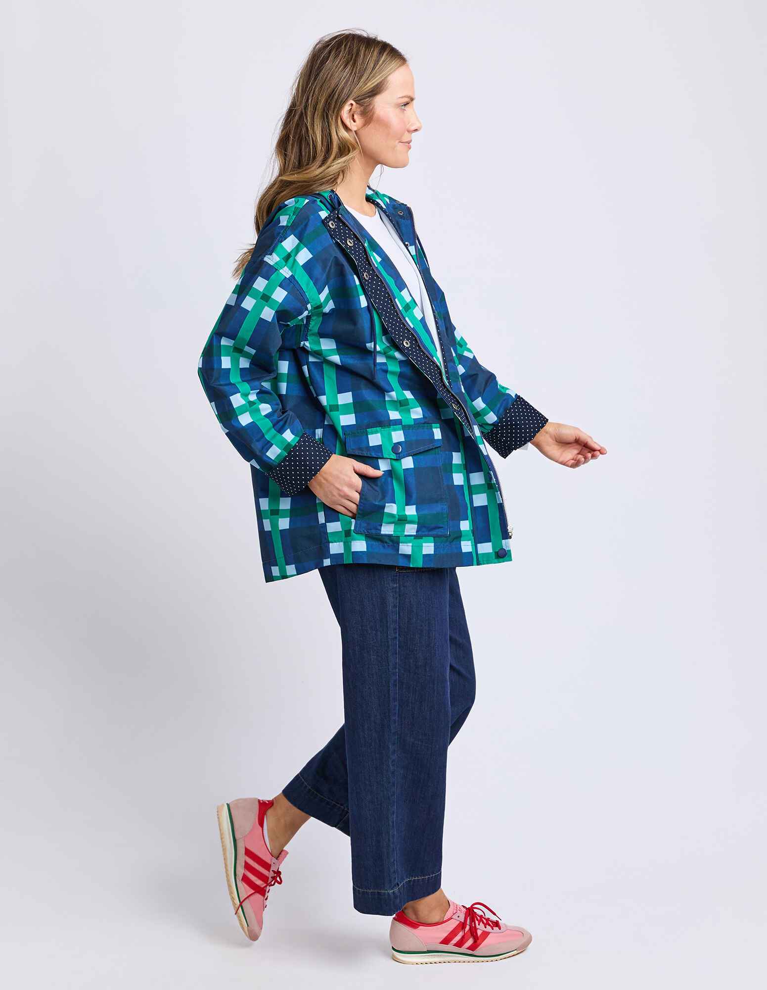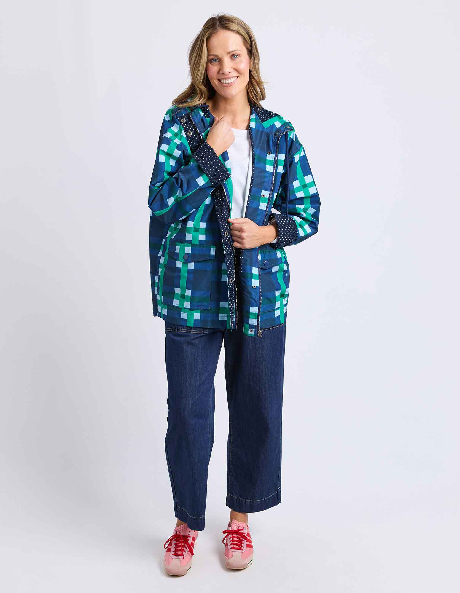 The Elm Bari Raincoat blends functional outerwear with statement style. Featuring exclusive Bari print artwork with a playful polka dot facing, this relaxed-fit raincoat is crafted from coated PVC and finished with practical front pockets—perfect for staying dry in style.