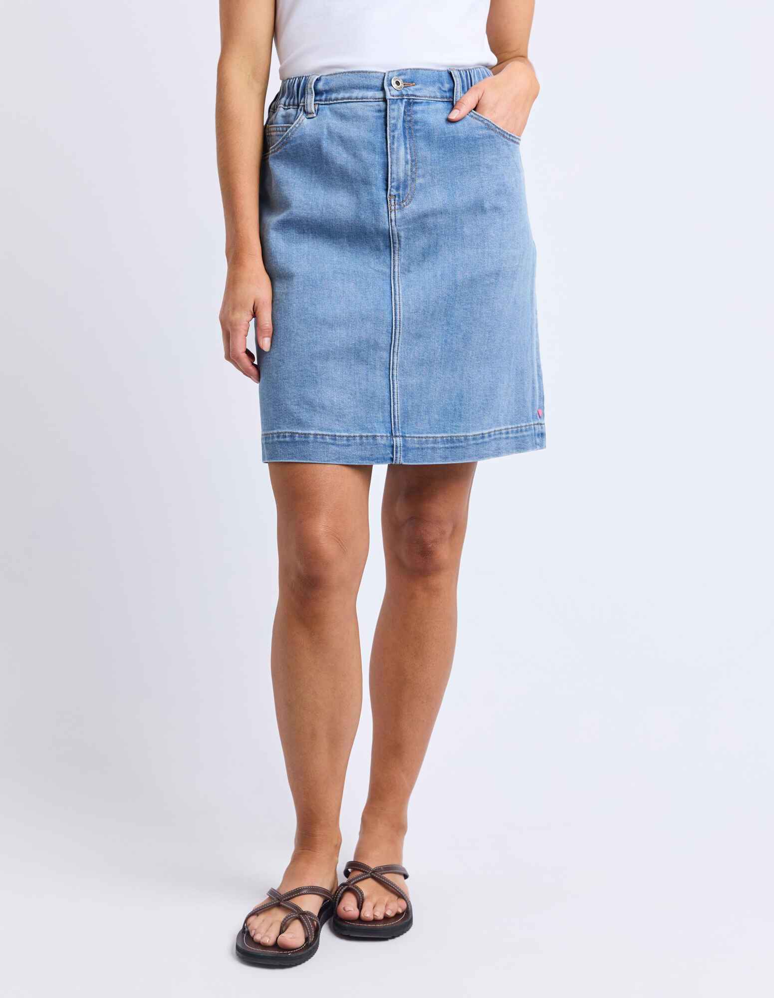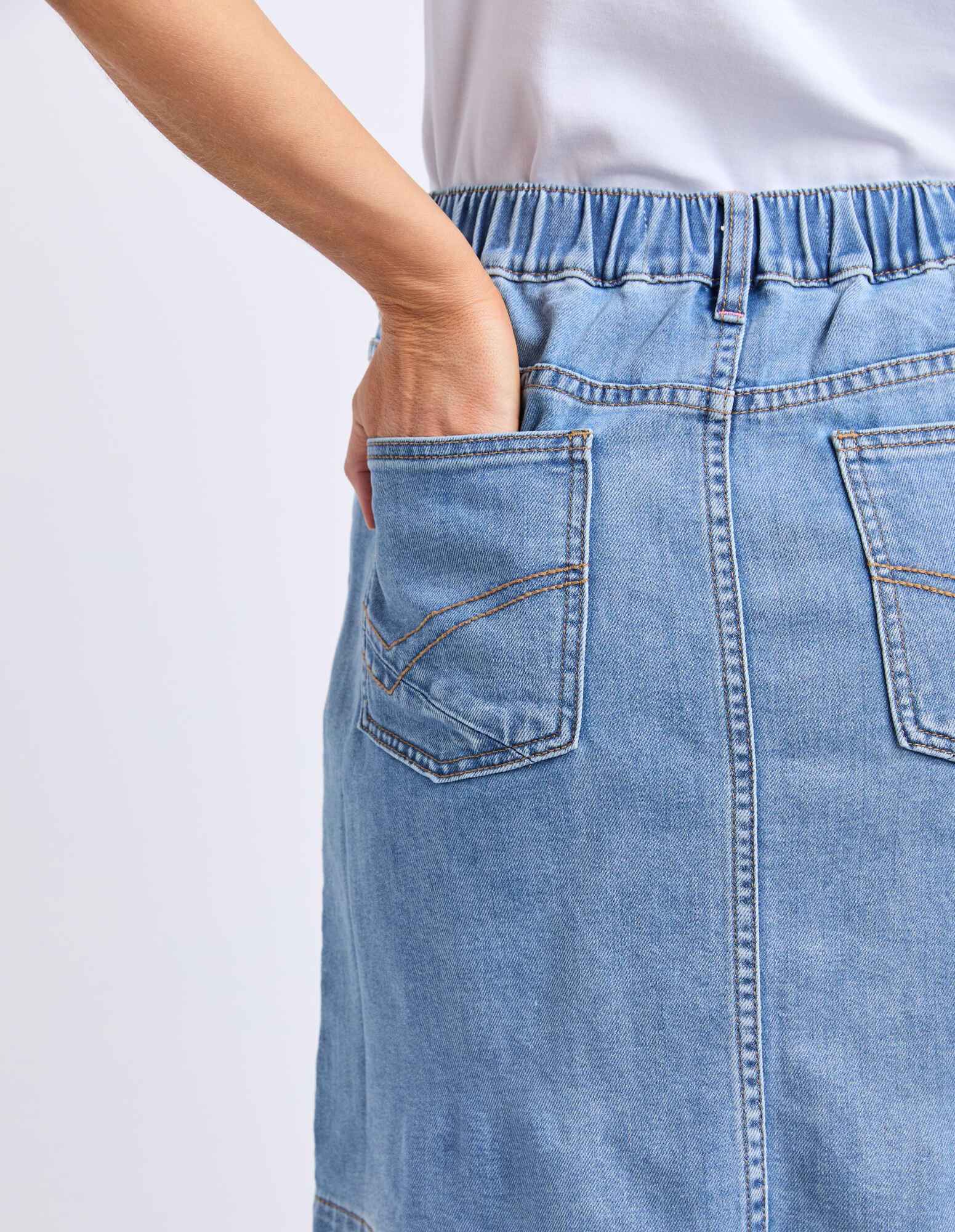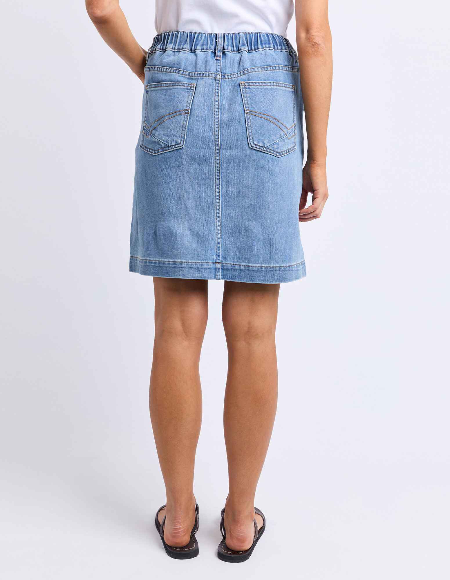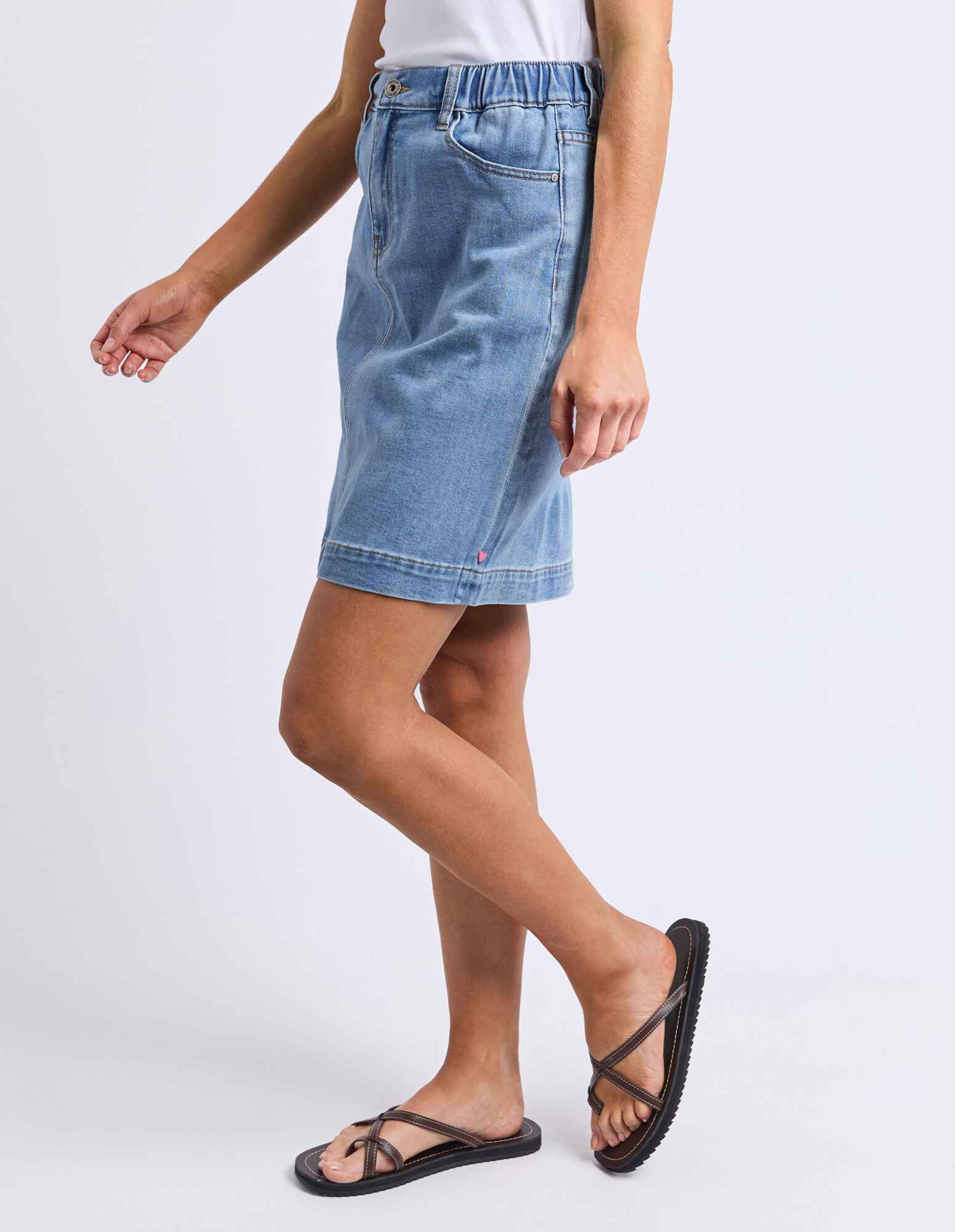 The Birdie Denim Skirt brings playful charm with its comfy elastic at the side seams and back waist, giving you the perfect fit every time. Its knee-length cut is easygoing and flattering, while the Elm-stamped hardware adds a fun, unique touch to this effortlessly stylish skirt.