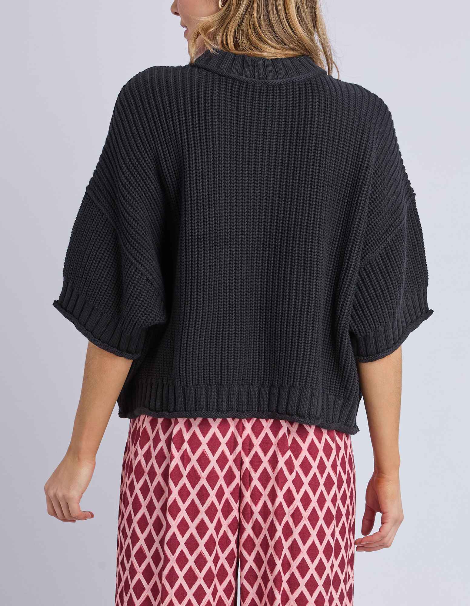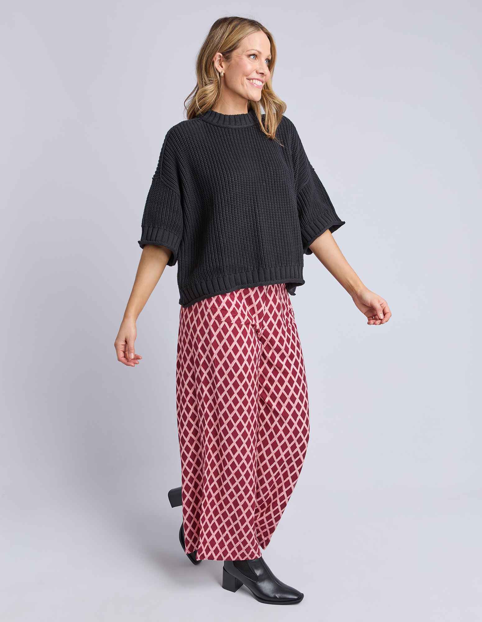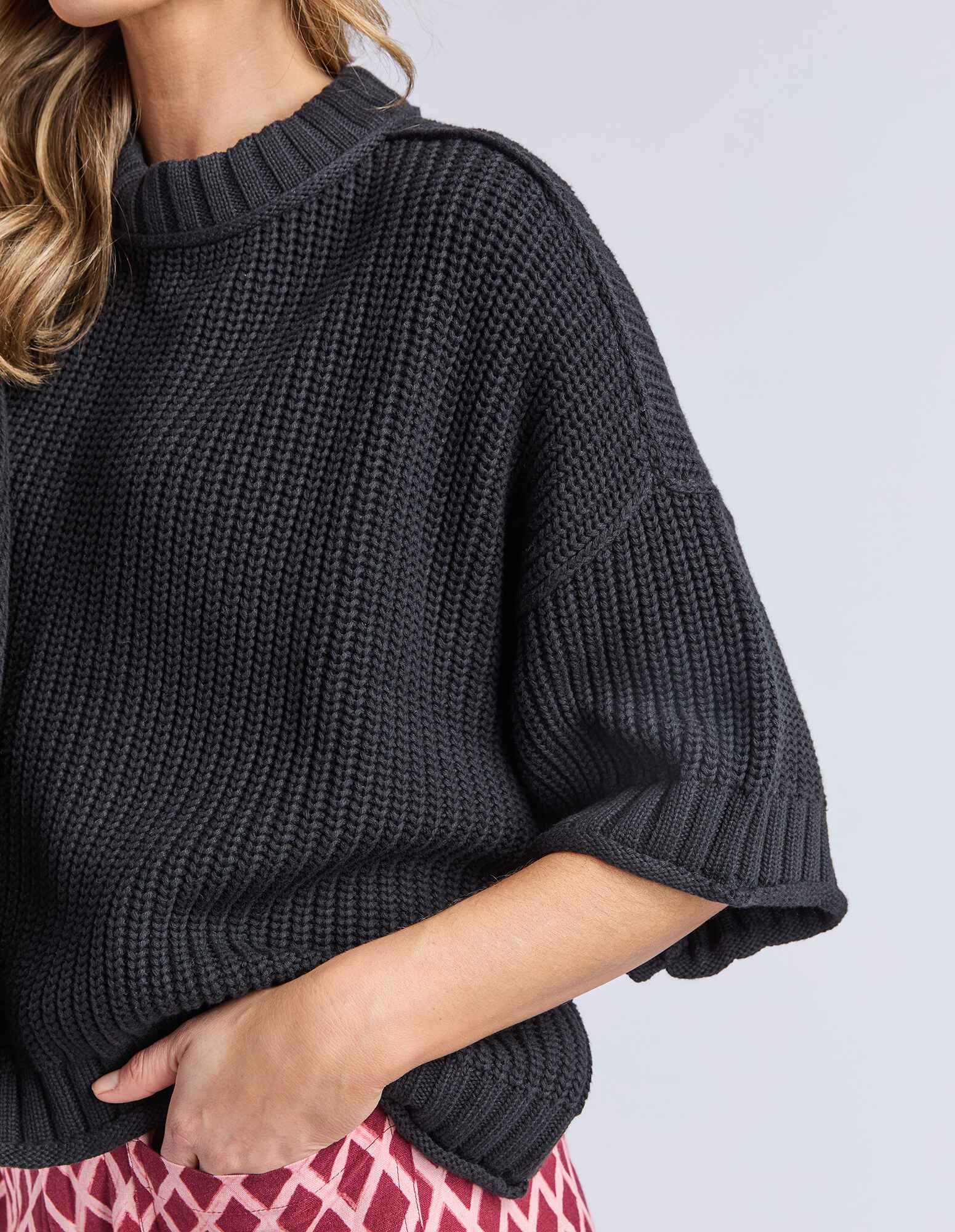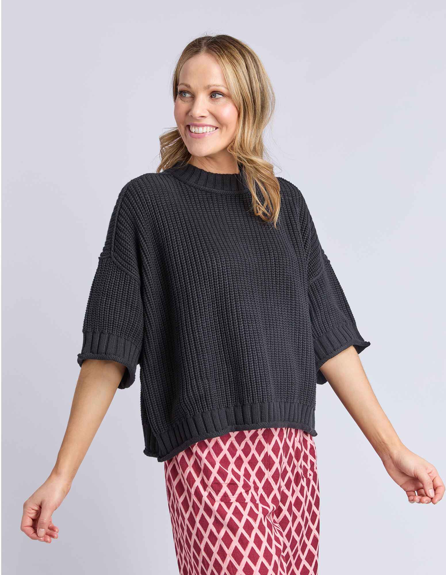 A modern essential with an effortless feel, this short sleeve knit is the perfect blend of comfort and style. Designed in a relaxed, slightly boxy silhouette, it features a textured knit finish, soft drape, and a classic crew neckline for timeless appeal. The elbow-length sleeves and ribbed trims add subtle structure while keeping the look easy and wearable.