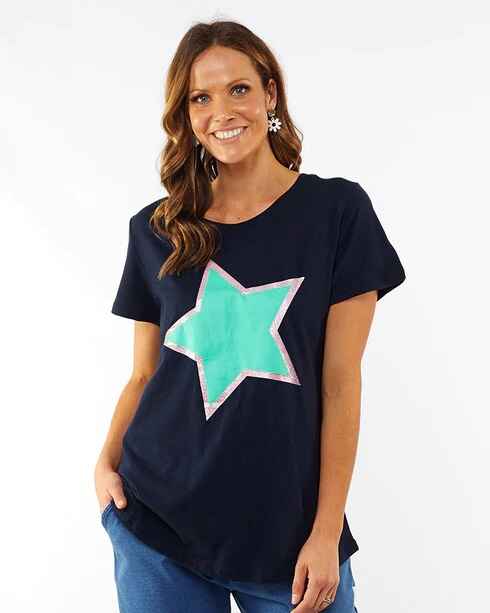 This Elm Pop Star Tee in 100% Cotton is a classic navy tee with a great fit. Featuring a green and pink star on the front!