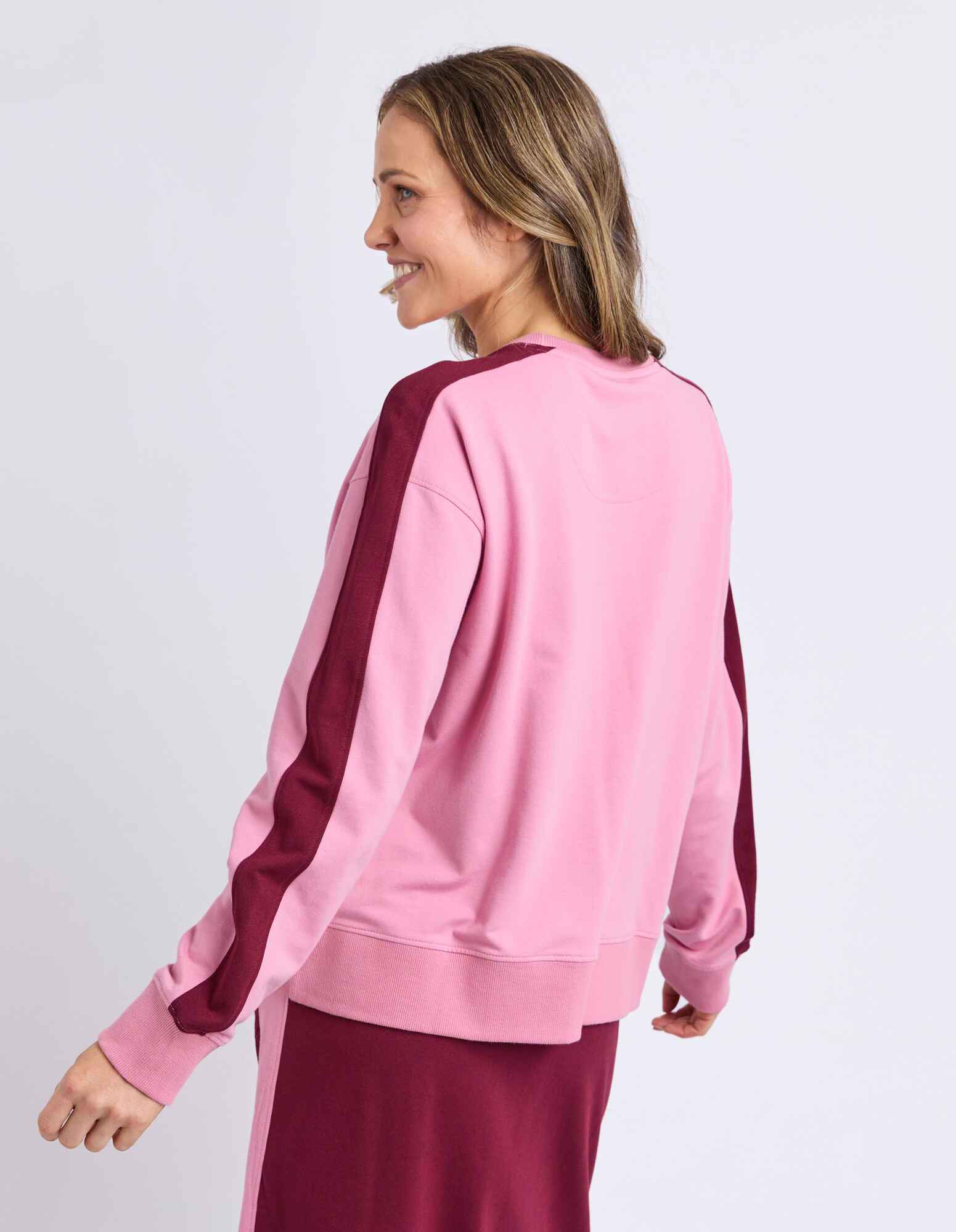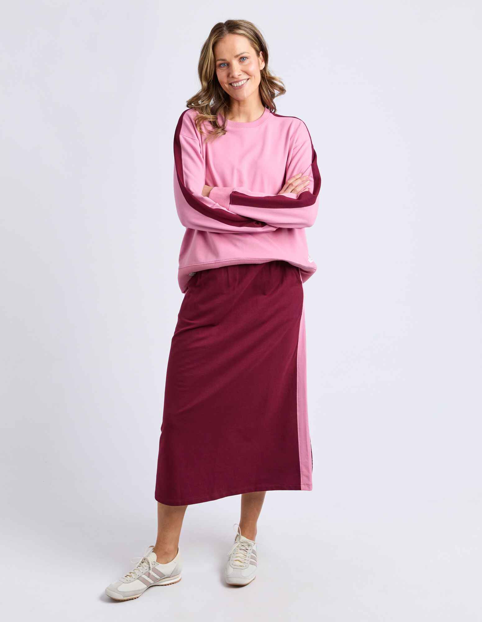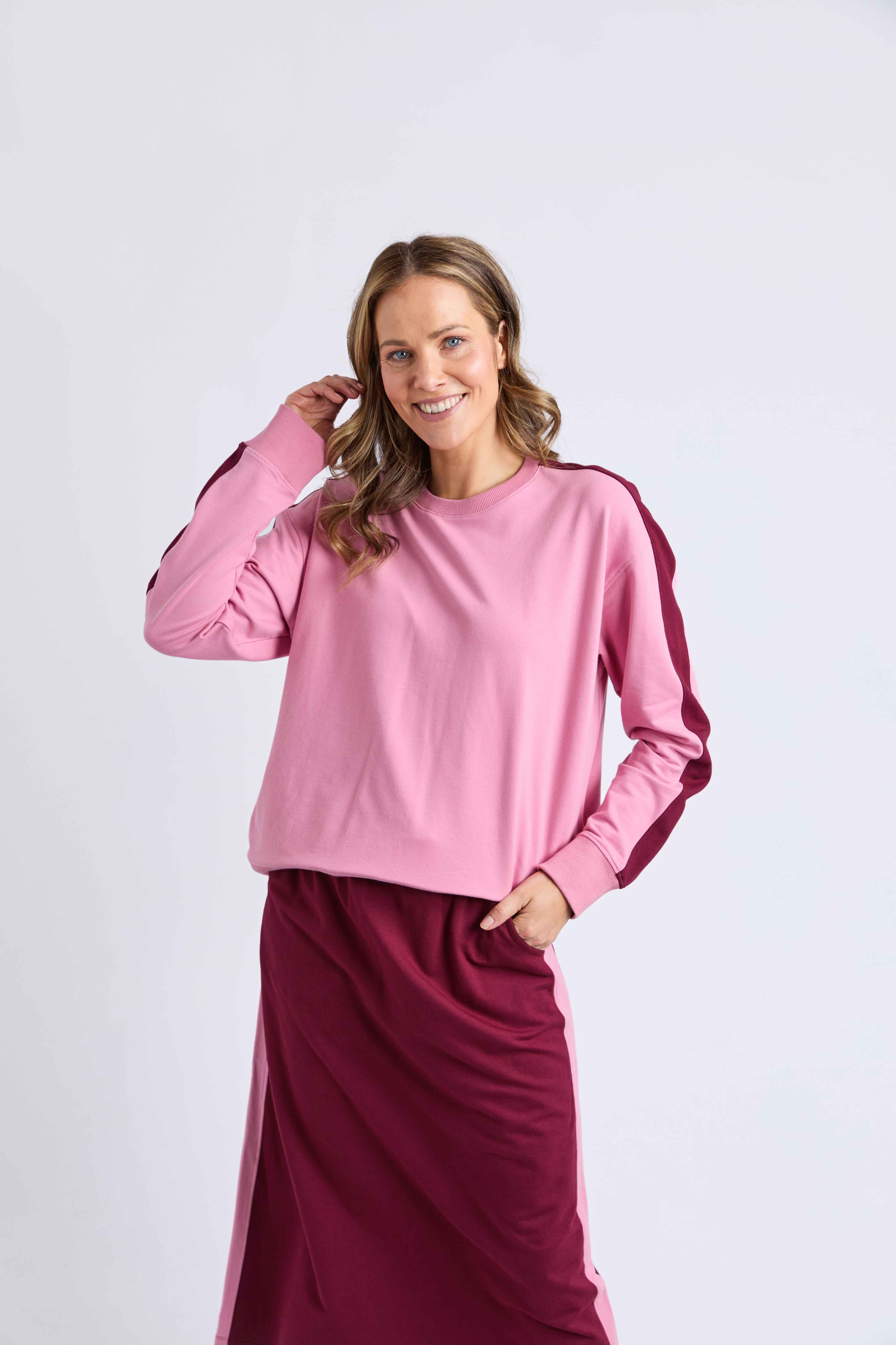 A comfort + crew with a touch of Elm colour and fun. Featuring a fun side stripe panel along the shoulder and sleeves this relaxed fit jersey crew looks great worn with your favourite loungewear or pop it on with the Sloane Skirt for a comfort + lounge set.