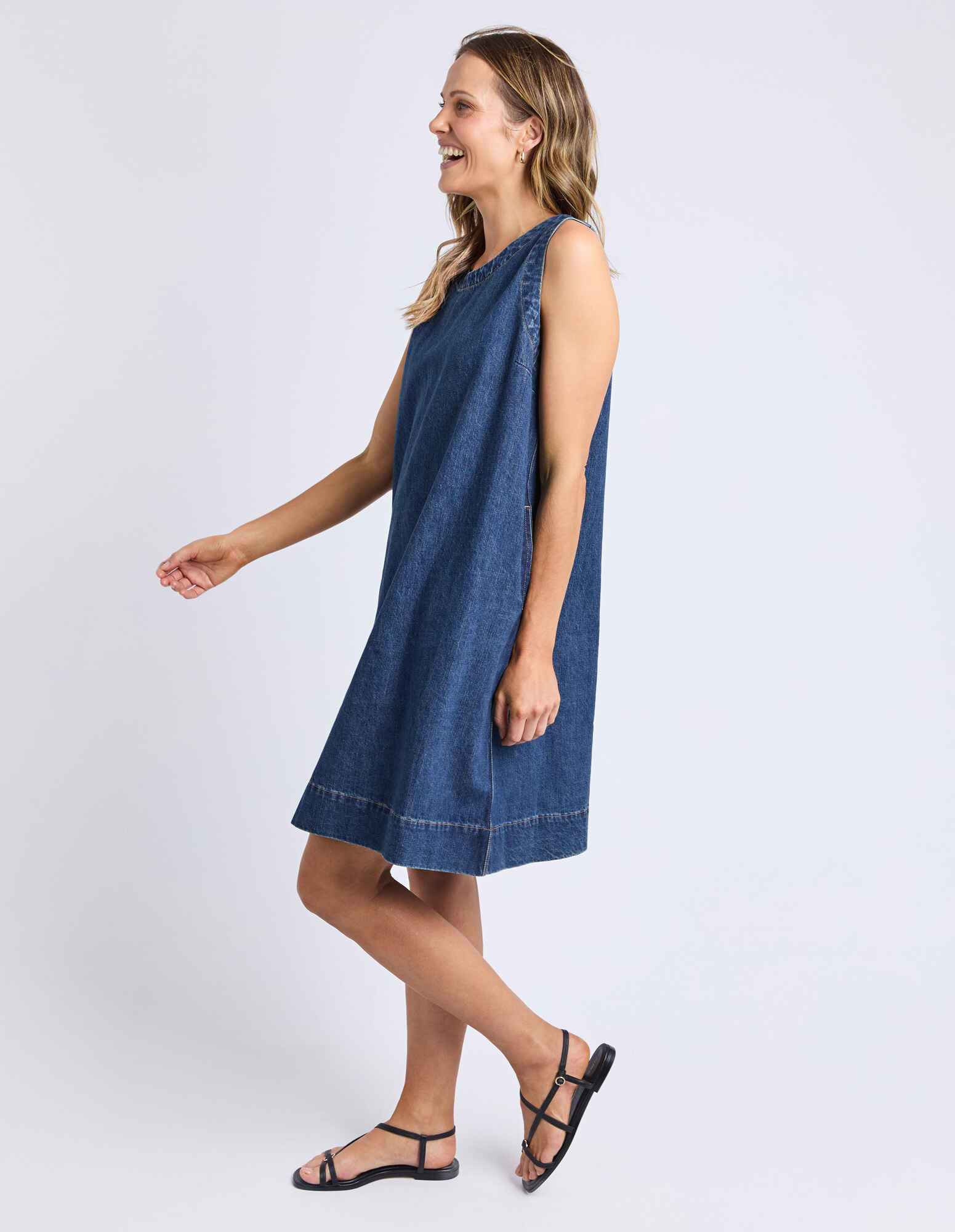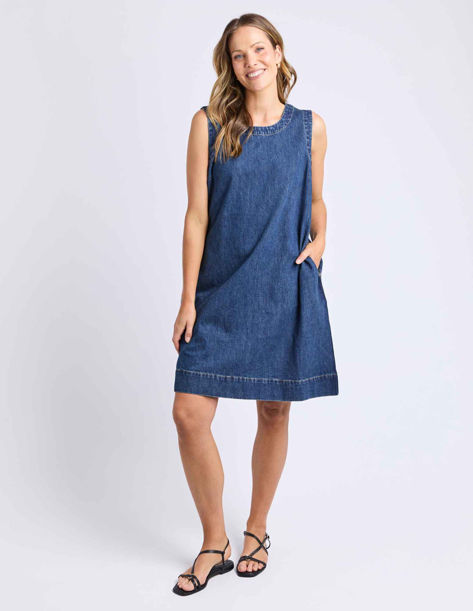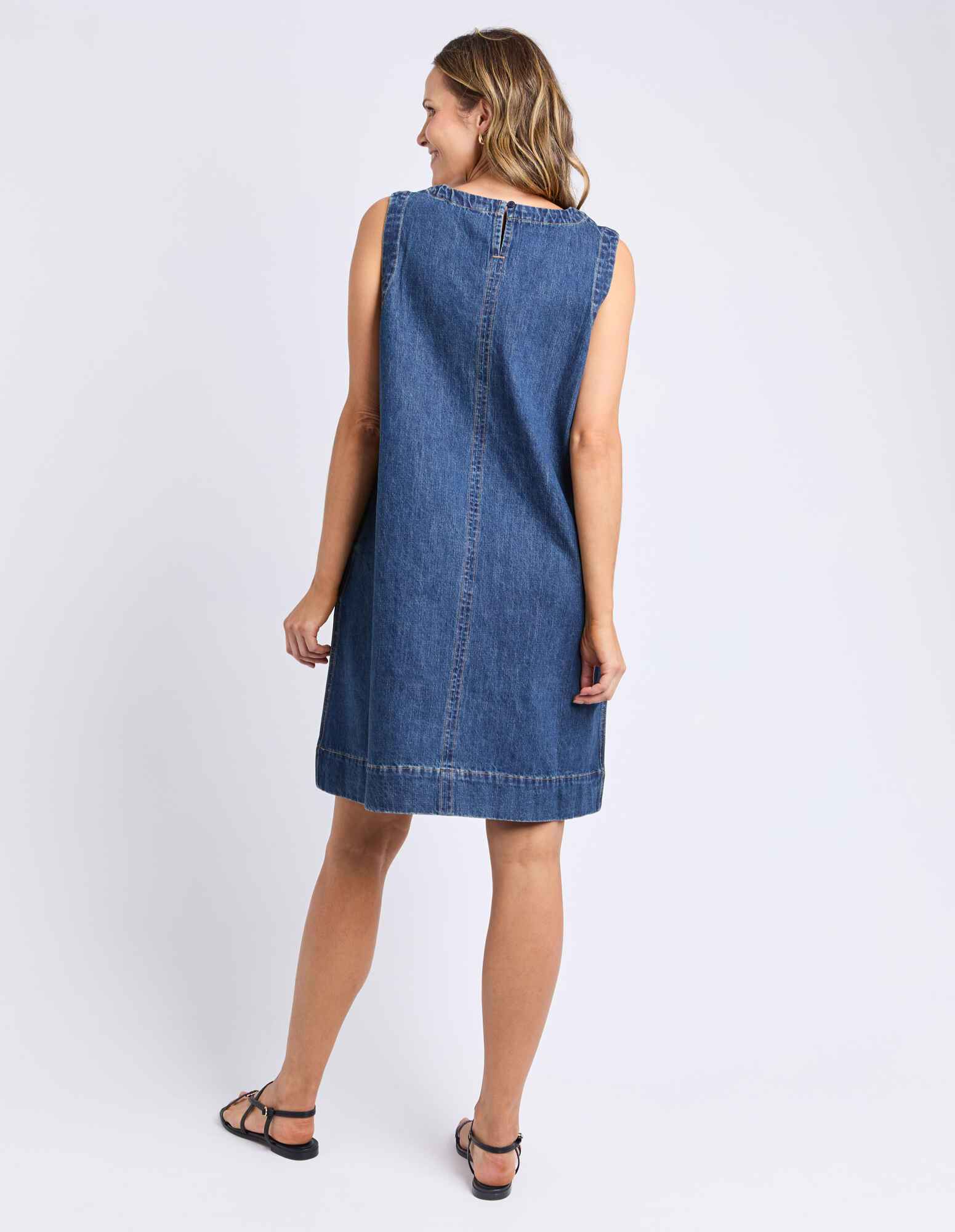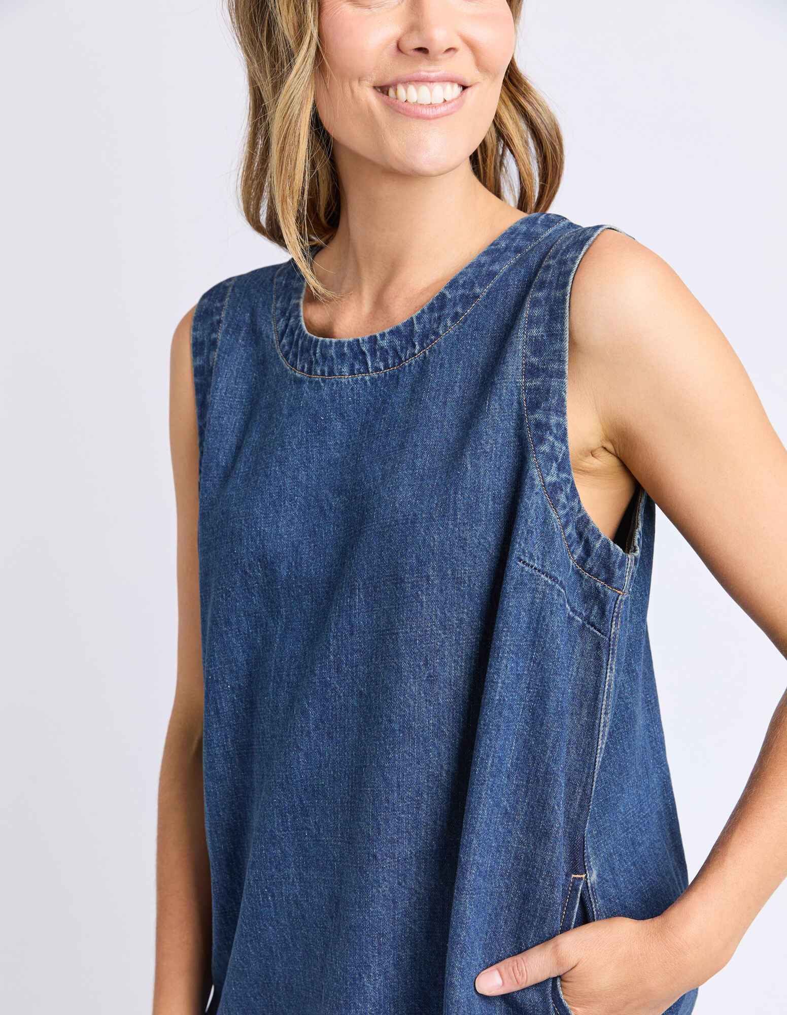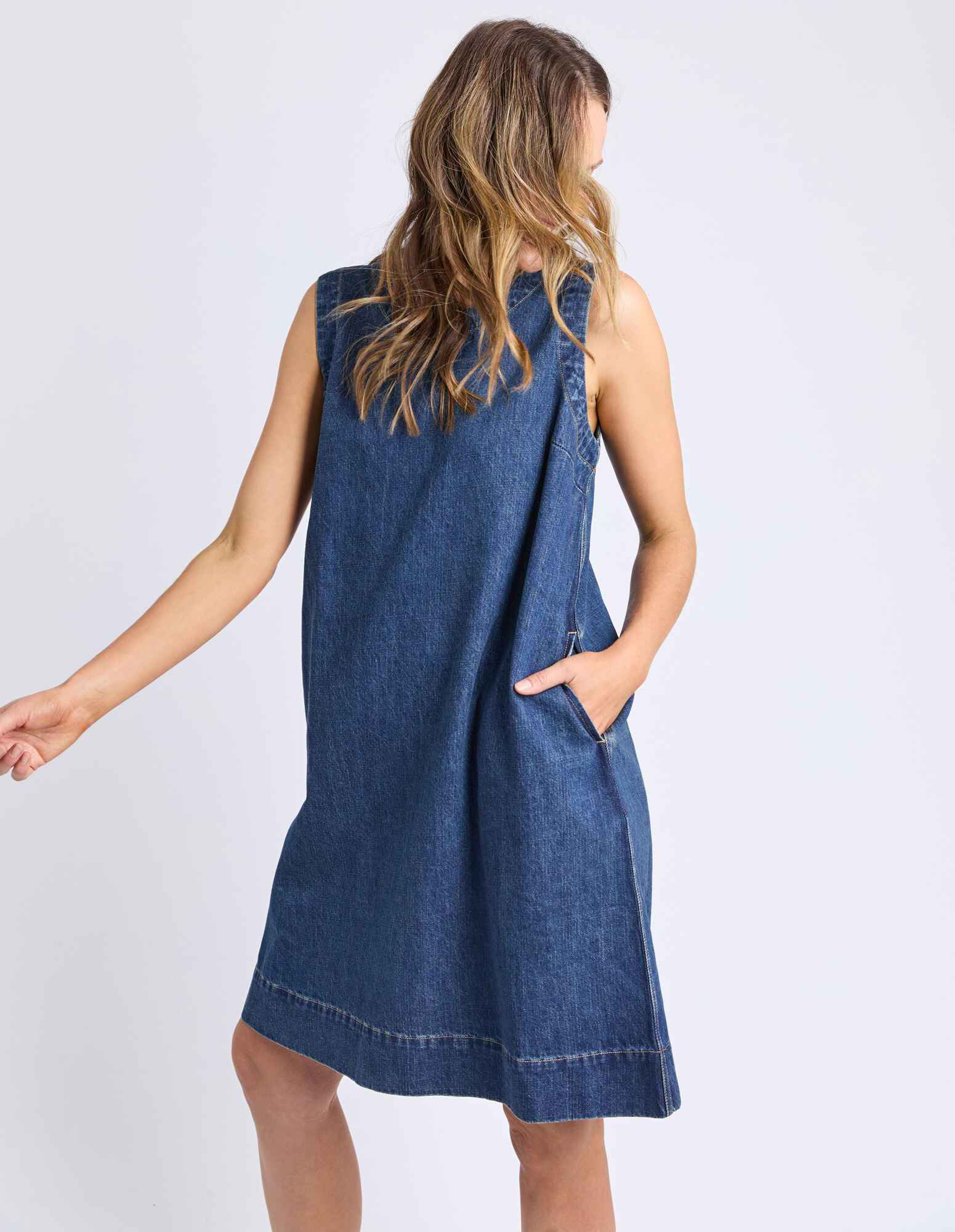 A flattering and versatile A-Line Denim Dress that can be worn for so many occasions. Featuring pockets and a button open neckline, this mid thigh dress is versatile and you'll find yourself wearing it on repeat.