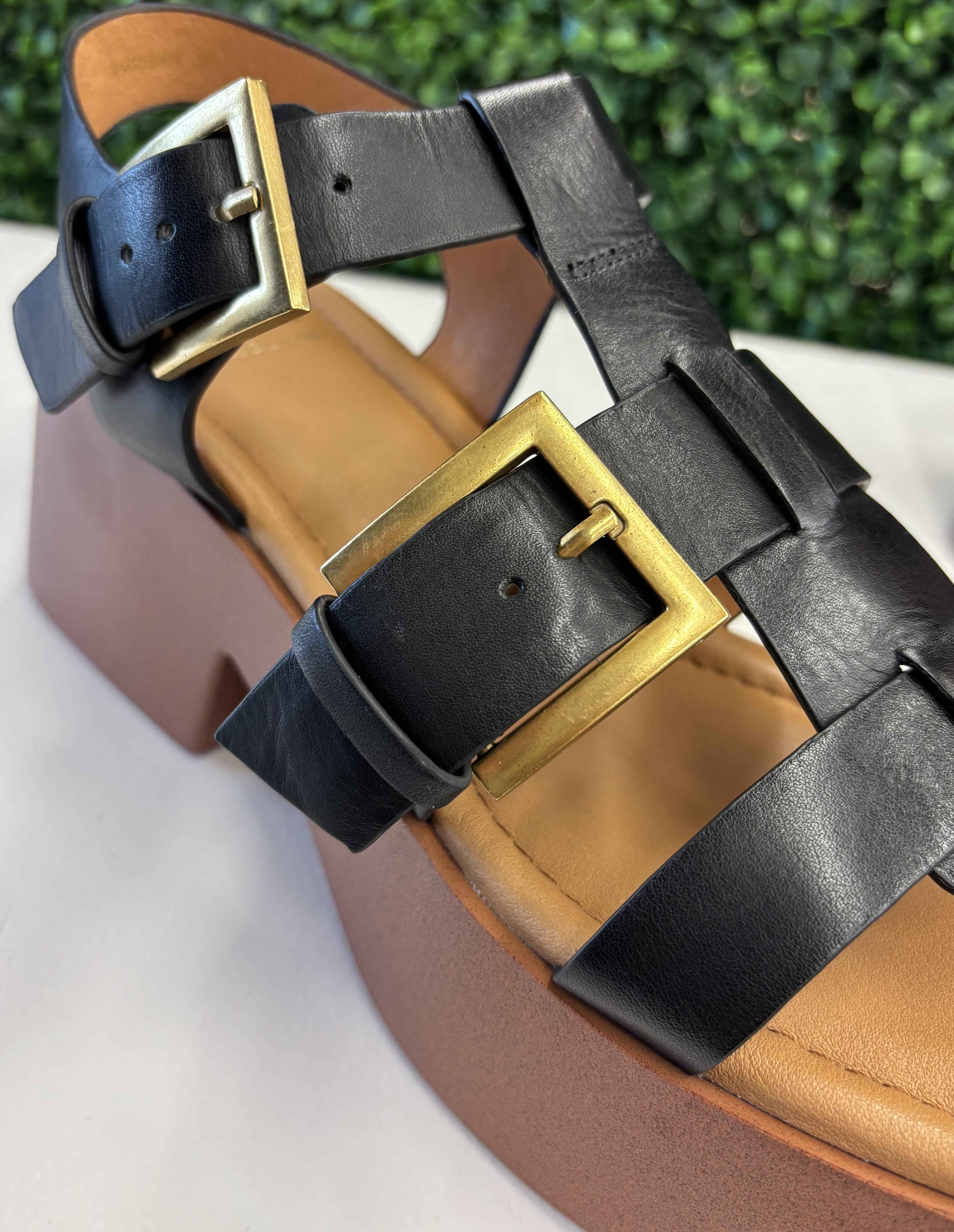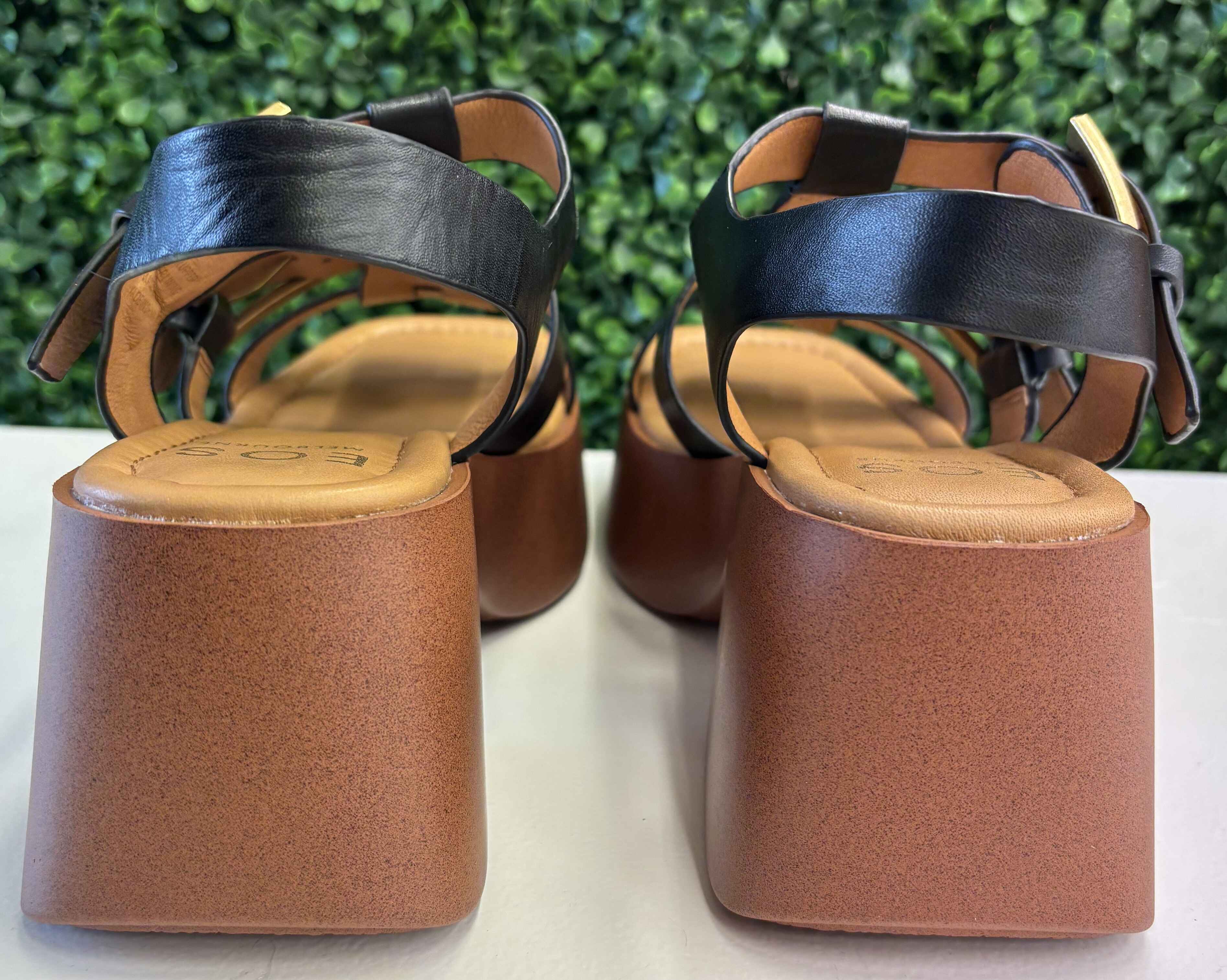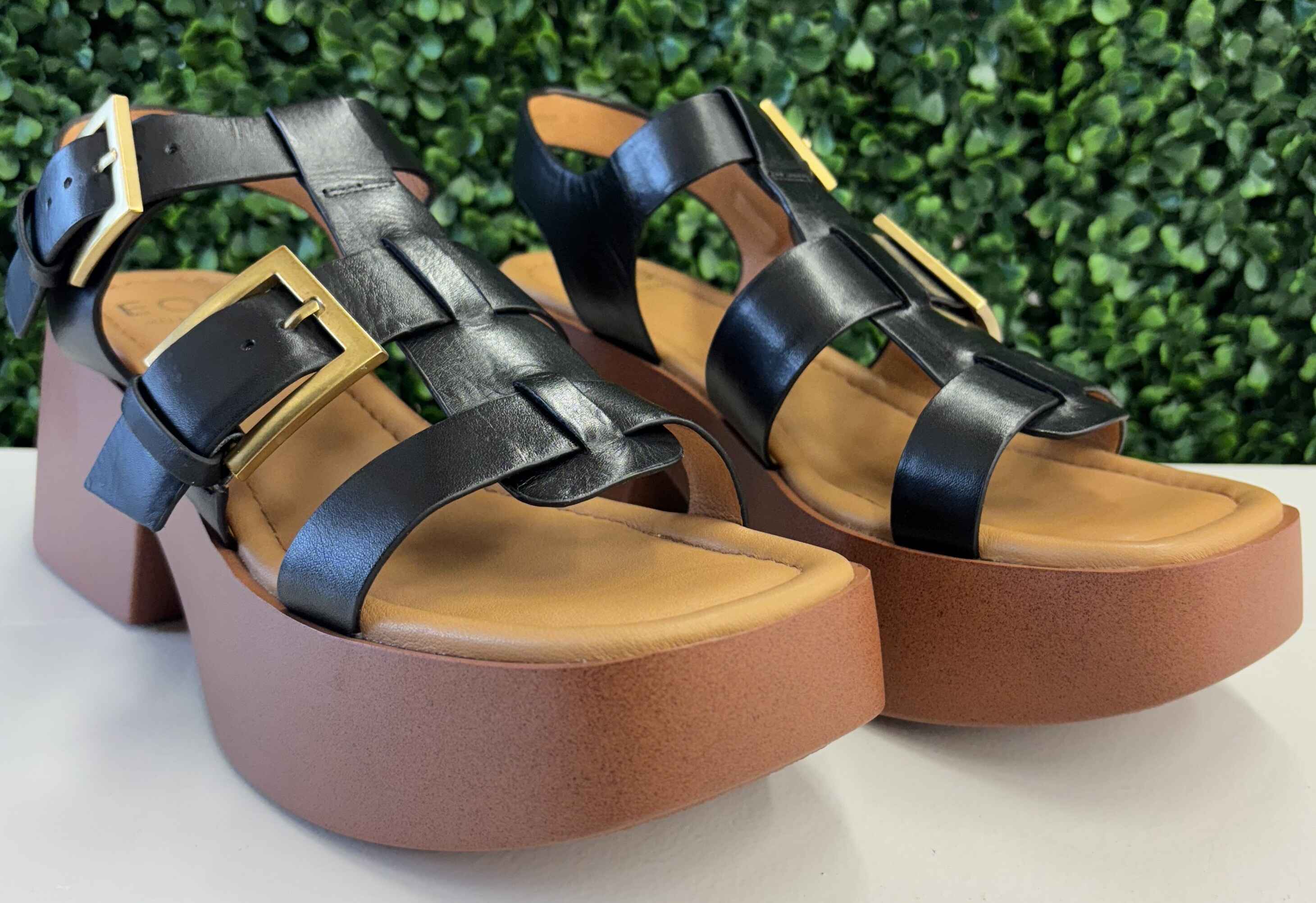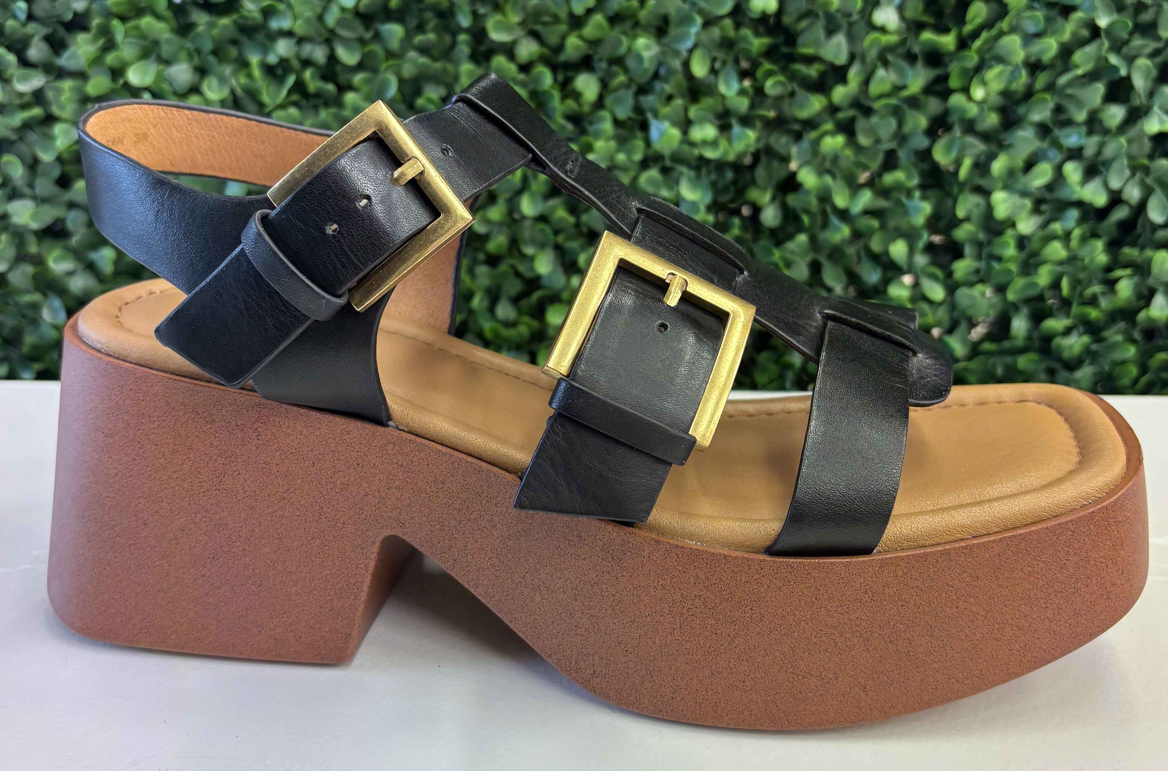 Modern and chic, these sandals feature sleek black leather straps in a woven fisherman-inspired design, finished with bold gold-tone buckles for a touch of shine. Set on a chunky block platform with a soft cushioned footbed, they balance statement style with everyday comfort. Perfect for pairing with wide-leg trousers, summer skirts, or effortless day-to-night looks, they’re a standout staple for the season.