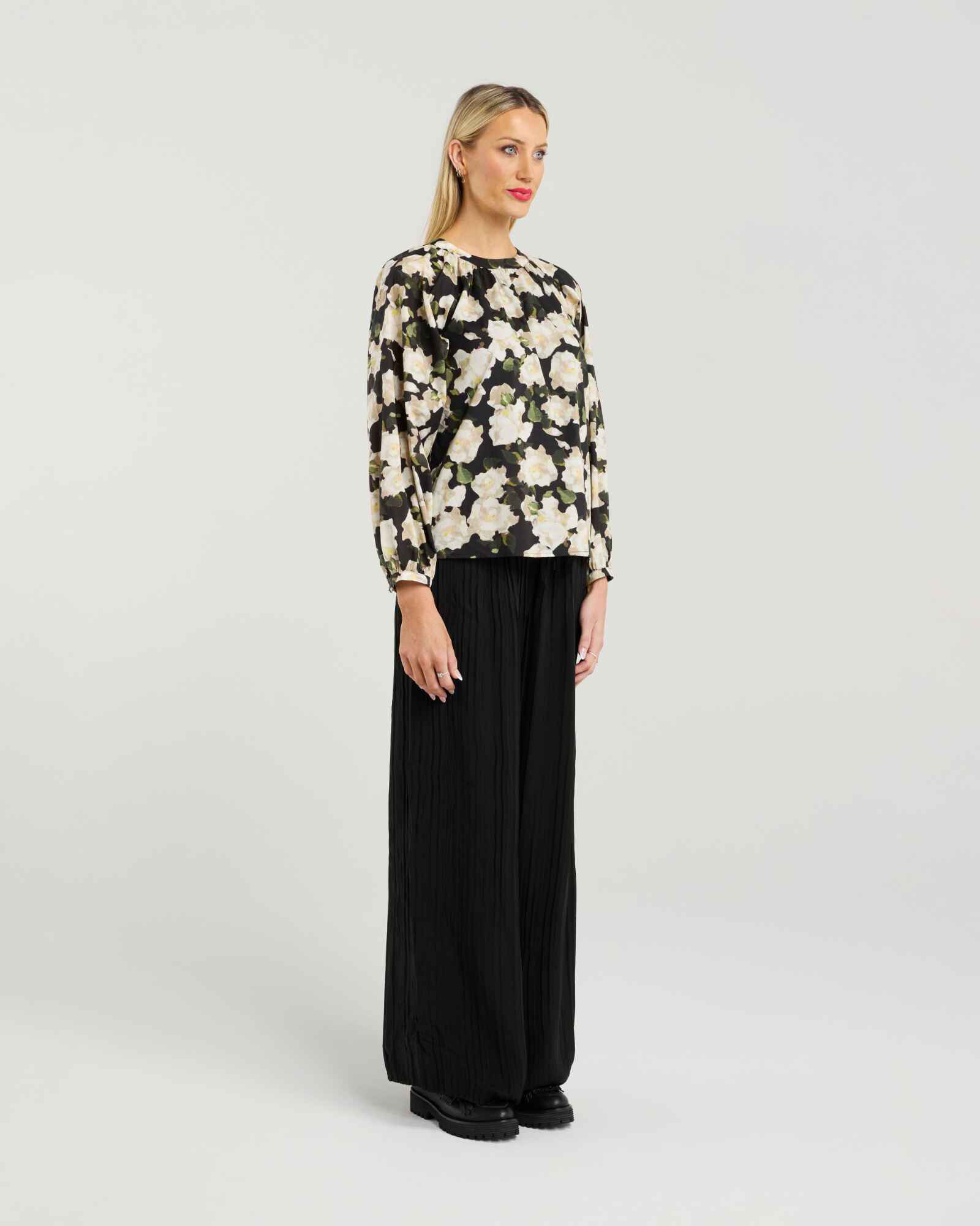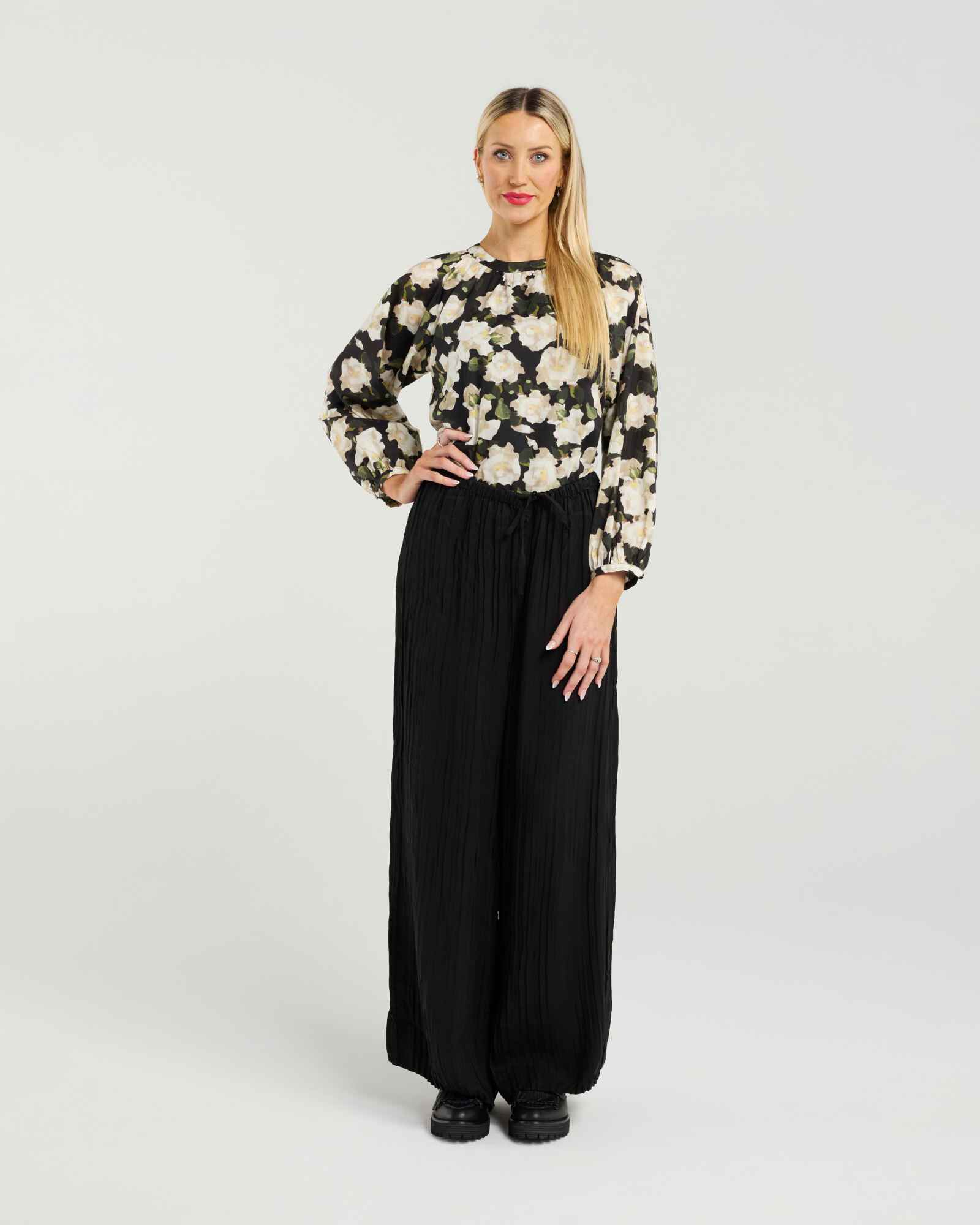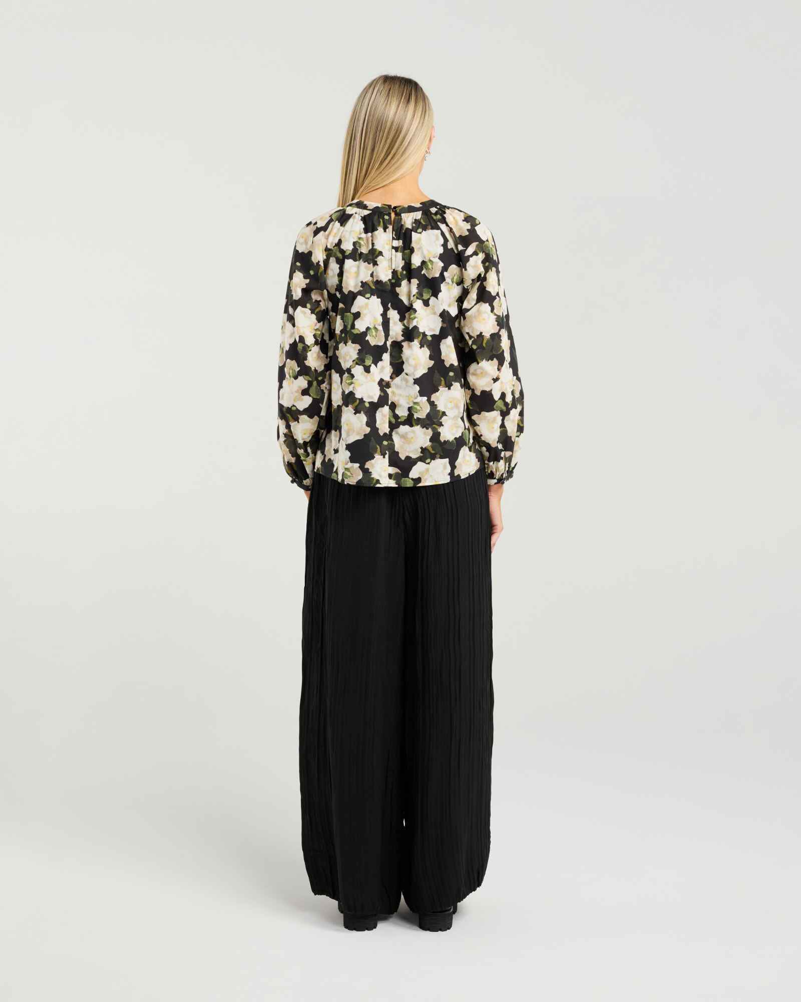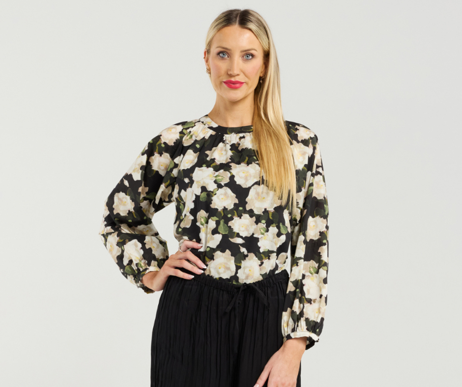 Effortlessly feminine with a touch of drama, the Dallas Top is crafted from 100% cotton and features a beautifully rounded neckline that keeps the look clean and refined. The statement bishop sleeves showcase a soft yet striking silhouette, brought to life in a romantic, painterly floral print that adds instant impact without overwhelming.