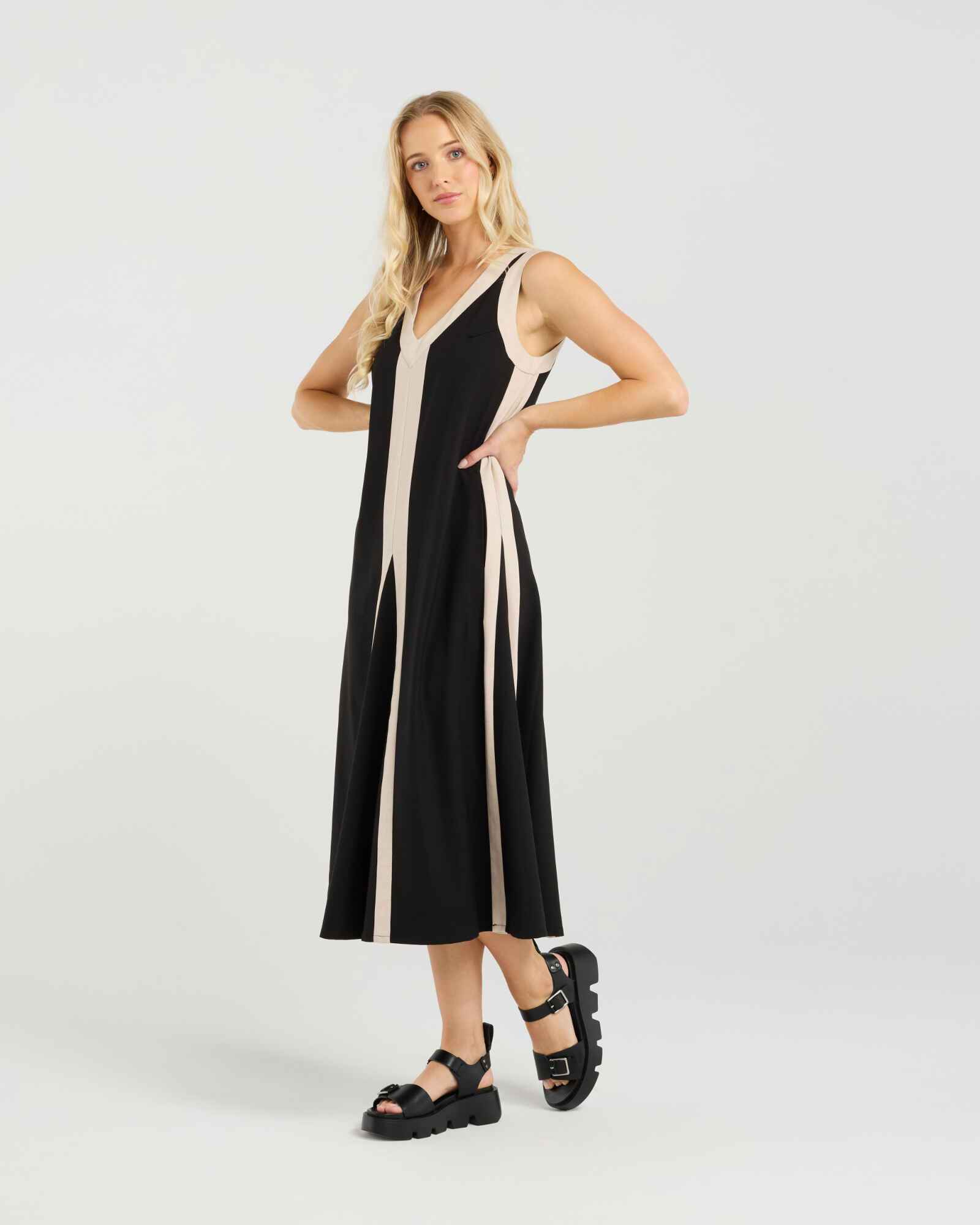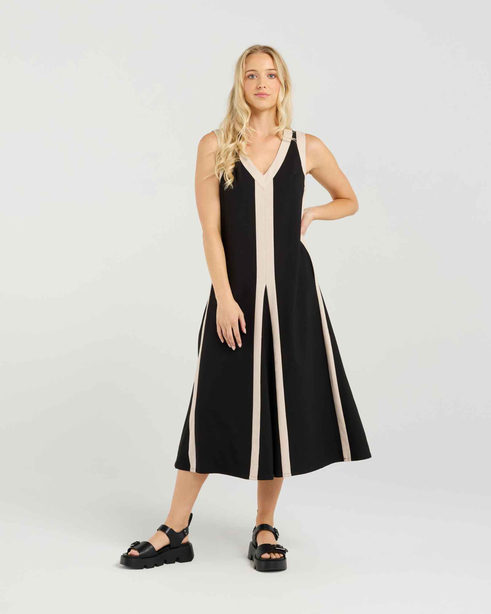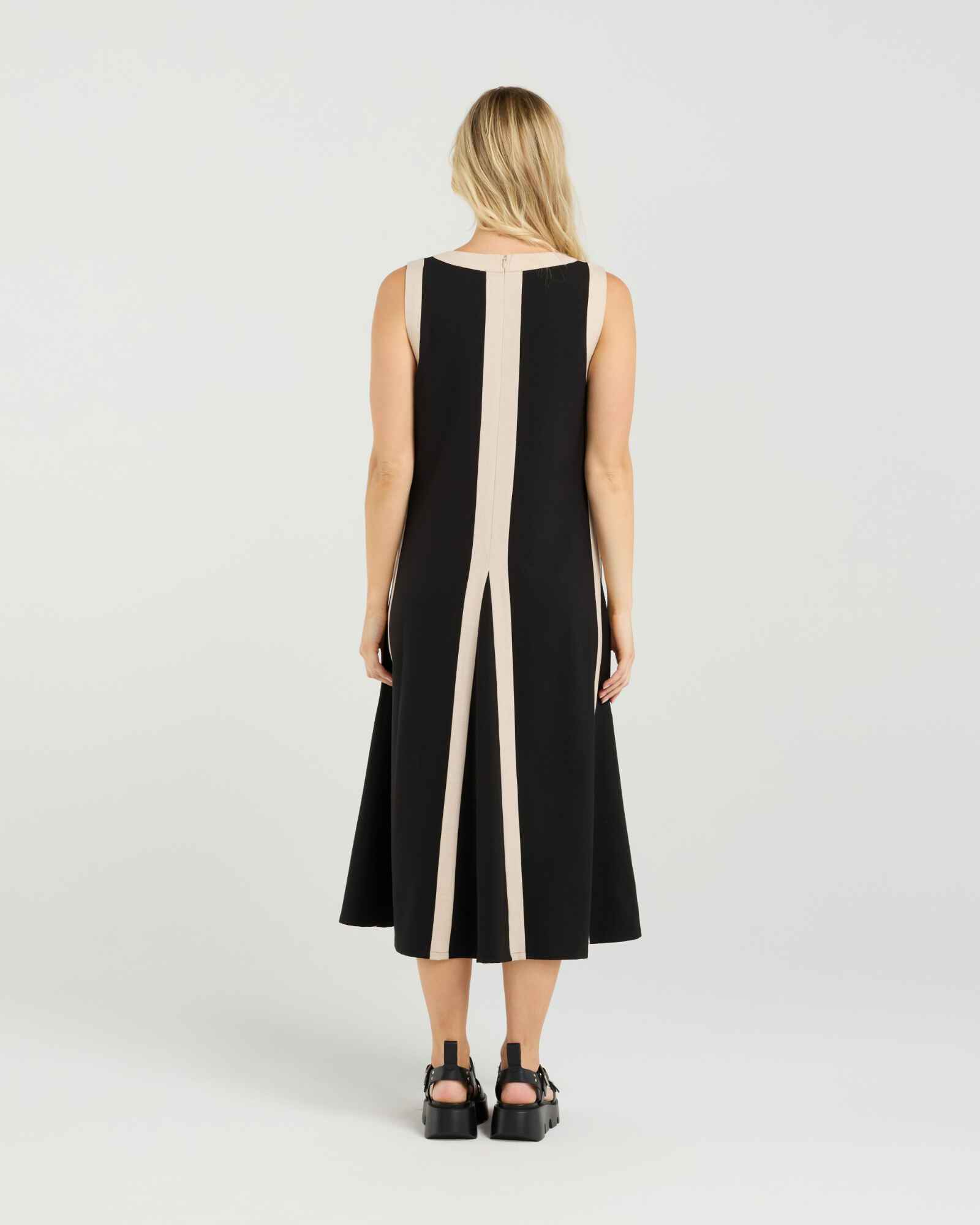 Striking in its simplicity, this sleeveless V-neck dress is designed to flatter with clean lines and thoughtfully placed contrast panels that elongate the silhouette. Cut for ease and movement, the streamlined shape is elevated by the unexpected practicality of side pockets. A modern essential that balances structure and softness—perfect for day-to-night wear.