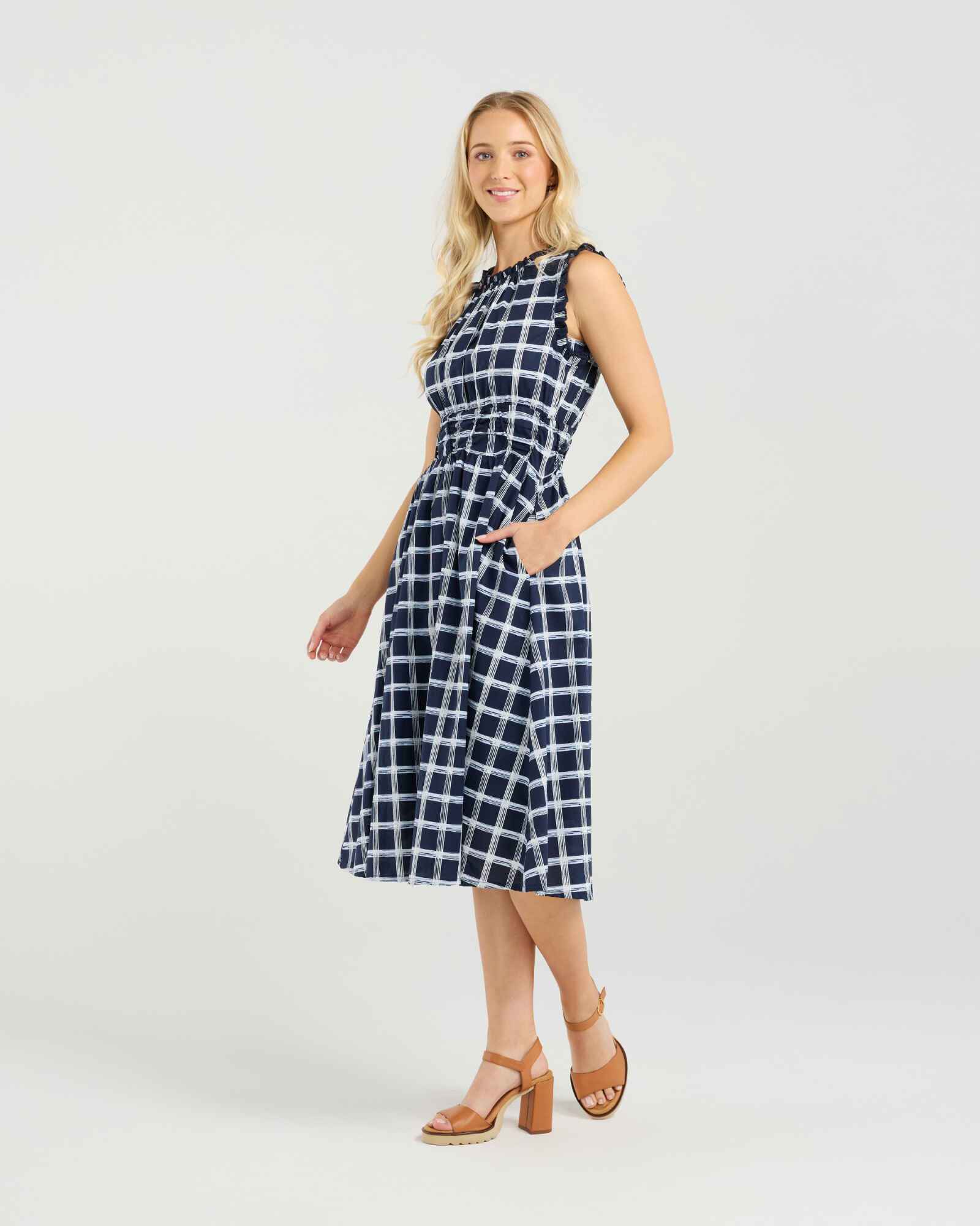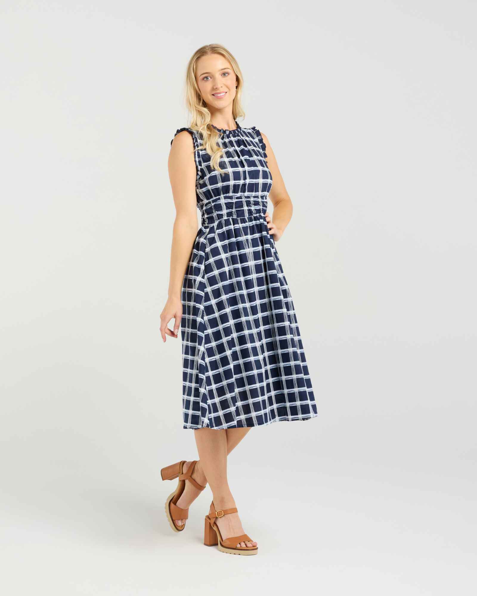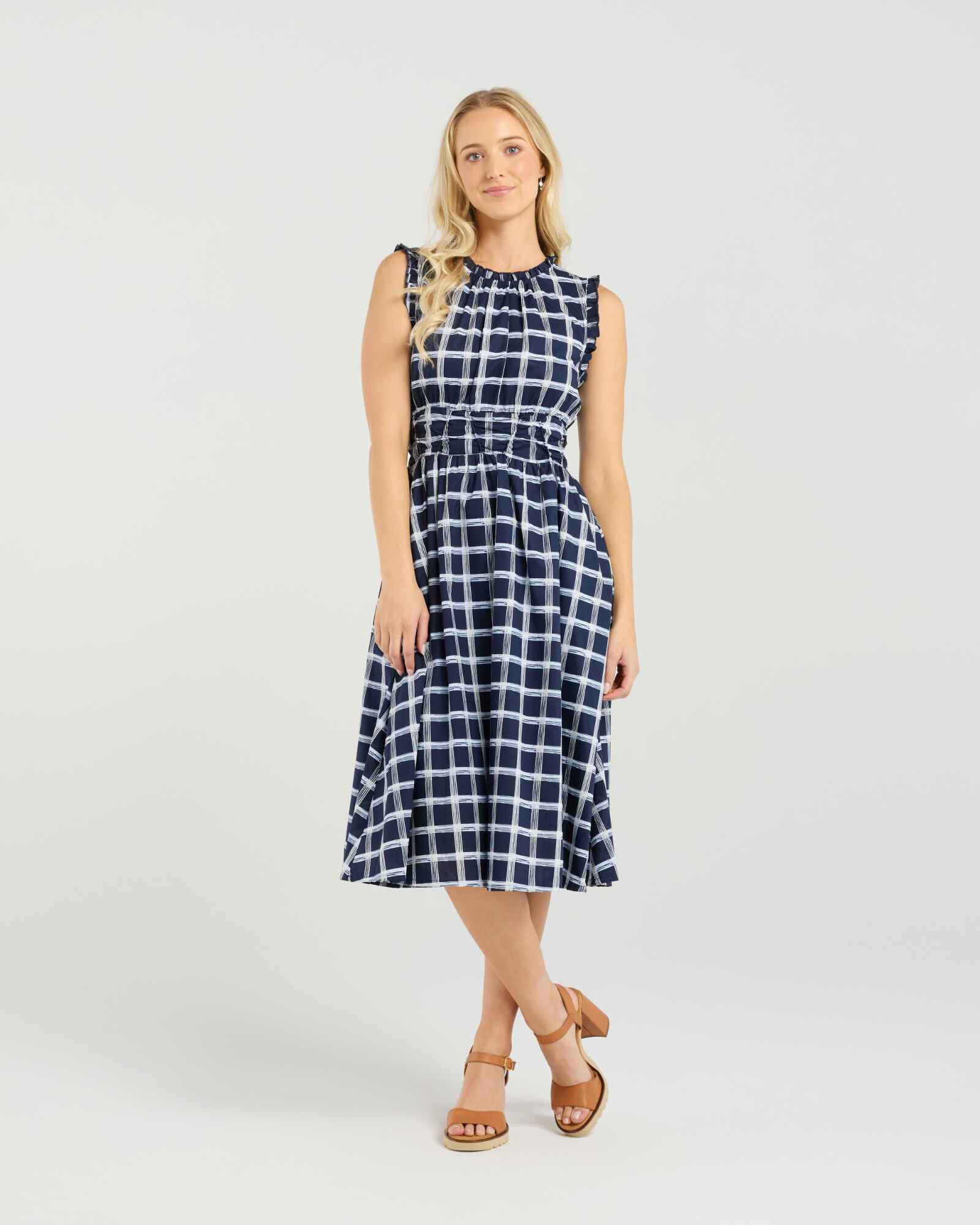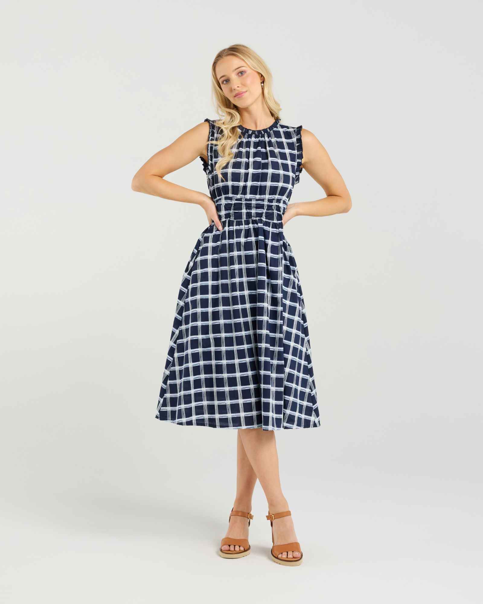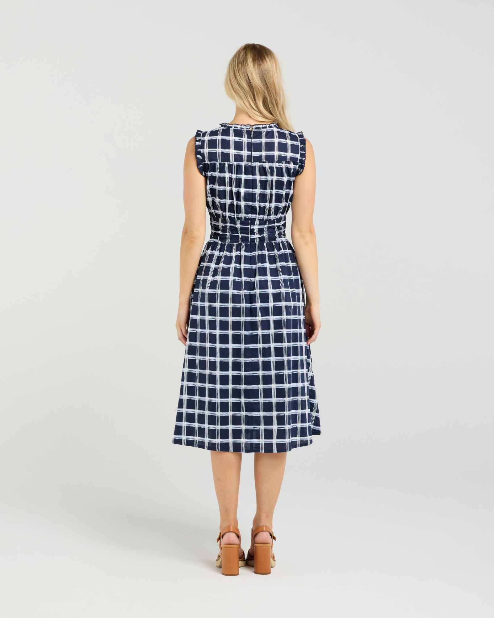 Romantic yet tailored, this sleeveless dress features a beautifully fitted bodice and a nipped-in waist that flows into a softly structured A-line skirt. Delicate frill detailing at the neckline and armholes adds a feminine touch, while piping detail  at the waist highlights the more fitted silhouette. Perfect for this summer BBQ's with sandals or with a heel for a summer wedding.