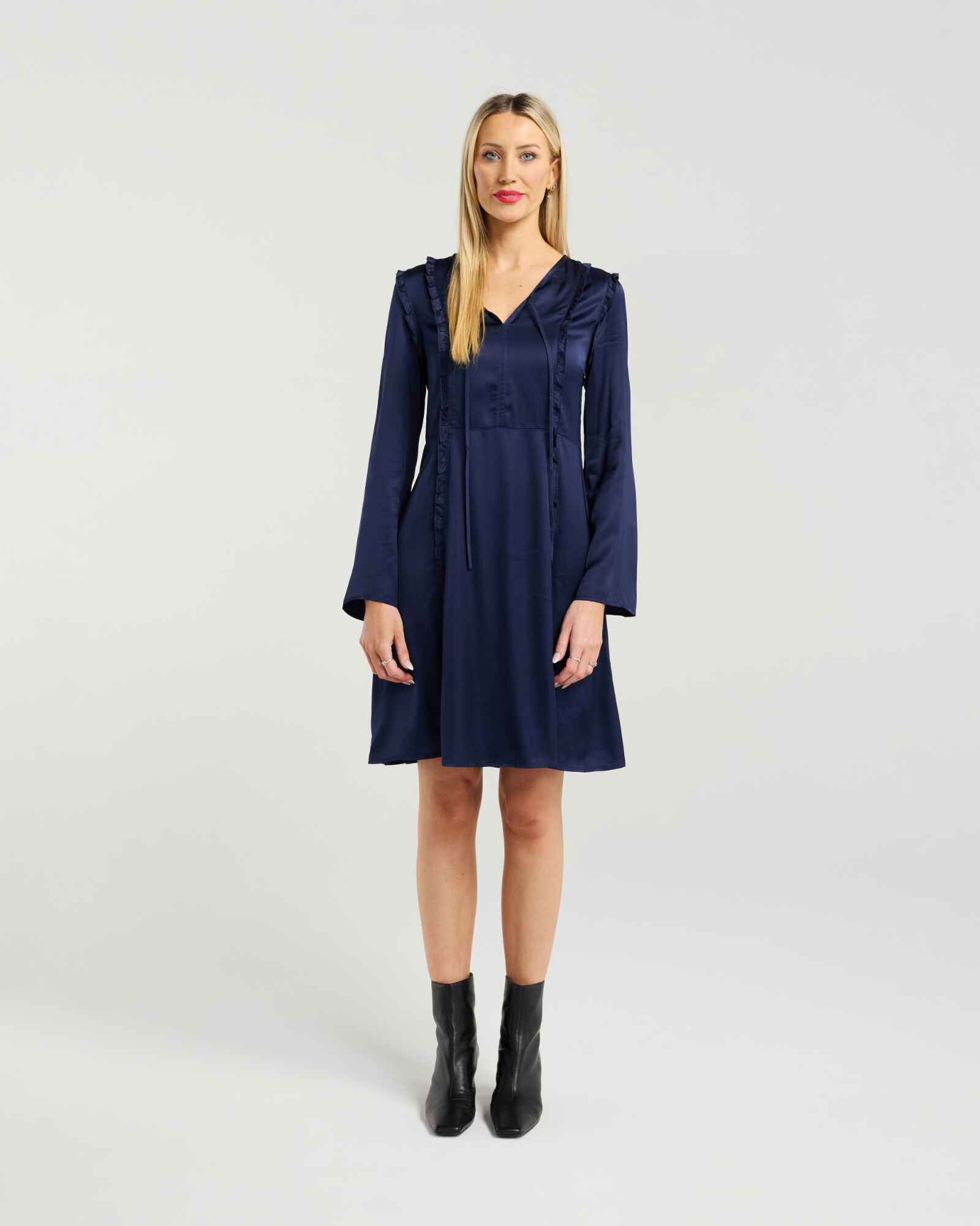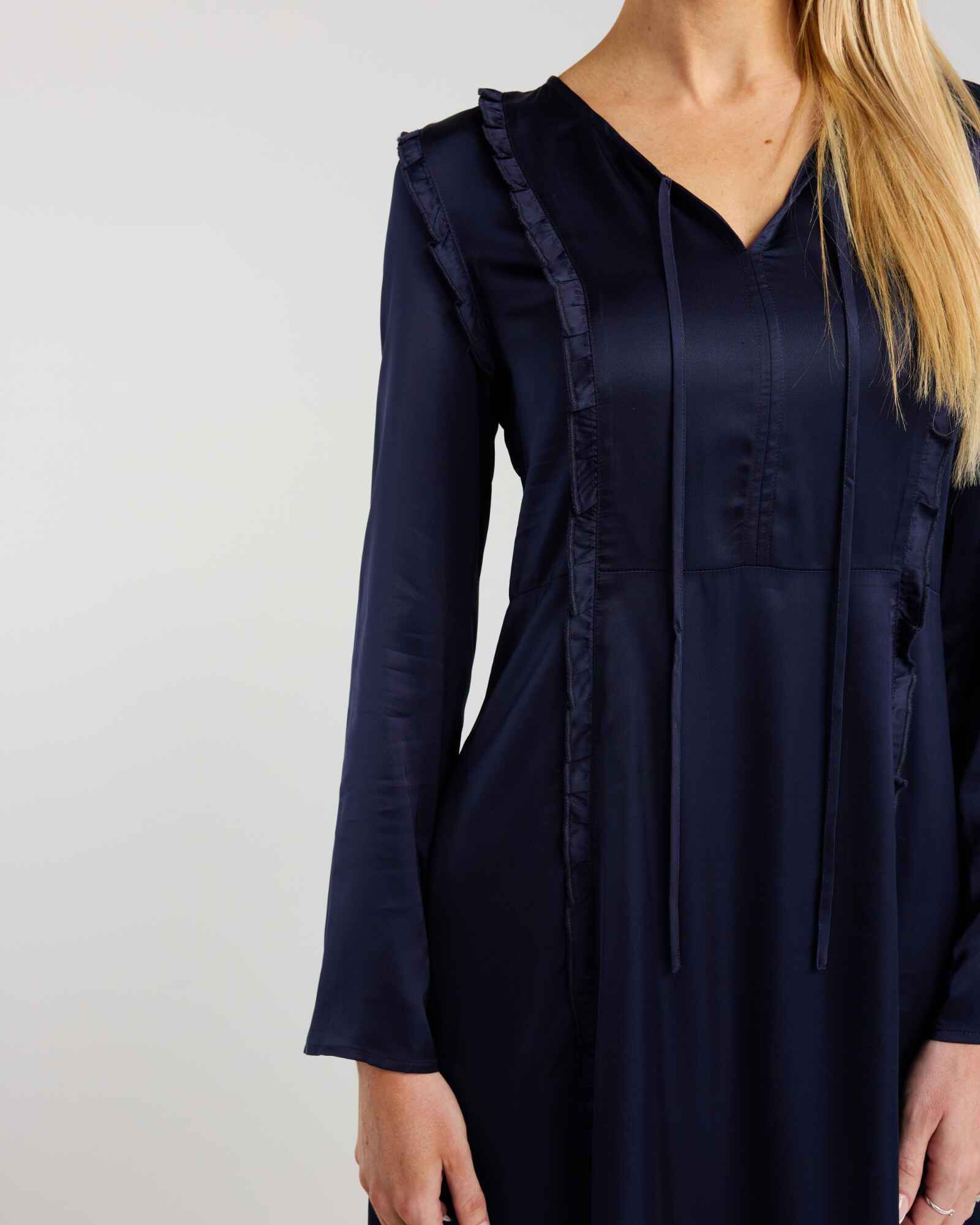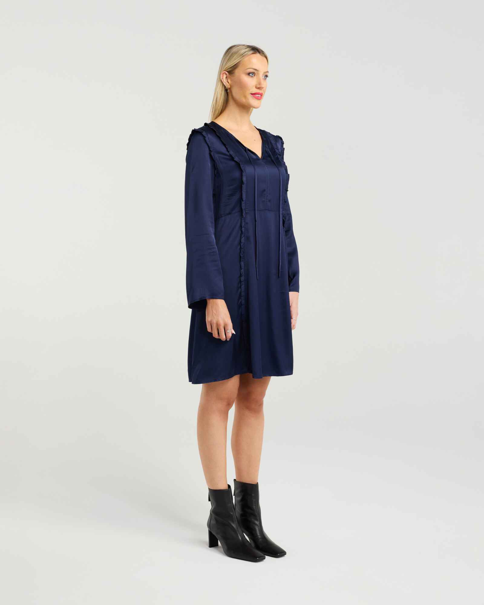 A beautifully refined piece, the Sienna Dress brings effortless elegance to any occasion. Crafted from a soft rayon–viscose blend with a subtle satin sheen, it drapes fluidly and feels luxurious on the skin. The flattering V-neckline features a delicate tie, while a fine frill detail cascades softly down the front, adding gentle movement and feminine charm. Long sleeves finish with a wider cuff that creates an elegant silhouette without feeling structured. Falling to the knee, this versatile dress is perfect for everything from daytime events to evening dinners. Simply pair with heels or boots and let its understated sophistication shine.