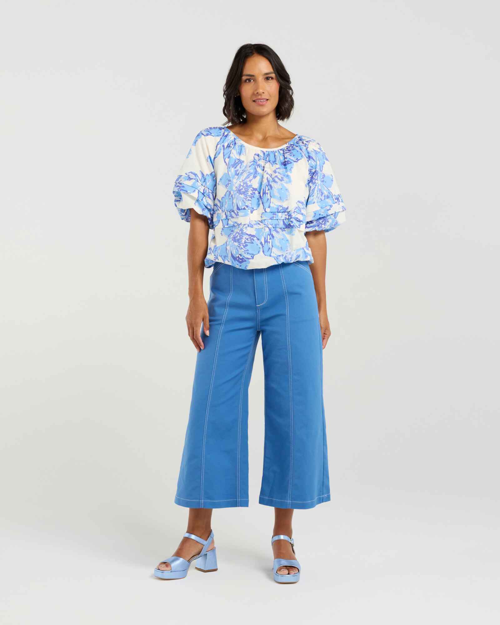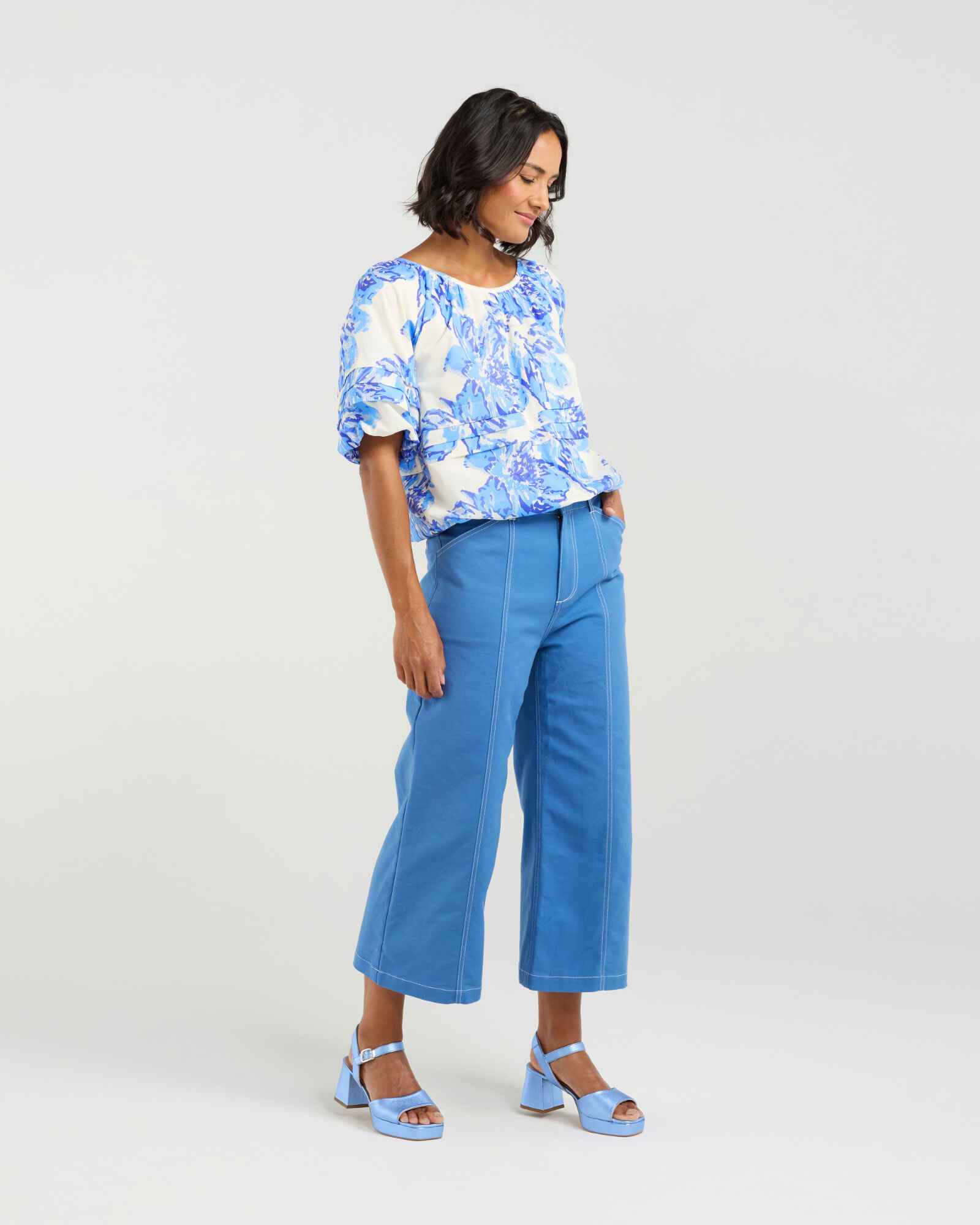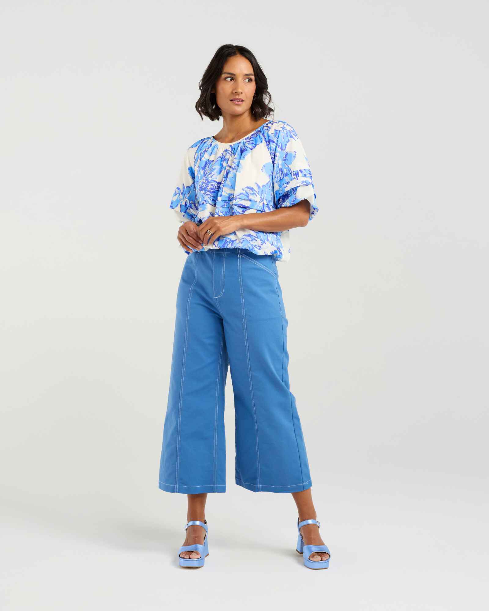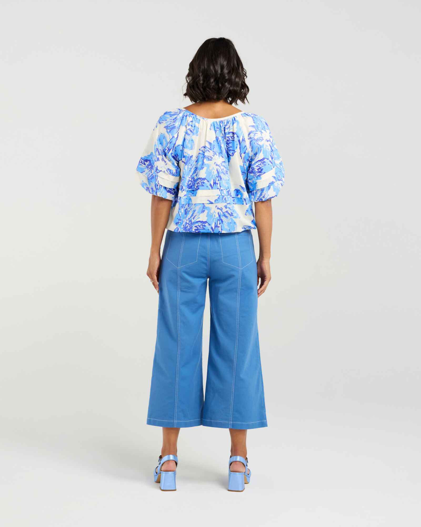 Embrace effortless elegance with this wide scoop neck top, crafted from a luxurious printed cotton. The subtly gathered neckline adds a touch of texture, while the pleat detailing around the body and sleeves adds a dynamic touch silhouette. With ballooned hems at the sleeve and waist give . This top seamlessly transitions from day to night with its timeless charm.