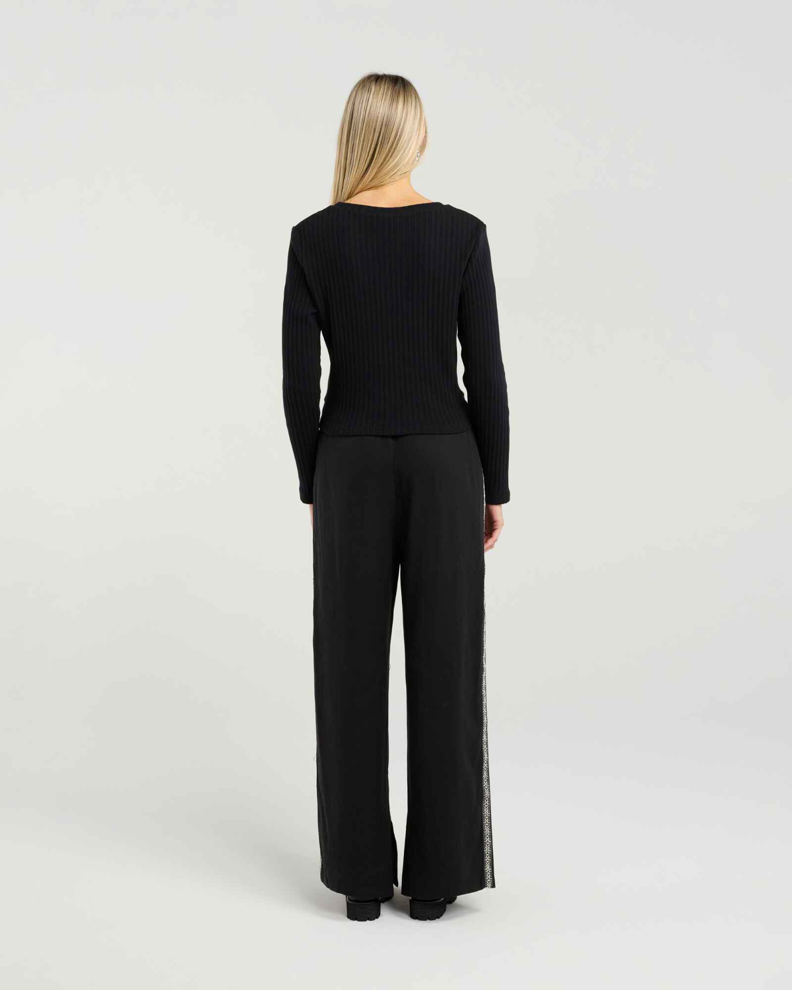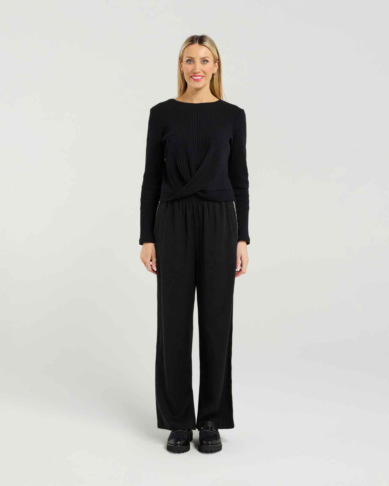 Effortlessly flattering, this long-sleeve ribbed tee is designed with a subtle front twist that enhances the waistline and creates a beautifully shaped silhouette. Crafted from a soft cotton-rich fabric with 5% spandex, it offers the perfect balance of comfort, stretch, and refined structure. The rib knit adds gentle texture, while the twist detail brings a touch of modern sophistication to an everyday essential.