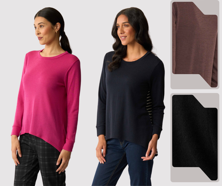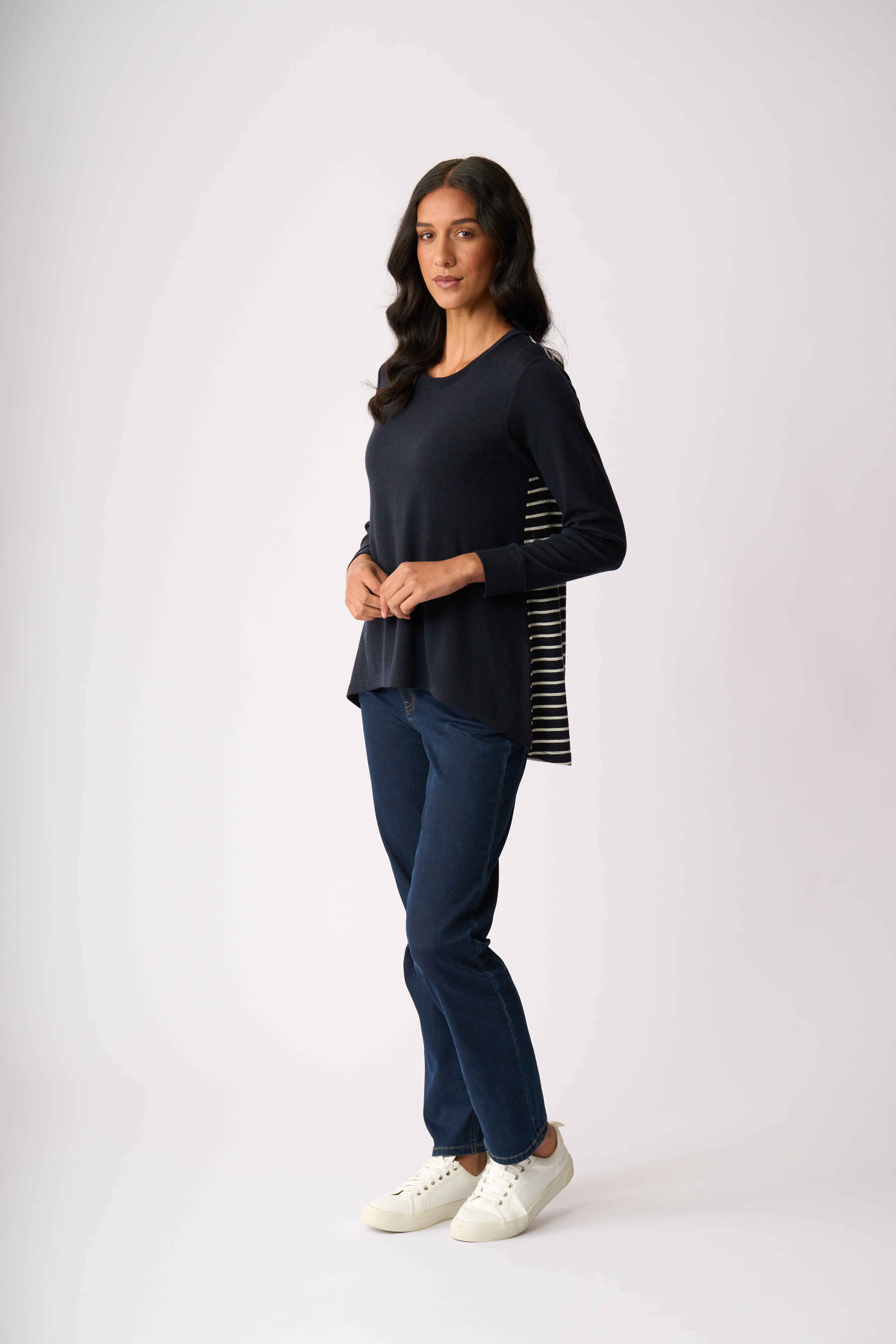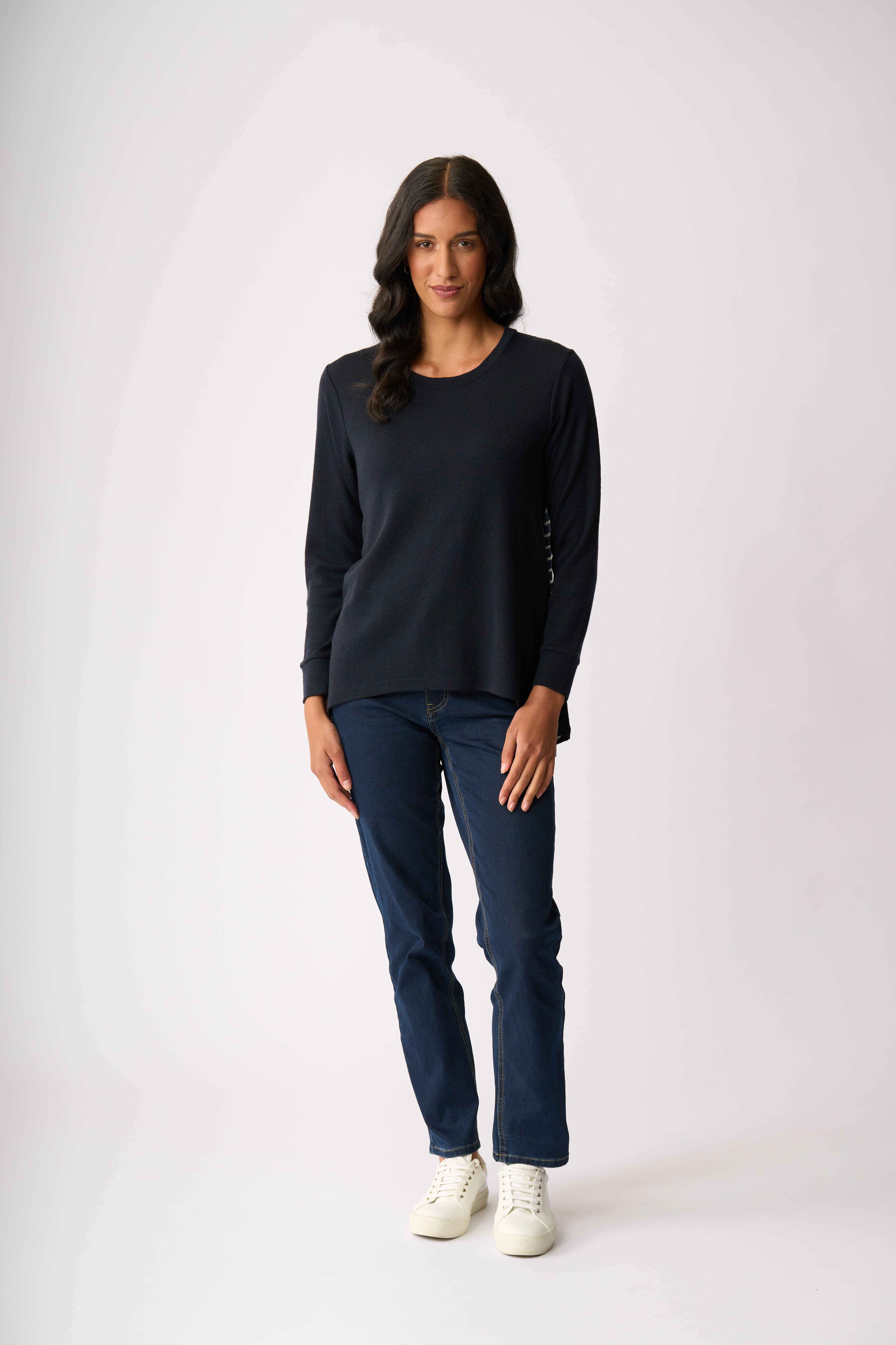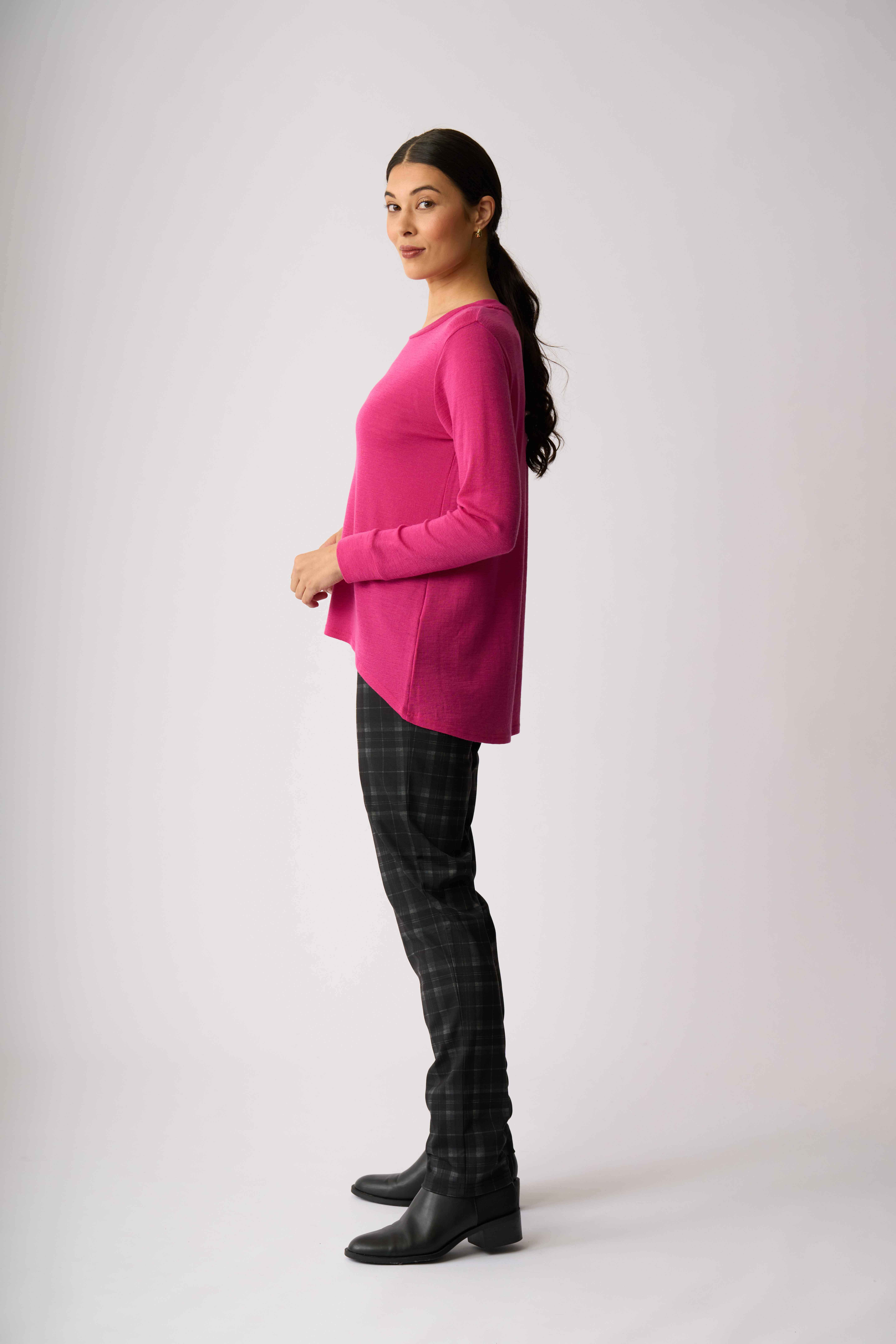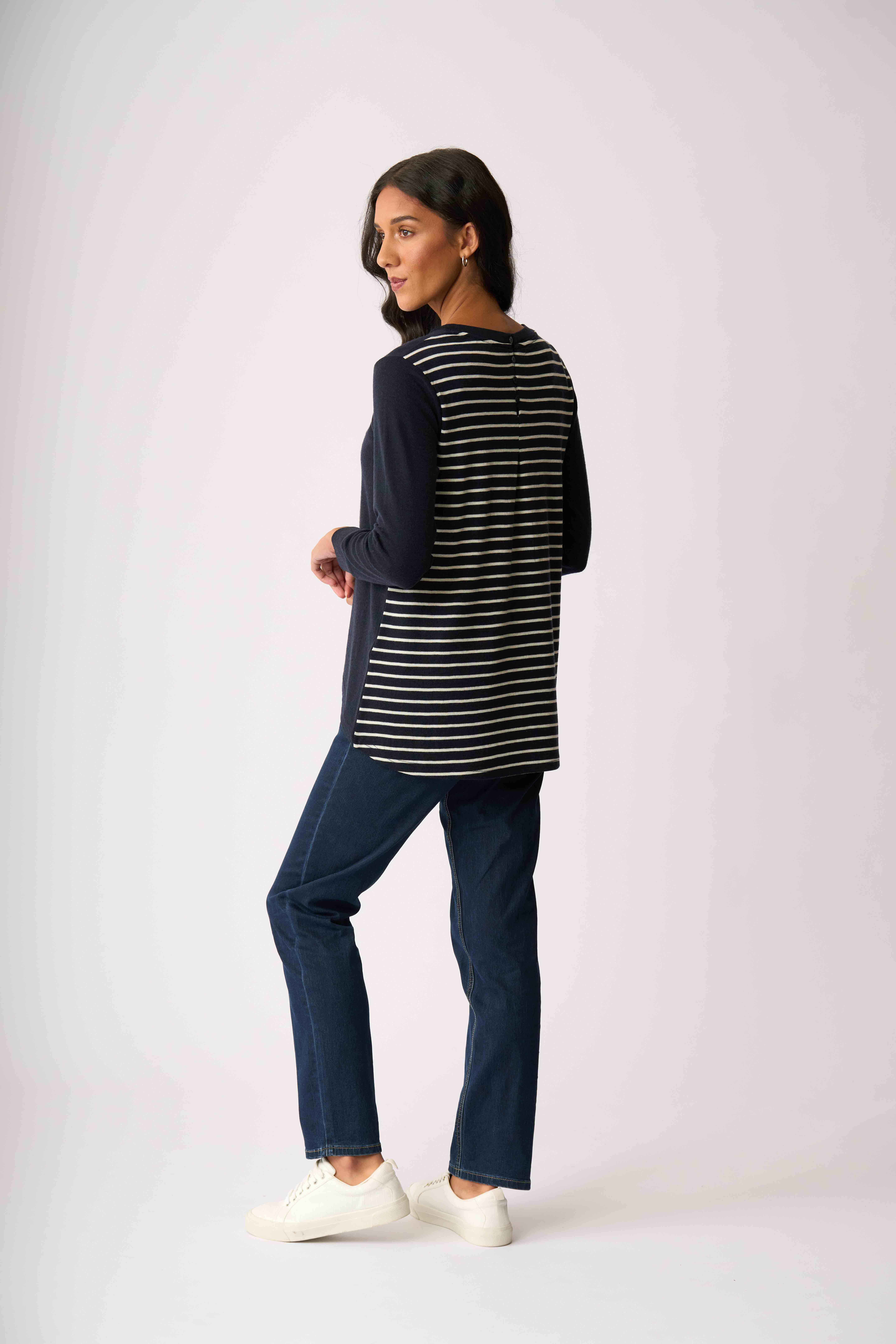 Scoop neck jumper with 4 button and loop closure on the centre backFull length sleevesCurved hemSwing fit throughout the body