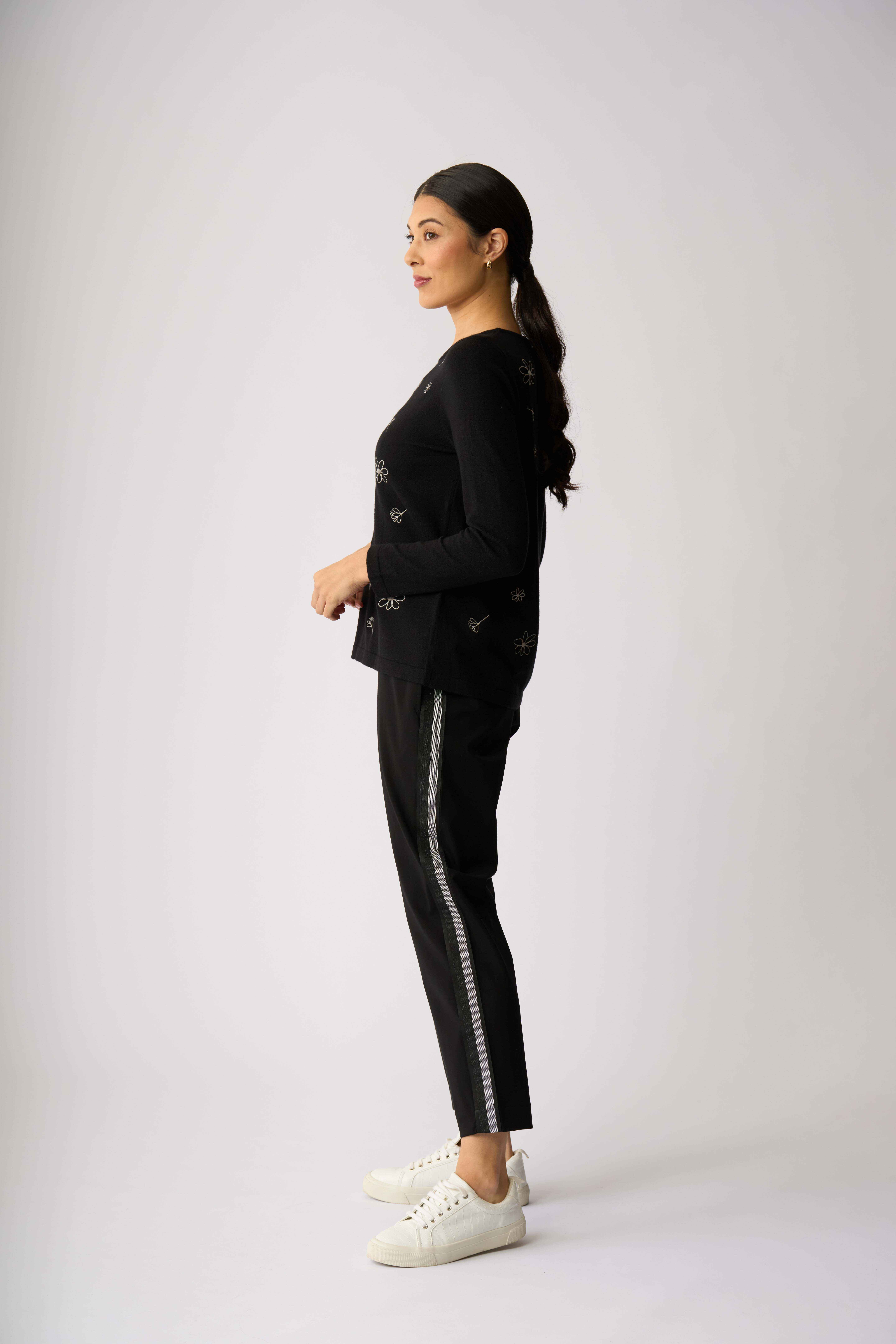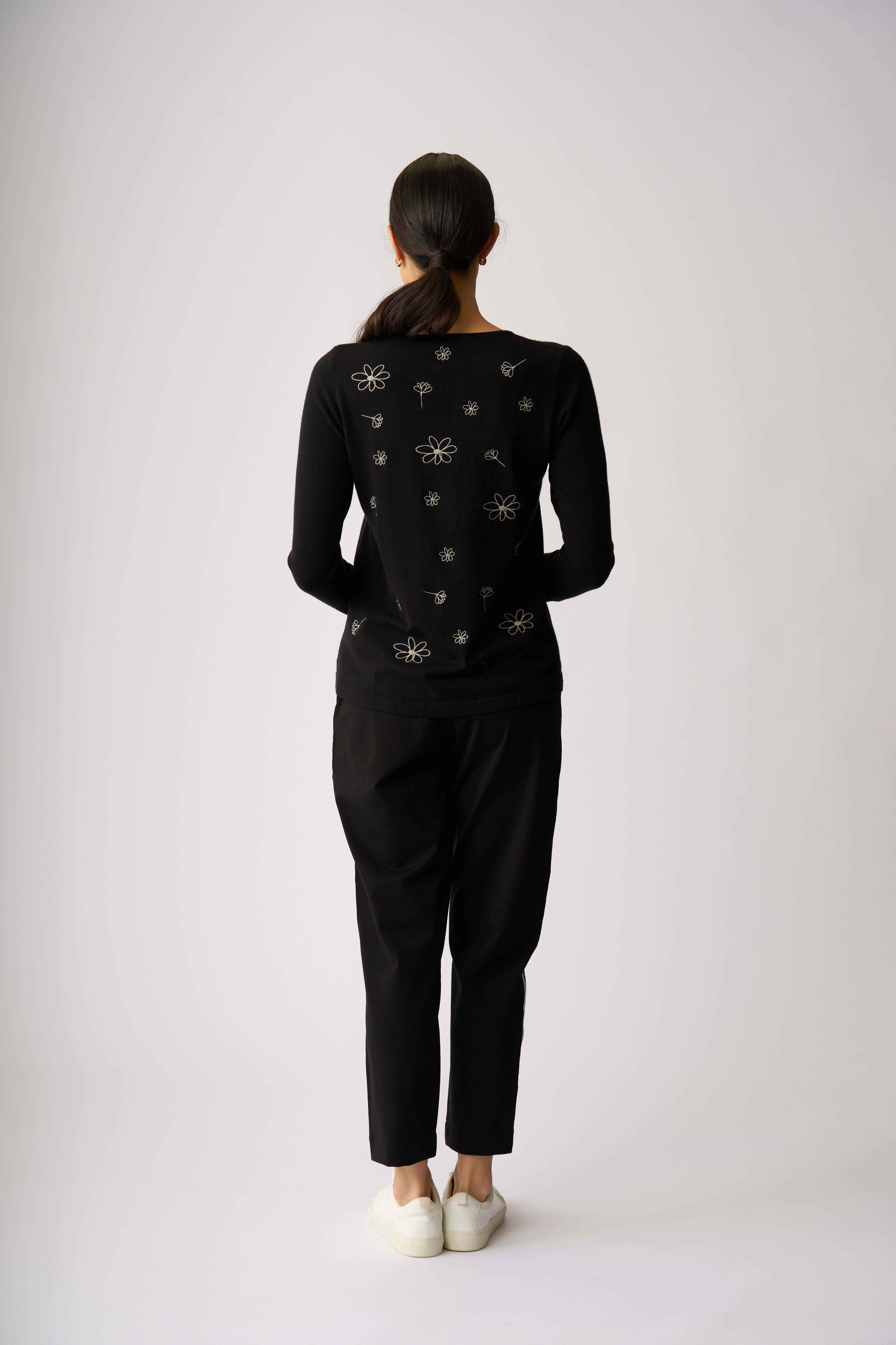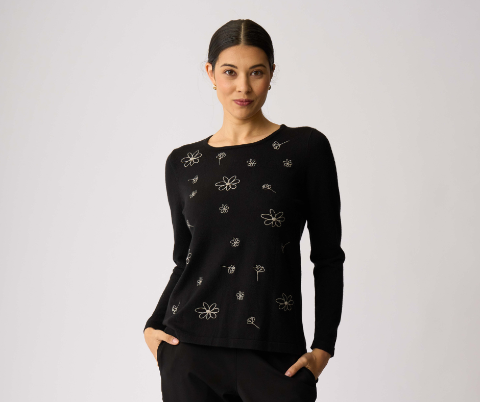 Sweater with embroidered flower designs on the front and back body.Scoop neck sweater with long sleevesEasy fit jumper, throw on and go